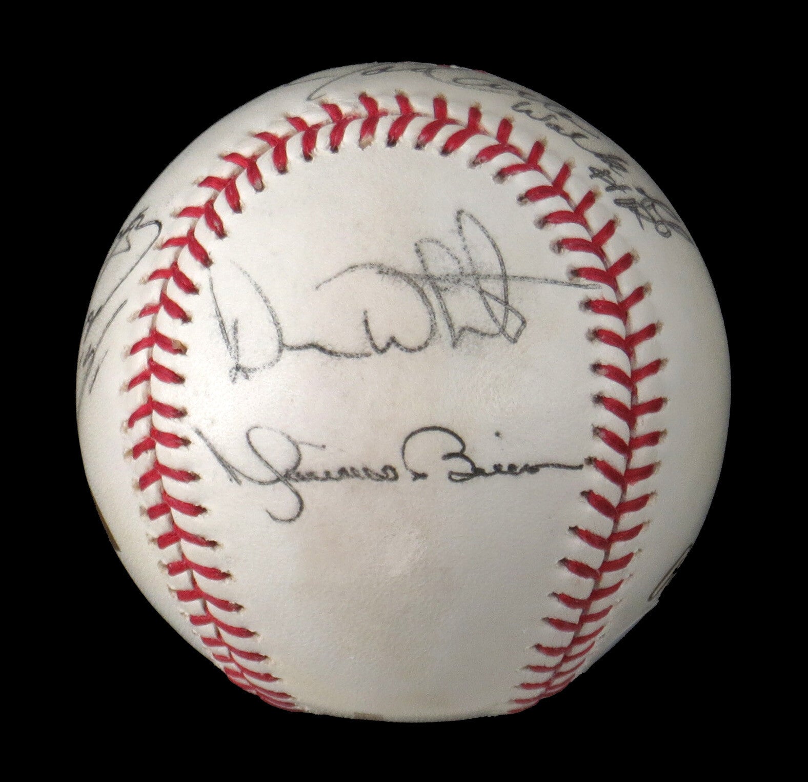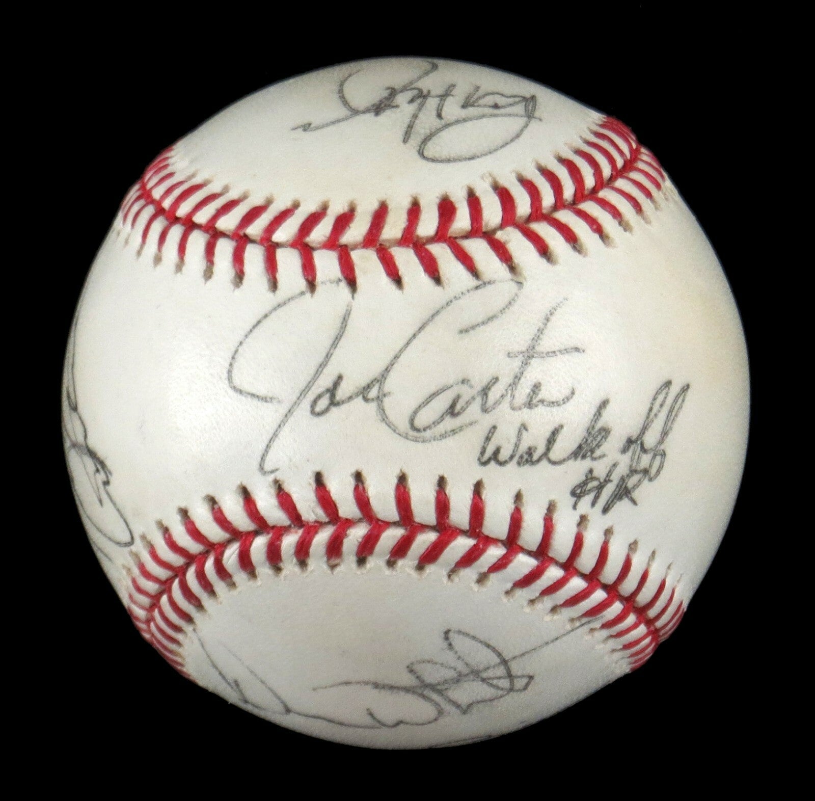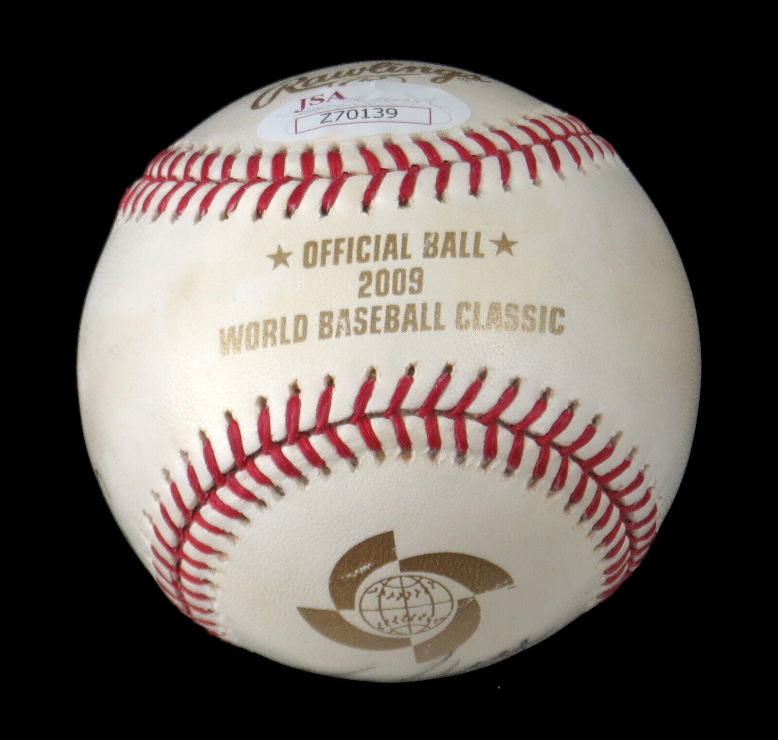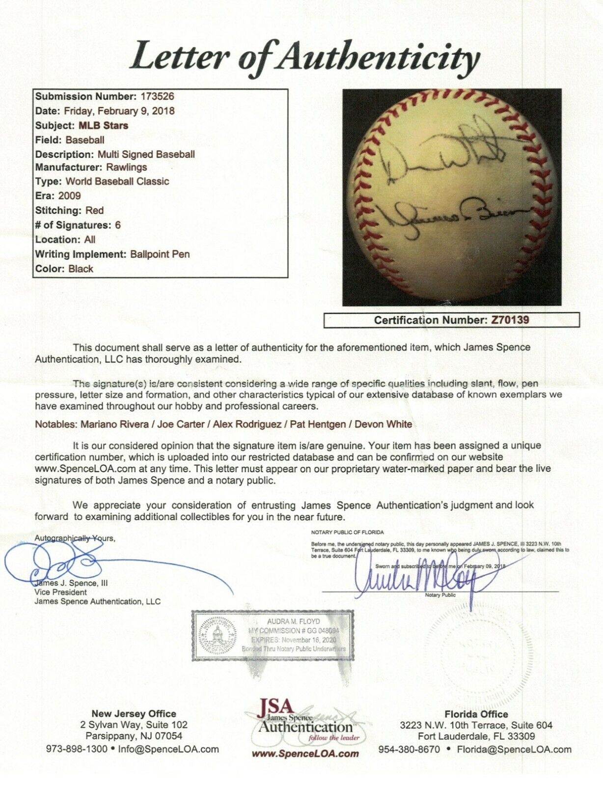 An unusual mix of major league ballplayers comes together with this multi-signed 2009 Official World Baseball Classic ball. Labeled in gold, this ball hosts (6) autographs , with: Joe Carter with "Walk Off HR" inscription on the sweet spot; Pat Hentgen on the north panel; Devon White and Mariano Rivera on the south panel; and Alex Rodriguez and one undetermined autograph on the west panel. Full photo LOA from JSA.