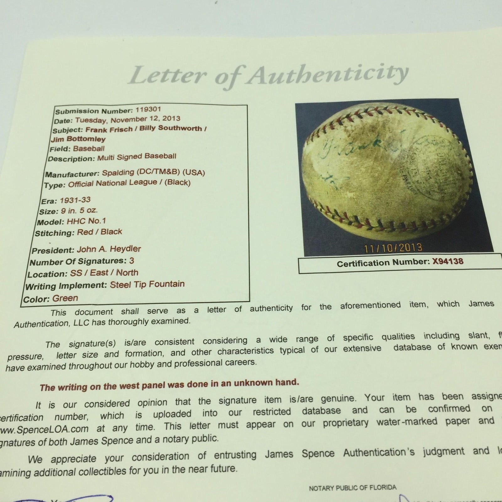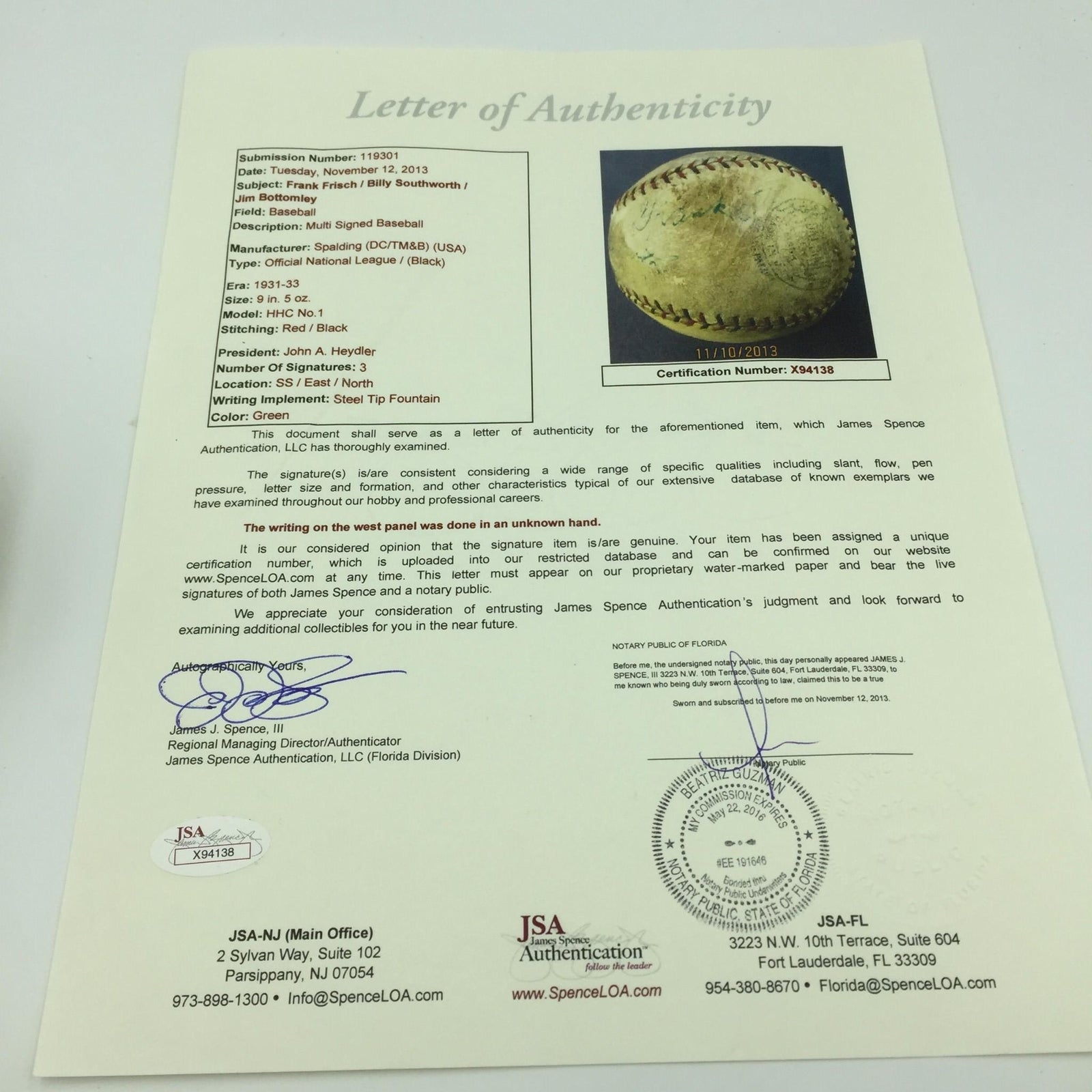 1931 Jim Bottomley, Frankie Frisch and Billy Southworth signed Official National League (John Heydler) Baseball.