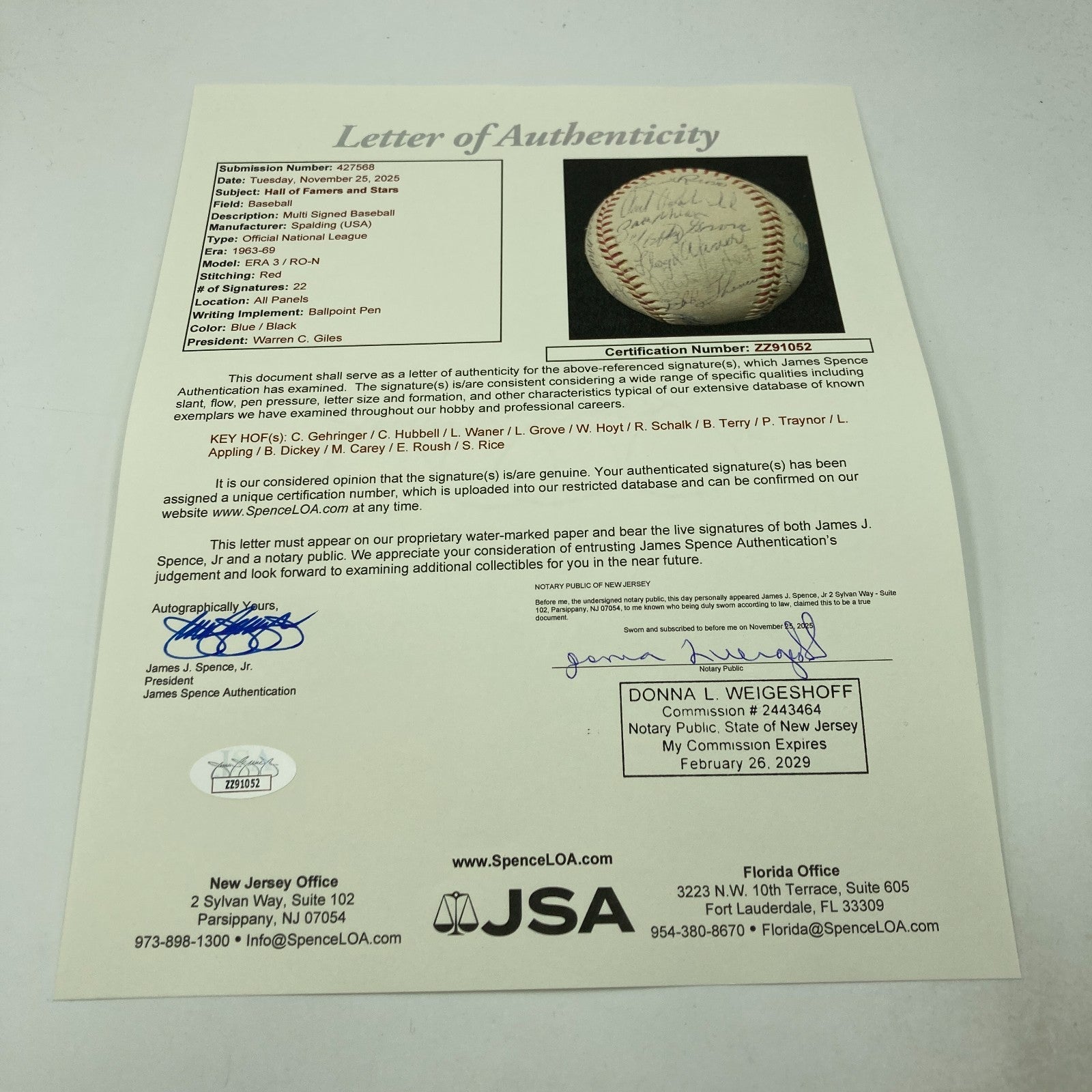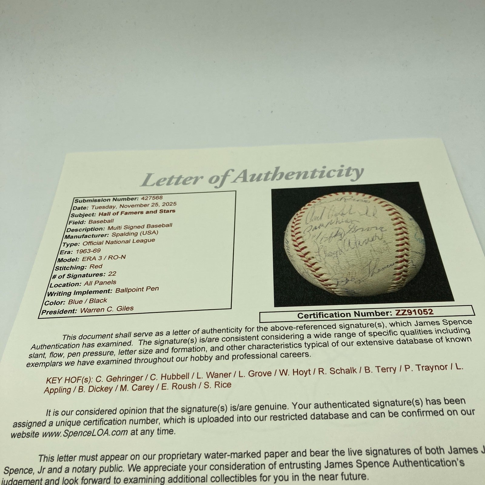 1950's HOF Multi Signed Baseball Lefty Grove Ray Schalk Pie Traynor Sam Rice JSA