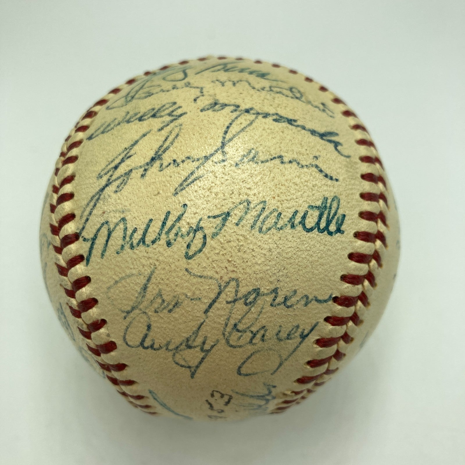 28 signatures with Mickey Mantle, Johnny Mize, Yogi Berra, Phil Rizzuto, Ralph Houk, Vic Raschi, Billy Martin and many others. Whitey Ford is clubhouse.