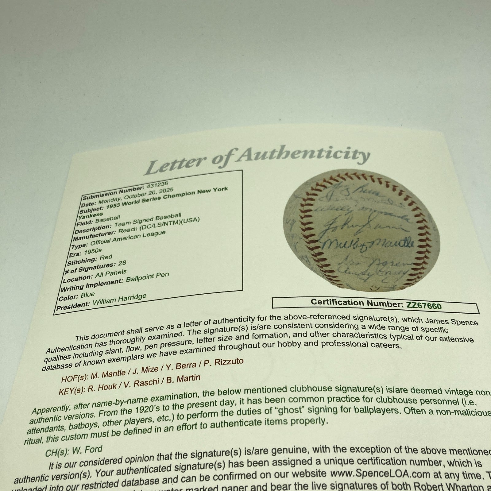 Beautiful 1953 New York Yankees World Series Champs Team Signed American League Harridge Baseball.