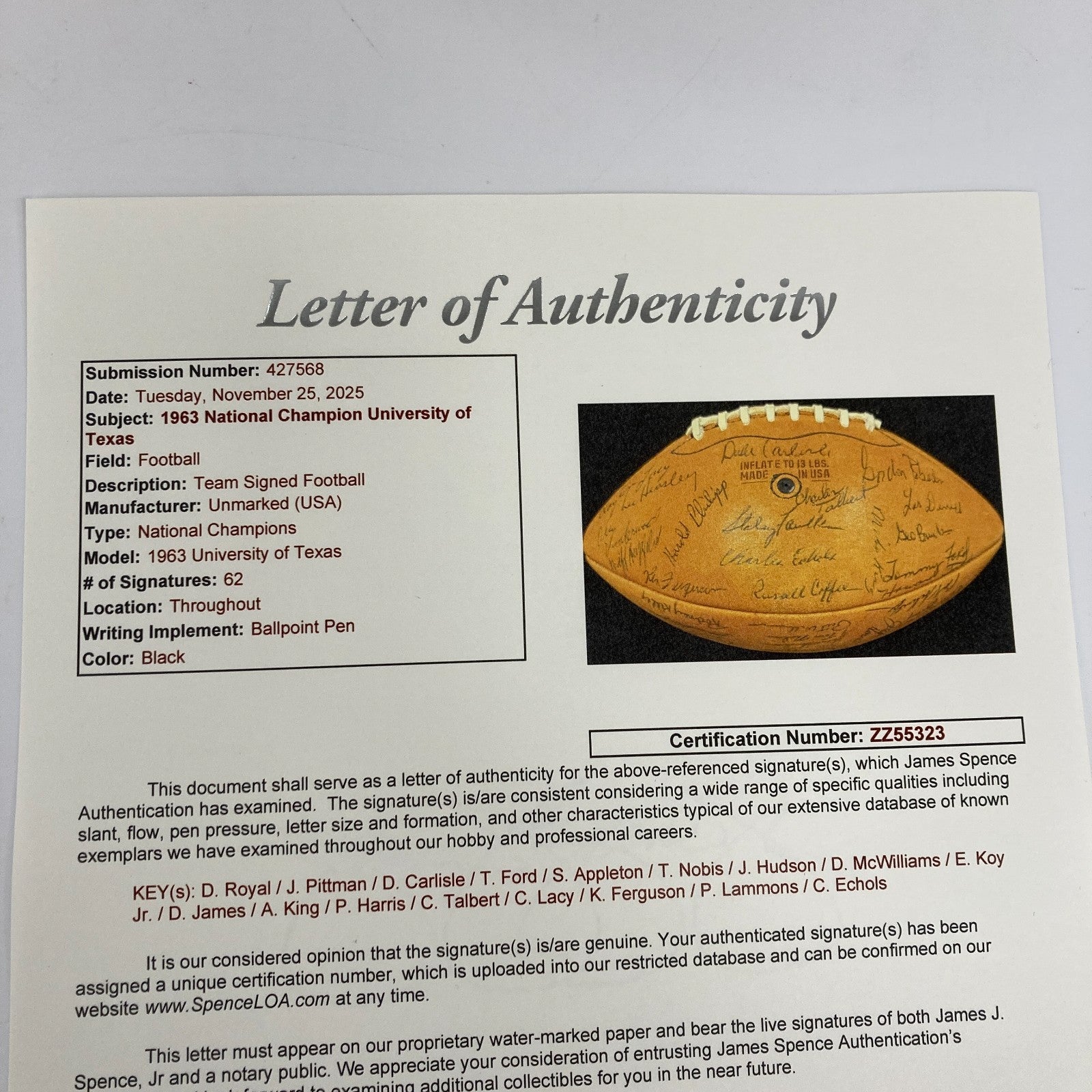 A 28-6 victory at the Cotton Bowl over future Dallas sporting icon Roger Staubach and his Navy squad completed the Longhorns' undefeated season and earned the school its first NCAA Football Championship. Presented is a stunning tan leather football that has been autographed by more than 60 members of that historic Texas team, most notably coach Darrell Royal, eventual Pro Football Hall of Fame Tommy Nobis, and All-Americans Scott Appleton and Tommy Ford. The ball exhibits only light handling wear and presents marvelously, with "National Champions University of Texas 1963" boldly stamped on one panel. A rare opportunity to "hook" a special keepsake representing the beginning of a great Texas football tradition of excellence. Comes with full letter JSA COA.