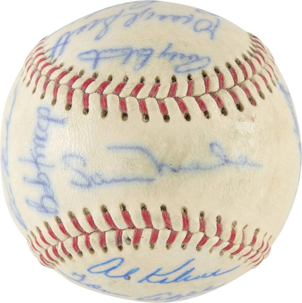 Official American League (Cronin) ball signed in blue ink by the following twenty-six members of the 1965 American League All-Star team: Yastrzemski, Oliva, B. Robinson, Lopez (Mgr., sweet spot), Battey, Pappas, Howard, Stottlemyre, Lee, Grant, Pepitone, Hall, Colavito, Gutteridge (coach), Skowron, Richardson, Mele (coach), Alvis, Versalles (on ball label), McDowell (on ball label), Davalillo, O'Donoghue, Fisher, Mantilla, Richert, and one other.