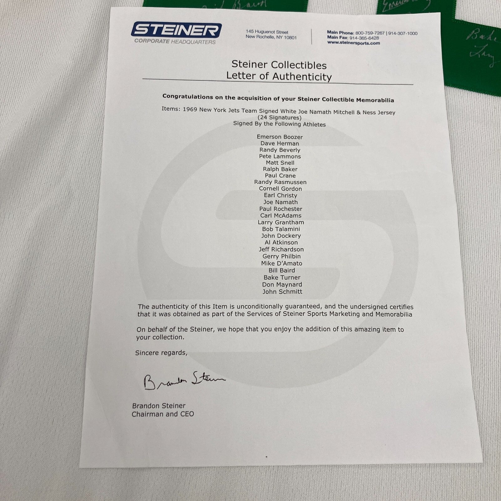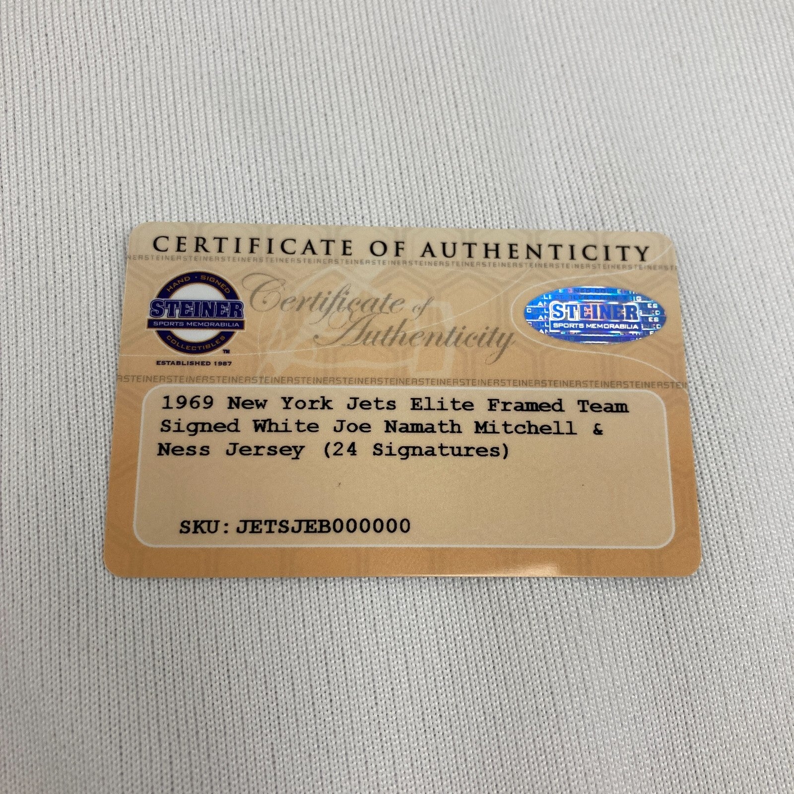 Beautiful 1969 New York Jets Super Bowl Champs Team Signed Joe Namath Mitchell & Ness Authentic Jersey Steiner COA. 24 signatures.