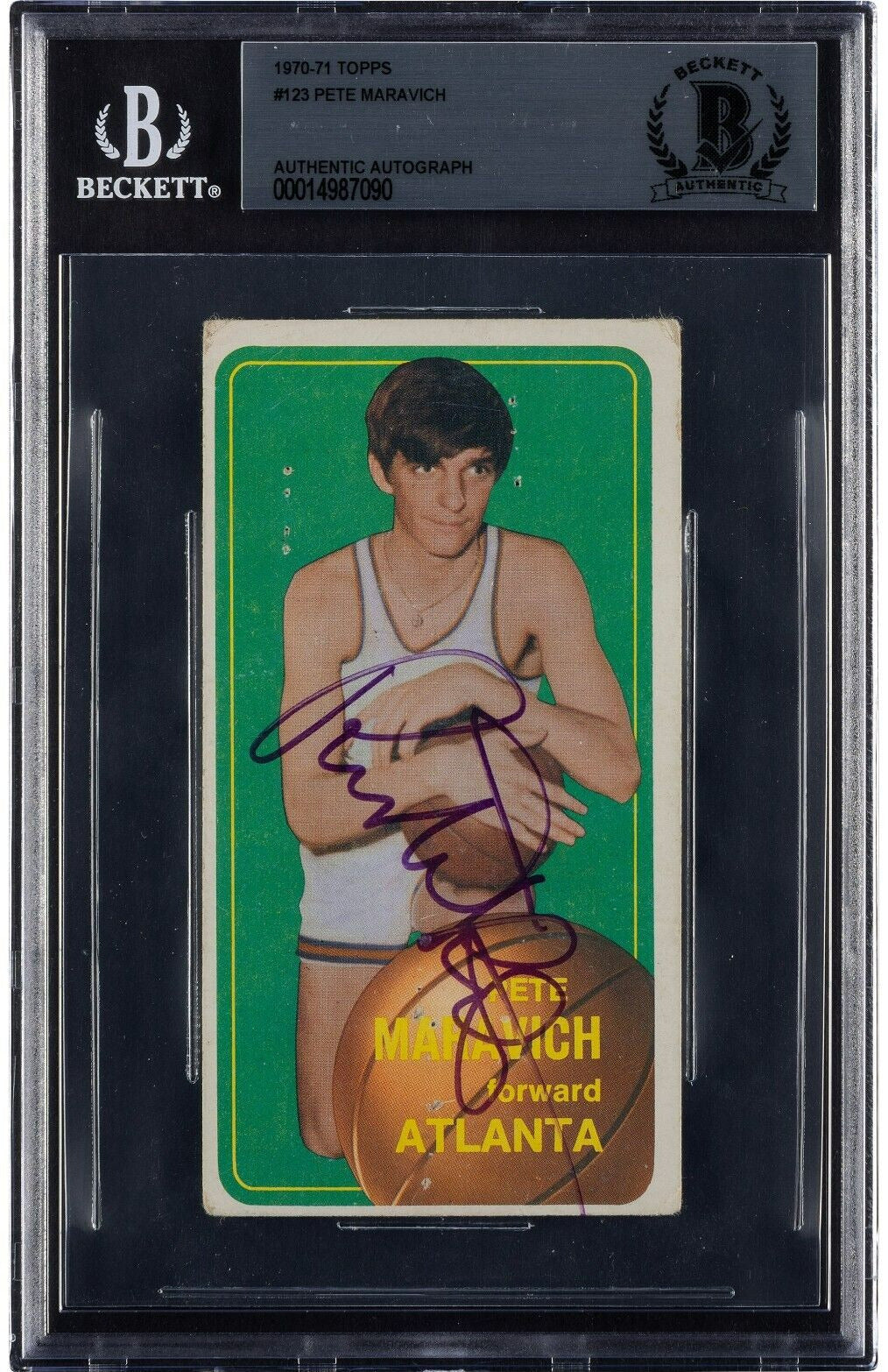 One of the most beloved figures in post-war basketball history made his trading card debut in Topps' 1970 "Tall Boys" issue taking card #123 as his own. Here we present a coveted specimen featuring a baby-faced Pistol Pete with rich colors and precise registration. Large signature signed in black marker. Certified and encapsulated Beckett BAS Authentic. There are very few signed Maravich rookie cards known to exist. There are only 8 in the PSA Pop Report.