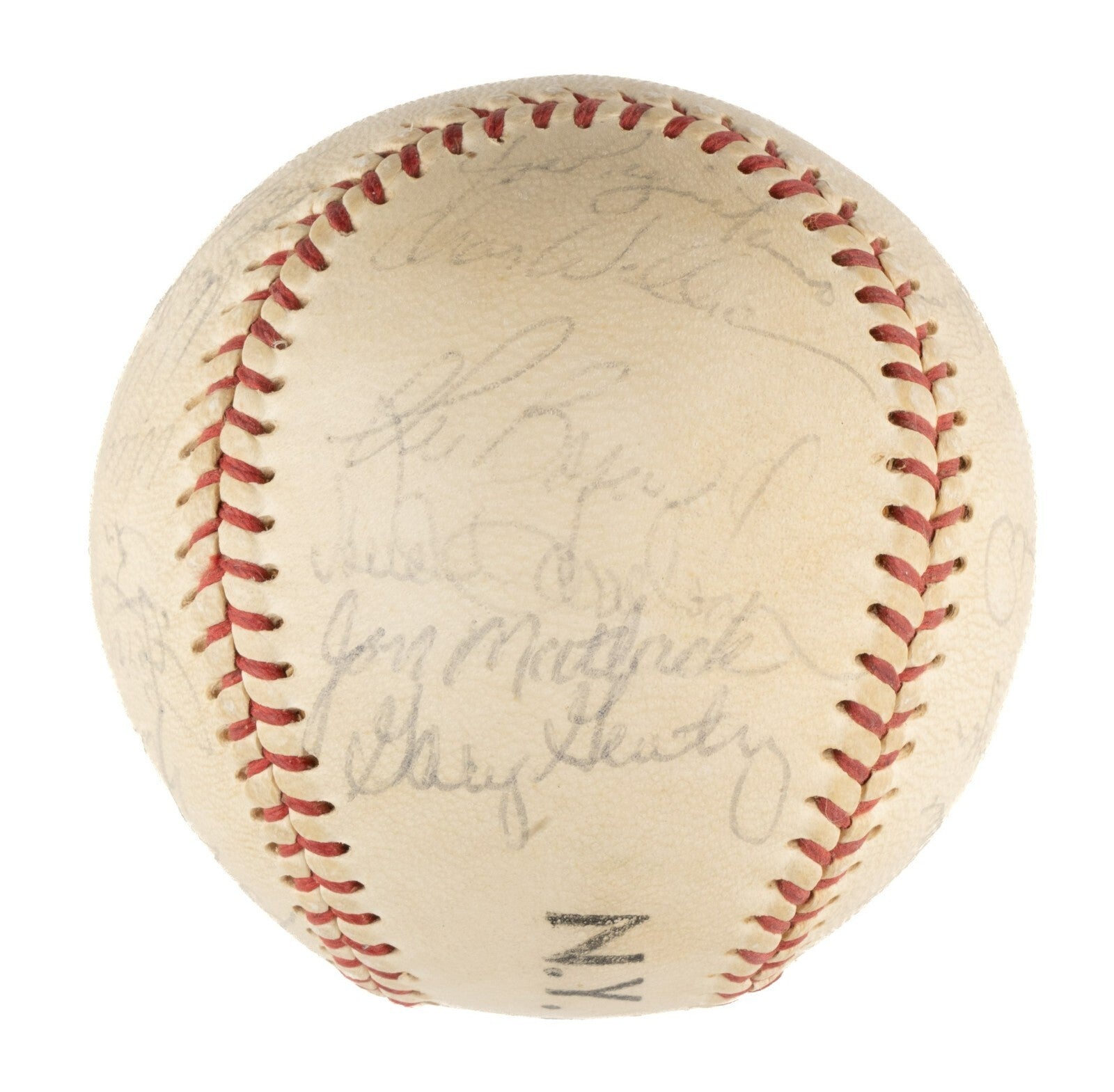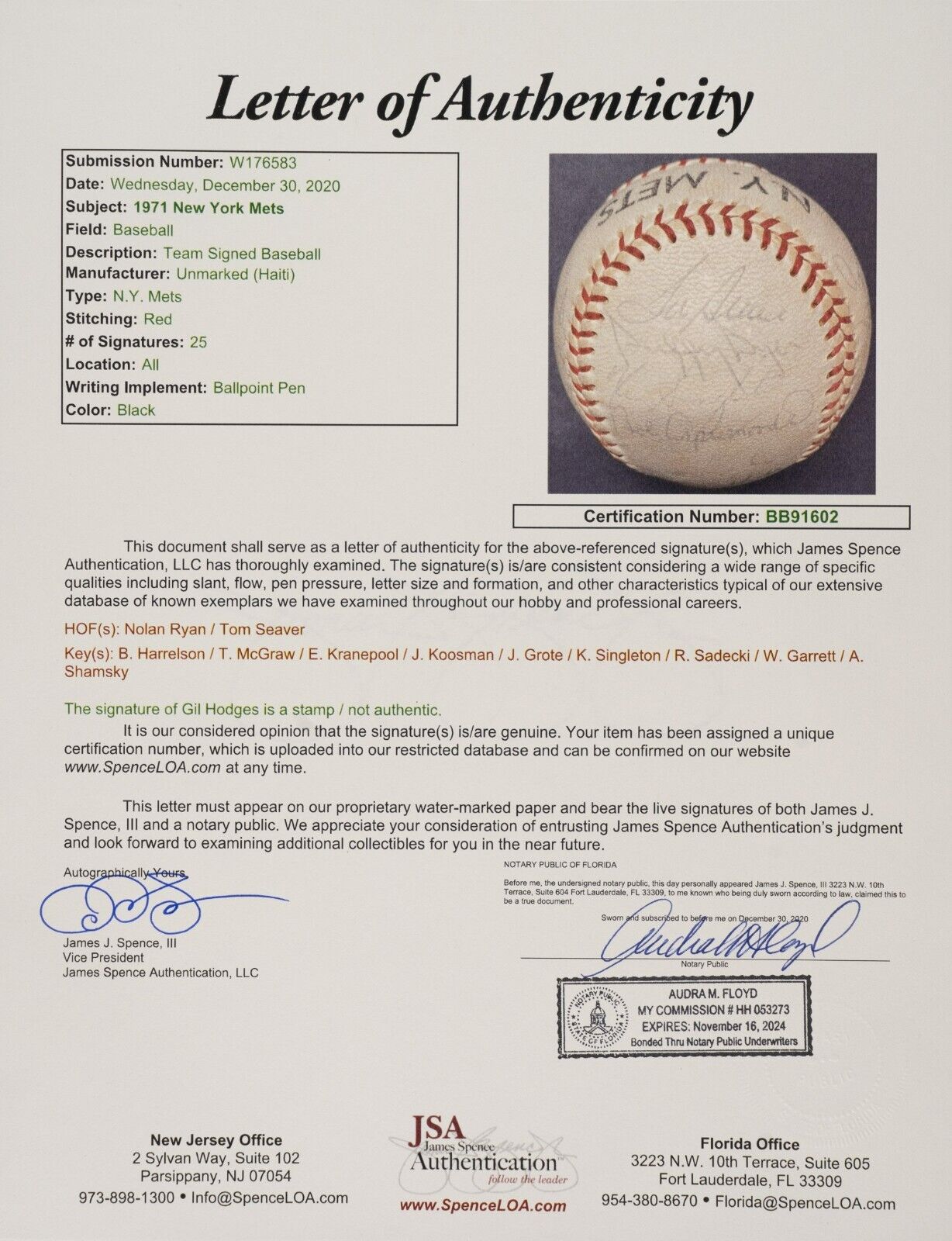 Presented is a "N. Y. METS" souvenir ball signed in black ink by twenty-five members of the 1971 New York Mets, including Ryan, Seaver, Harrelson, McGraw, Kranepool, Garrett, Koosman, Grote, Singleton, Sadecki, Shamsky, McAndrew, Pignatano (coach), Boswell, Matlack, Gentry, Dyer, Aspromonte, Hahn, and Yost (coach). According to JSA, the faded signature of Gil Hodges on the sweet spot has been deemed a stamp and not authentic. The ball has very light toning and is in Excellent condition overall. Full LOA from James Spence/JSA.