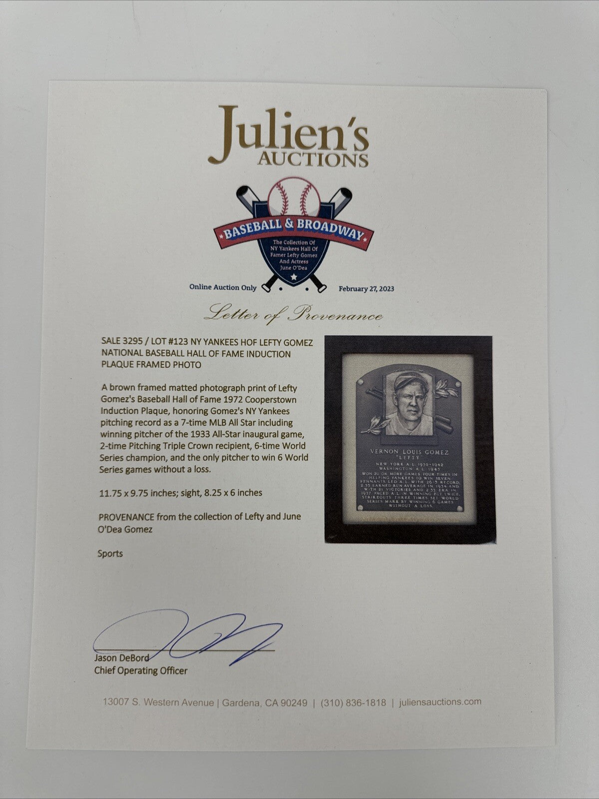 Proudly presented here is the foremost symbol of Lefty Gomez's athletic immortality that exists in private hands, the personal edition of his Baseball Hall of Fame plaque, presented to him on August 7, 1972.