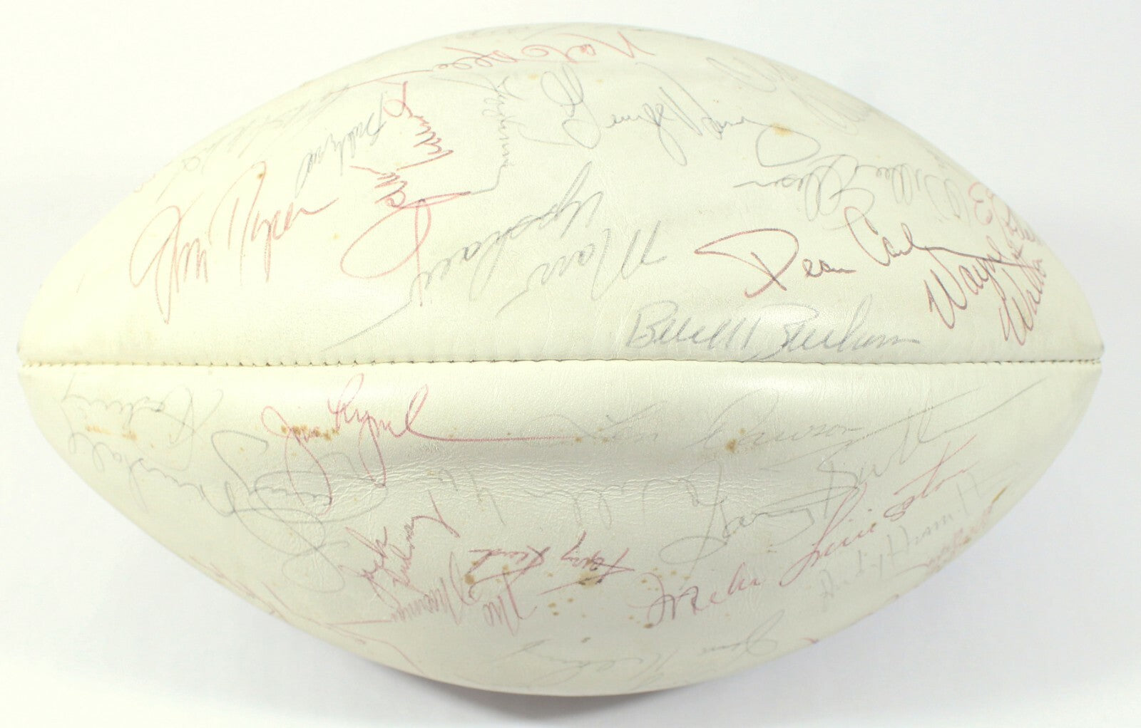 Outstanding Wilson NFL (Rozelle) football, signed by 44 members of the 1973 Kansas City Chiefs. The Chiefs went 7-5-2 behind coach Hank Stram, with a roster that included six future Hall of Famers, all of whom have signed this ball. All the signatures have been applied to the white panels in black ballpoint pen, most of which are bold and legible against the white background. Signatures include Hall of Famers Bobby Bell, Buck Buchanan, Len Dawson, Willie Lanier, Jan Stenerud and Emmitt Thomas. Additional stars include Nate Allen, Pete Beathard, Jim Kearney, Otis Taylor, Jim Tyere, Ed Podolak, George Seals, Marvin Upshaw, and more. Very attractive football, containing the signatures of six Hall of Famers. Full LOA from James Spence Authentication.