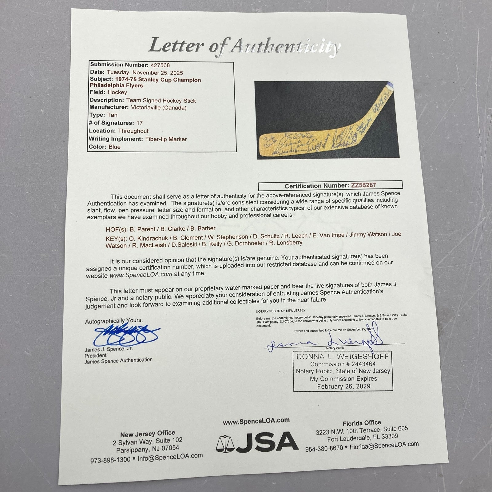 1974-1975 Philadelphia Flyers Stanley Cups Champs Team Signed Hockey Stick JSA