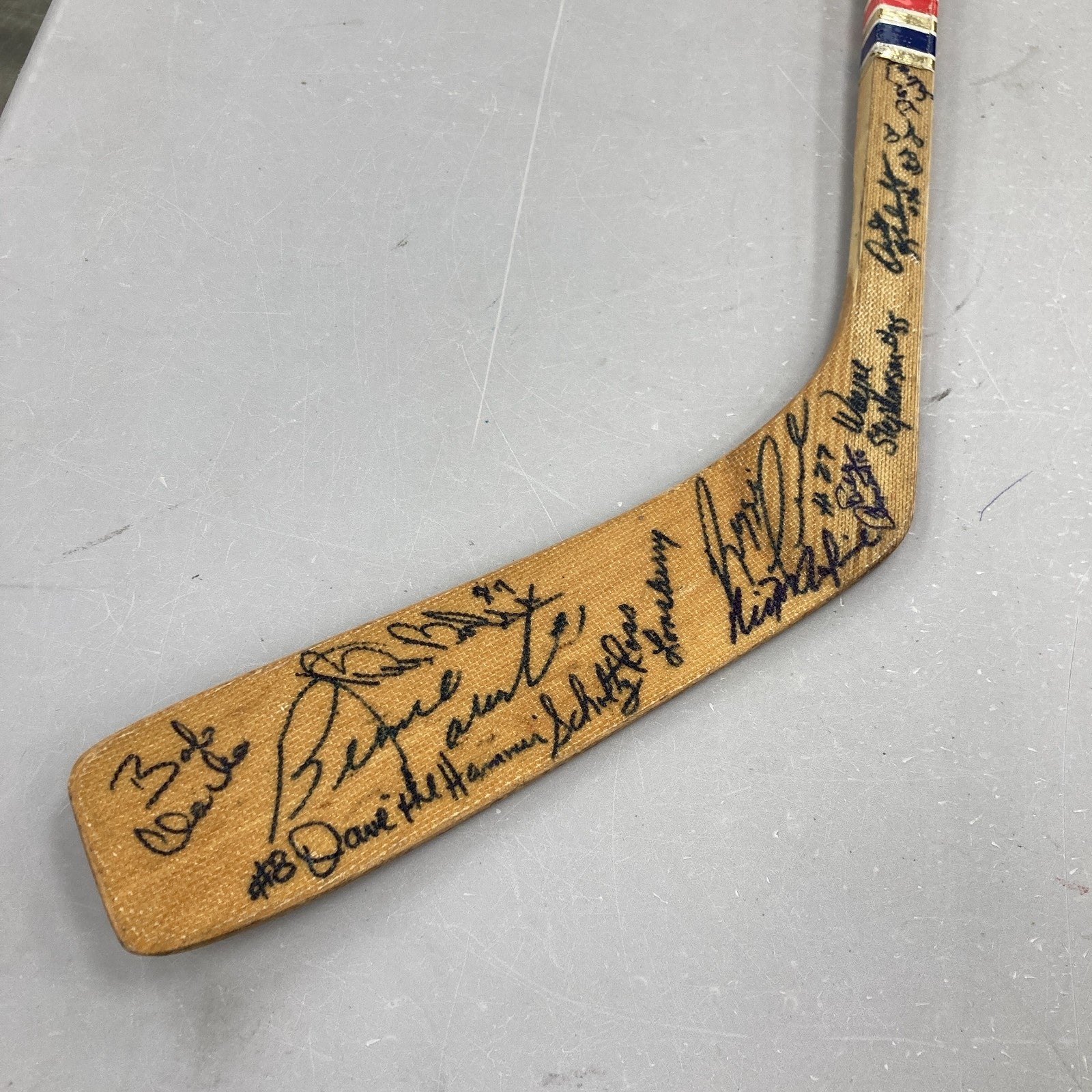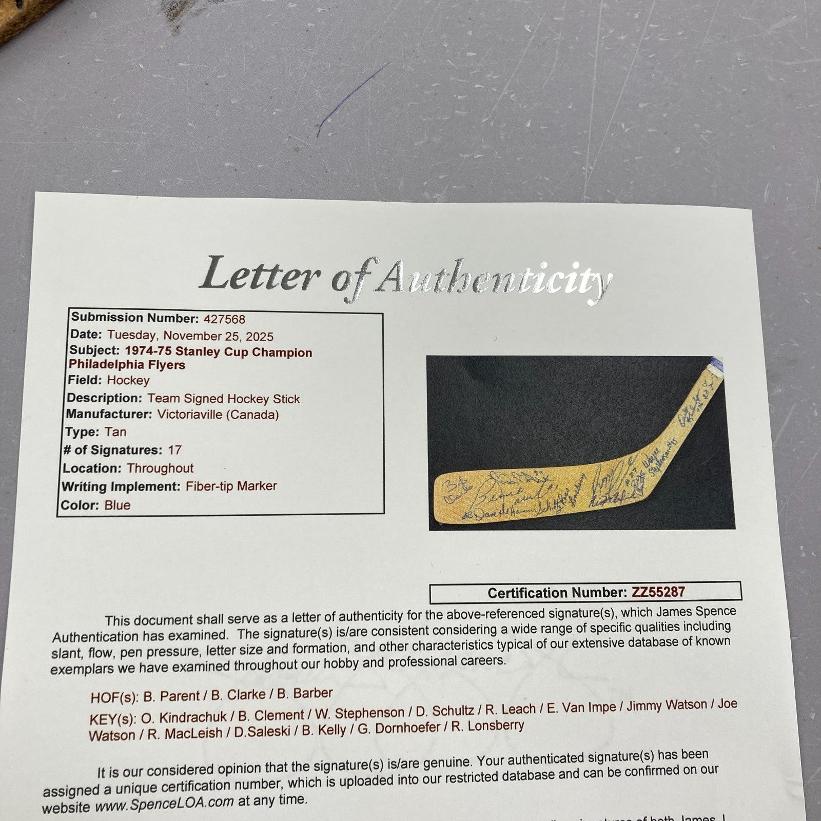 Victoriaville 4525 Wayne Cashman model stick signed by (16) including Bernie Parent, Bob Clarke, Bill Barber, Rick MacLeish, Reggie Leach, Ross Lonsberry, Gary Dornhoefer, Bill Clement, Orest Kindrachuk, Bob "Hound" Kelly, Don Saleski, Dave "The Hammer" Schultz, Jimmy Watson, Joe Watson, Ed Van Impe, and Wayne Stephenson.