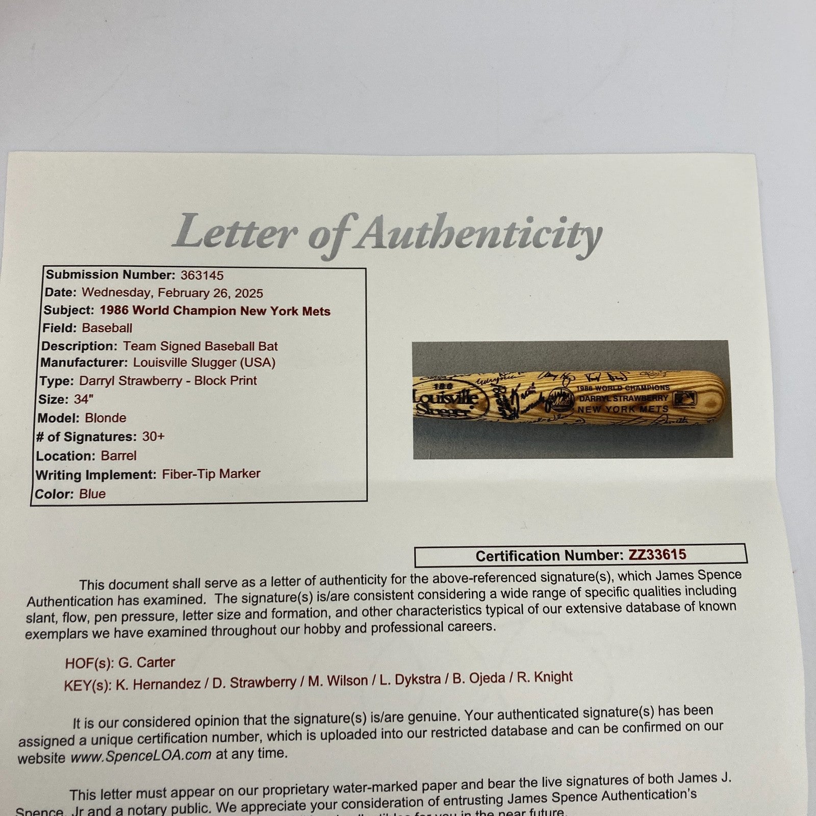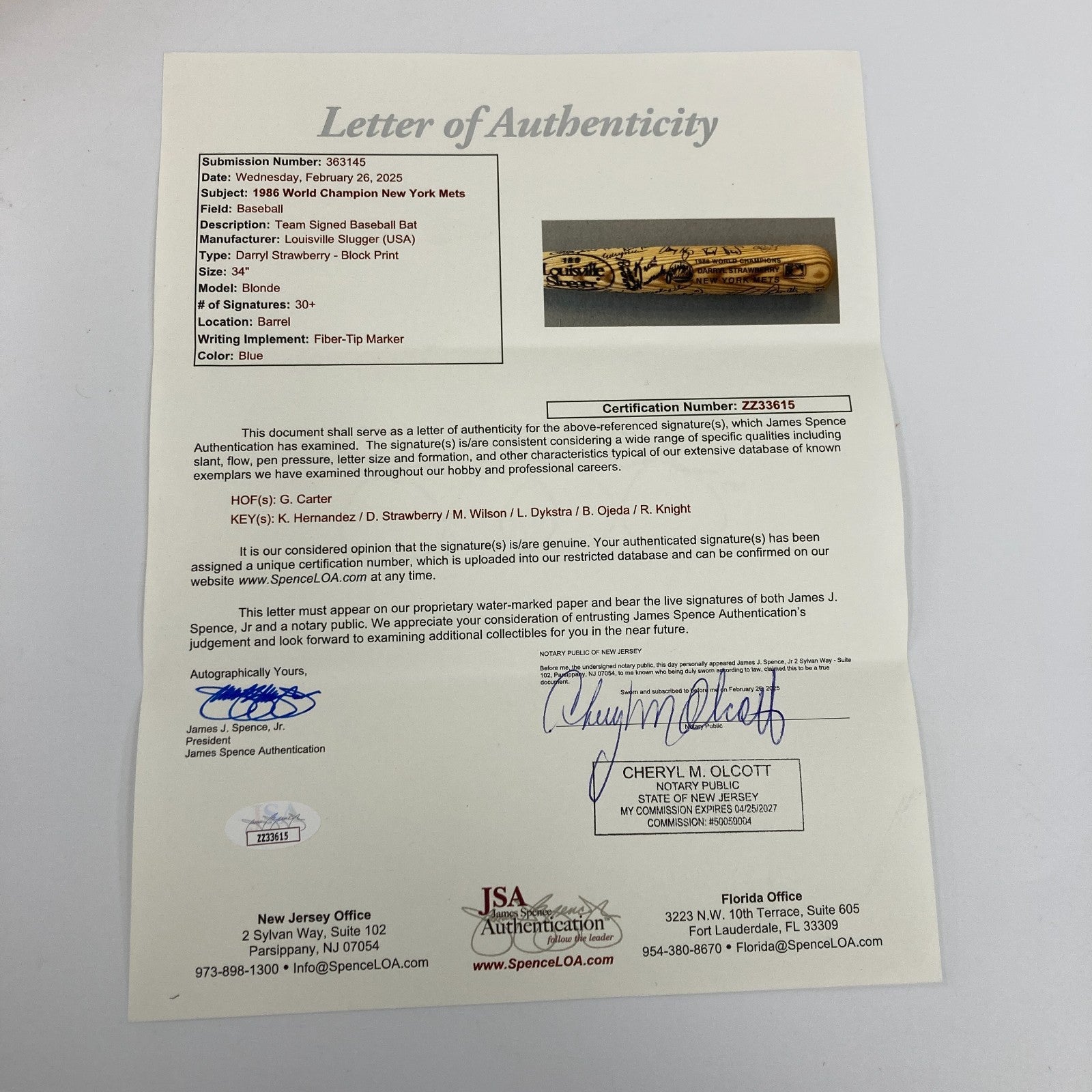 1986 World Champions New York Mets Louisville Slugger Baseball Bat, Autographed by over 30 players. All the key players from the 1986 World Series Championship Team, have signed this bat. Players such as, Gary Carter, Keith Hernandez, Darryl Strawberry, Mookie Wilson, Lenny Dykstra, Bobby Ojeda and Ray Knight. This is a rare piece of memorabilia, and a must have for any baseball collector.
