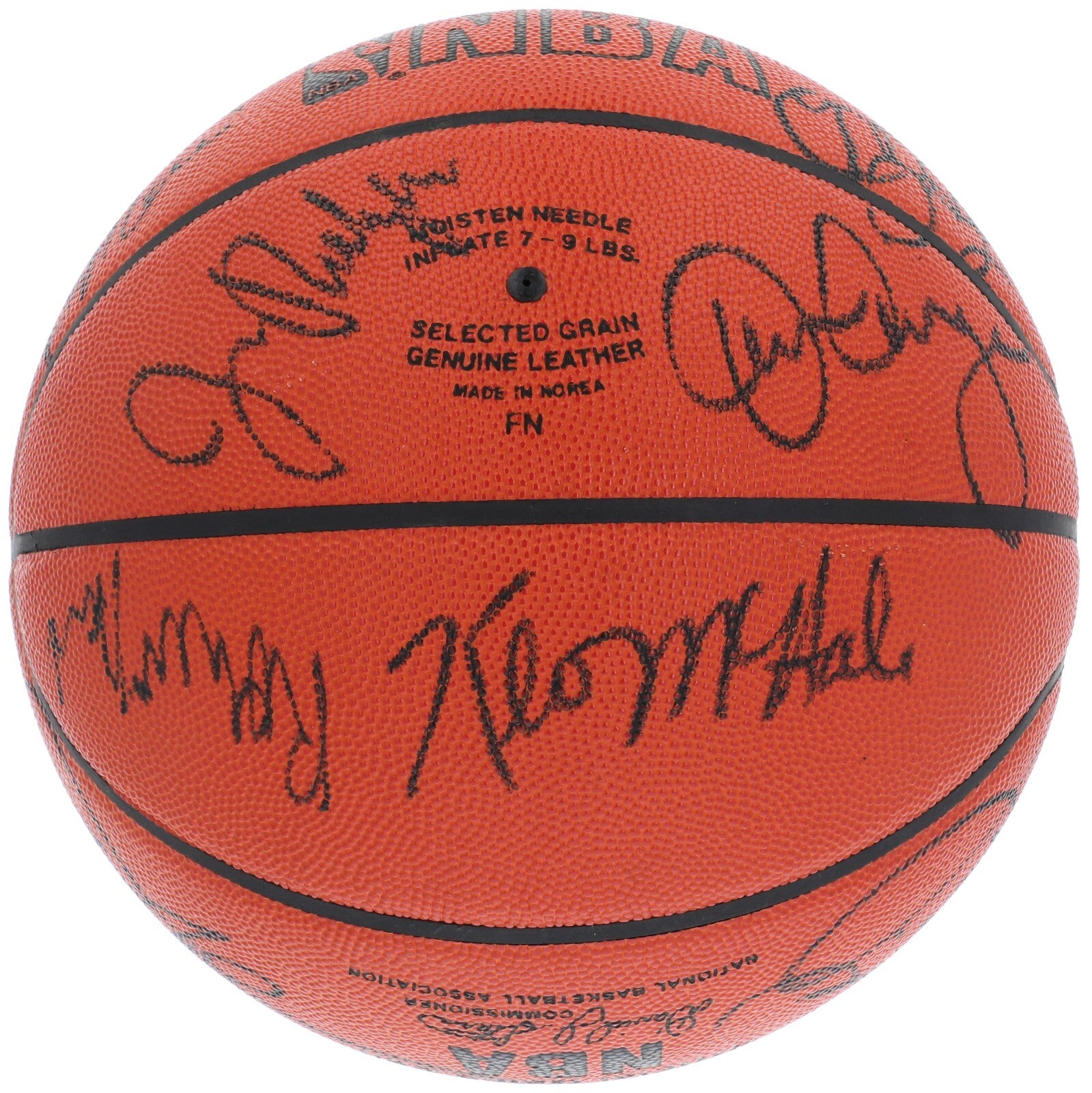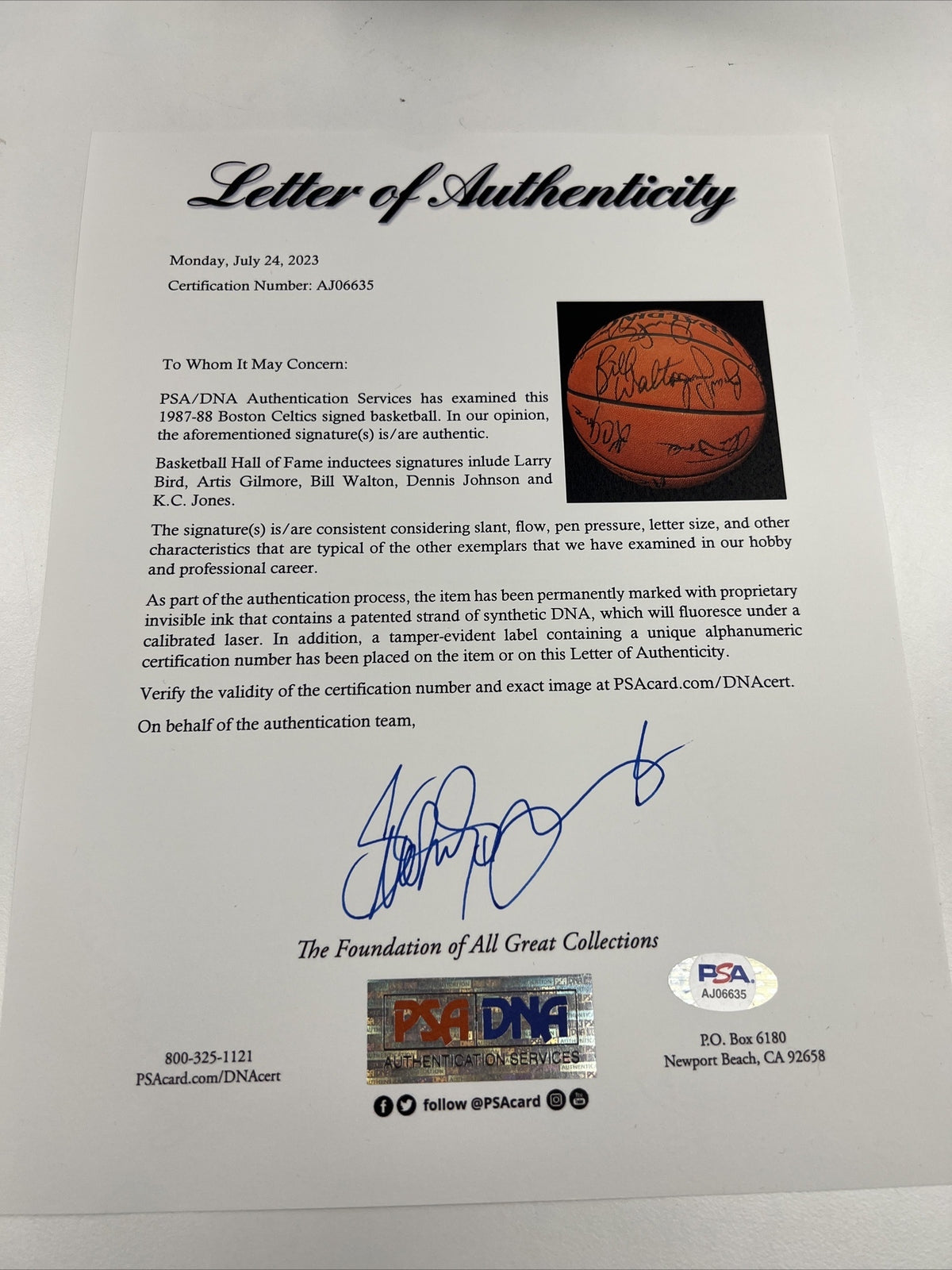 Presented is a Spalding official NBA game basketball signed by members of the 1987-88 Boston Celtics dynasty. Significant figures from this illustrious era of Celtics basketball who have contributed black marker signatures to the ball include Larry Bird, Dennis Johnson, Bill Walton, Kevin McHale, head coach K.C. Jones, assistant coach Chris Ford, Danny Ainge, and more. These players and coaches presided over a significant period in Celtics history, when the team's cross-coast rivalry with the Los Angeles Lakers was at its height; the fabled Boston franchise captured three NBA finals titles during the 1980s, their most in any decade except for the 1960s, when they won the Finals in each year with the exception of 1967. A stellar collection of signatures from one of the most star-studded basketball teams in NBA history, the ball displays a wholly favorable manner of appearance. The ball comes with an LOA from PSA/DNA for the signatures.