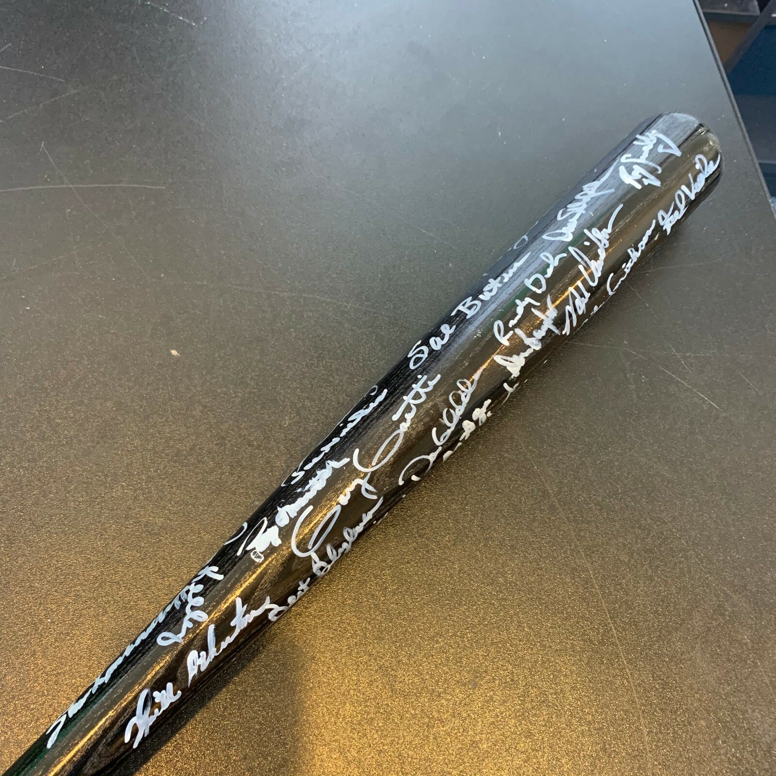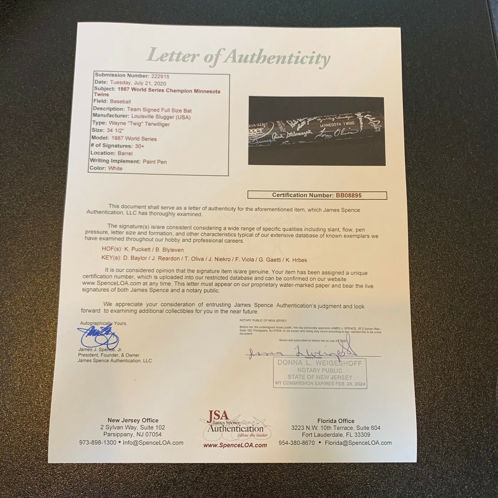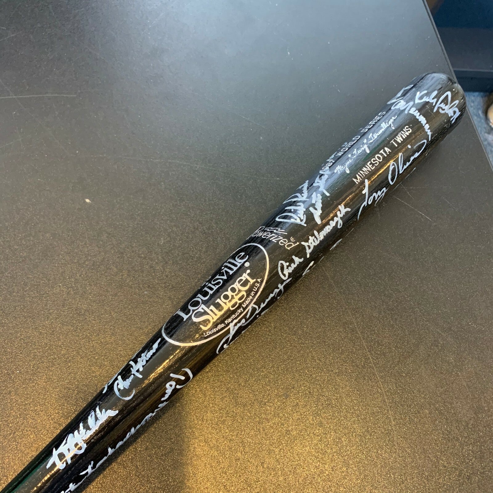 34.5", 30.5 ounce Louisville Slugger which was issued to Minnesota Twins first base coach Wayne Terwilliger for the 1987 World Series & has been signed by over 25 members of the World Series Champions including Terwilliger, Tom Kelly, Kirby Puckett, Bert Blyleven, Joe Niekro, Gene Larkin, Steve Lombardozzi, Gary Gaetti, Dan Gladden, Tom Brunansky, Jeff Reardon, Al Newman, Don Baylor, Tony Oliva & many more. Full letter COA from JSA.