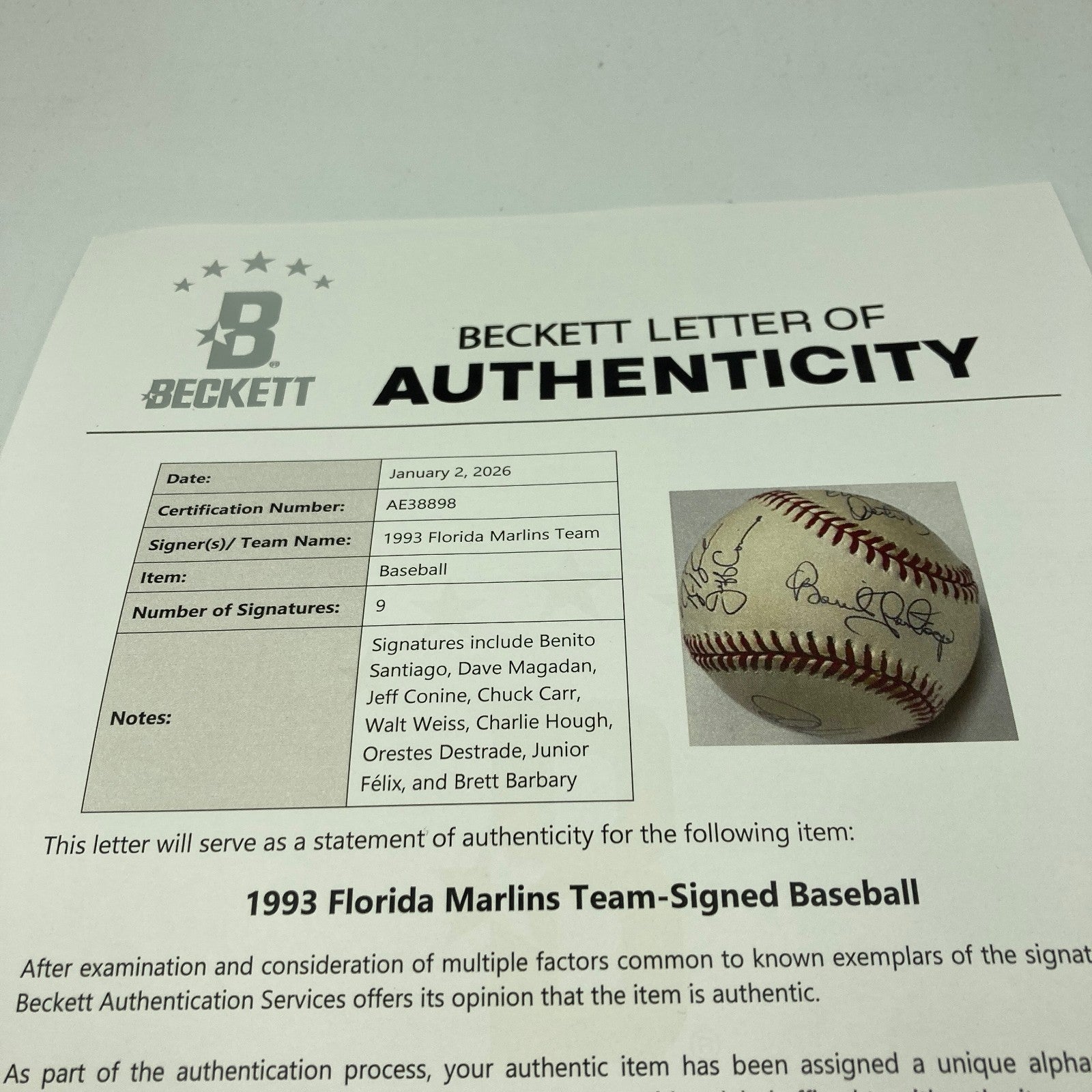 Click or scroll to zoom Tap or pinch to zoom Click or scroll to zoom Tap or pinch to zoom Click or scroll to zoom Tap or pinch to zoom Click or scroll to zoom Tap or pinch to zoom Click or scroll to zoom Tap or pinch to zoom Click or scroll to zoom Tap or pinch to zoom Click or scroll to zoom Tap or pinch to zoom Click or scroll to zoom Tap or pinch to zoom 1993 Florida Marlins Inaugural First Season Team Signed Baseball Beckett COA $199.00 1 2 3 4 5 6 7 8 9 10+ Quantity Quantity Add to cart This item is a recurring or deferred purchase. By continuing, I agree to the cancellation policy and authorize you to charge my payment method at the prices, frequency and dates listed on this page until my order is fulfilled or I cancel, if permitted. 1993 Florida Marlins Inaugural First Season Team Signed Baseball.Comes with full letter Beckett COA. D#79