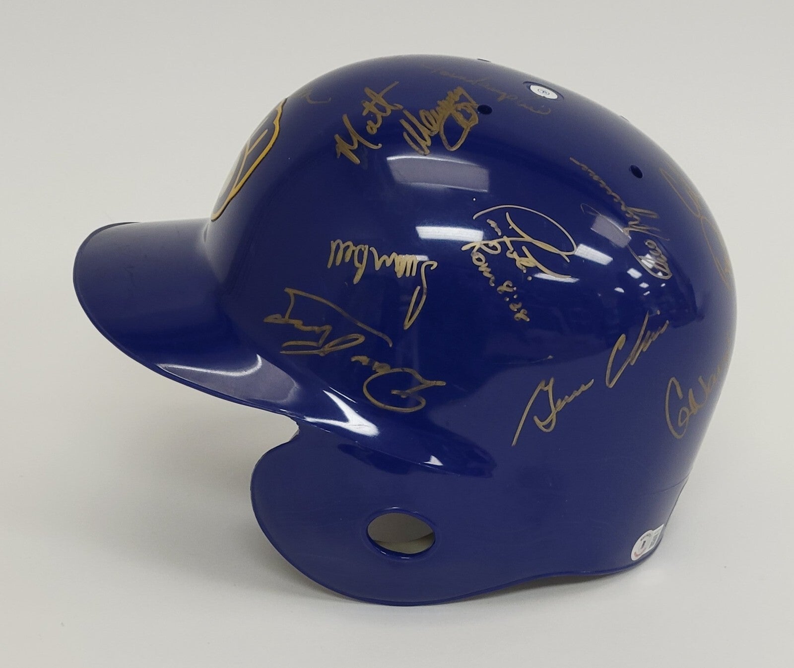 This authentic Milwaukee Brewers batting helmet has been personally signed by 25 members of the 1993 team. Signatures include Robin Yount, Pat Listach, Greg Vaughn, Phil Garner, Gene Clines, Tim Foli, Tim Lampkin, Duffy Dyer, Cal Eldred, Jaime Navarro, Mike Fetters, Carlos Maldonado, Doug Henry, Jesse Orosco, Daniel Rowe, Juan Bell, Matt Maysey, Dave Nilsson, John Jaha and Teddy Higuera. Beckett LOA