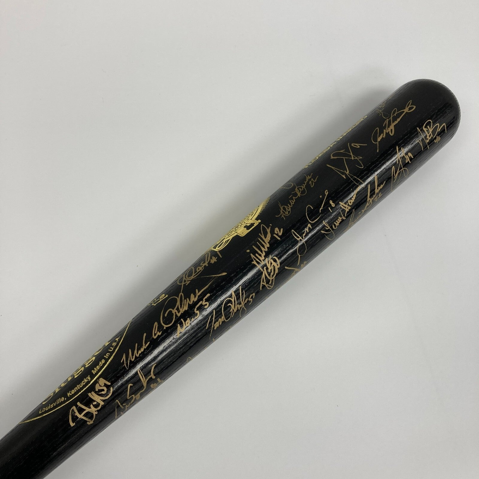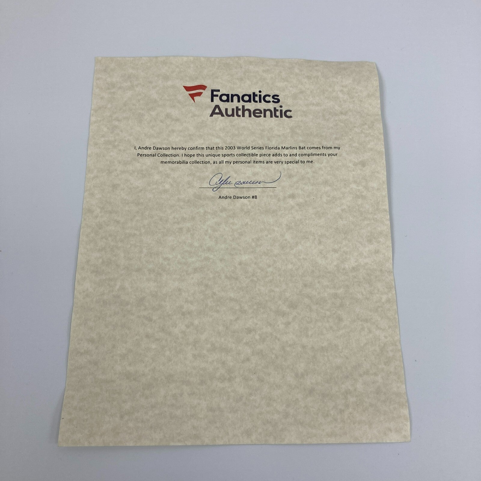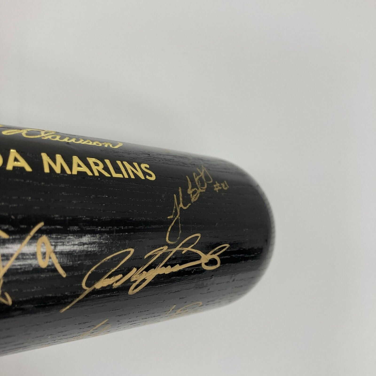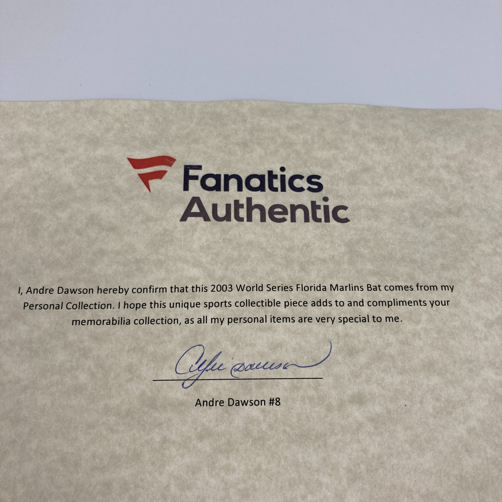 This Louisville Slugger bat features gold paint pen signatures the 2003 World Champion Florida Marlins all over the barrel. The bat arrives with a letter on Fanatics letterhead confirming the bat is from Andre Dawson's personal collection and signed by Dawson. The barrel reads "2003 World Series, Andre Dawson, Florida Marlins" and has the World Series logo. Signatures include: Miguel Cabrera, Juan Encarnacion, Ivan Rodriguez, Juan Pierre, Mike Lowell, Alex Gonzalez, Todd Hollandsworth, Derrek Lee, Luis Castillo, Jeff Conine, Carl Pavano, Dontrelle Willis, Josh Beckett, AJ Burnett, Brad Penny and more. Certified by JSA with their Sticker. Does not have JSA letter.