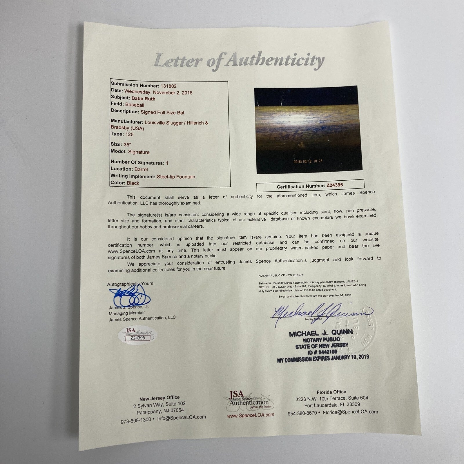 Signed Babe Ruth bats are extremely rare, much more scarce than baseballs and even more so on a Ruth model bat. HILLERICH & BRADSBY 125 35” George “Babe” Ruth TRADE MARK model bat. Ruth has signed the barrel in black steel-tip fountain pen. Comes with full letter COA from JSA.