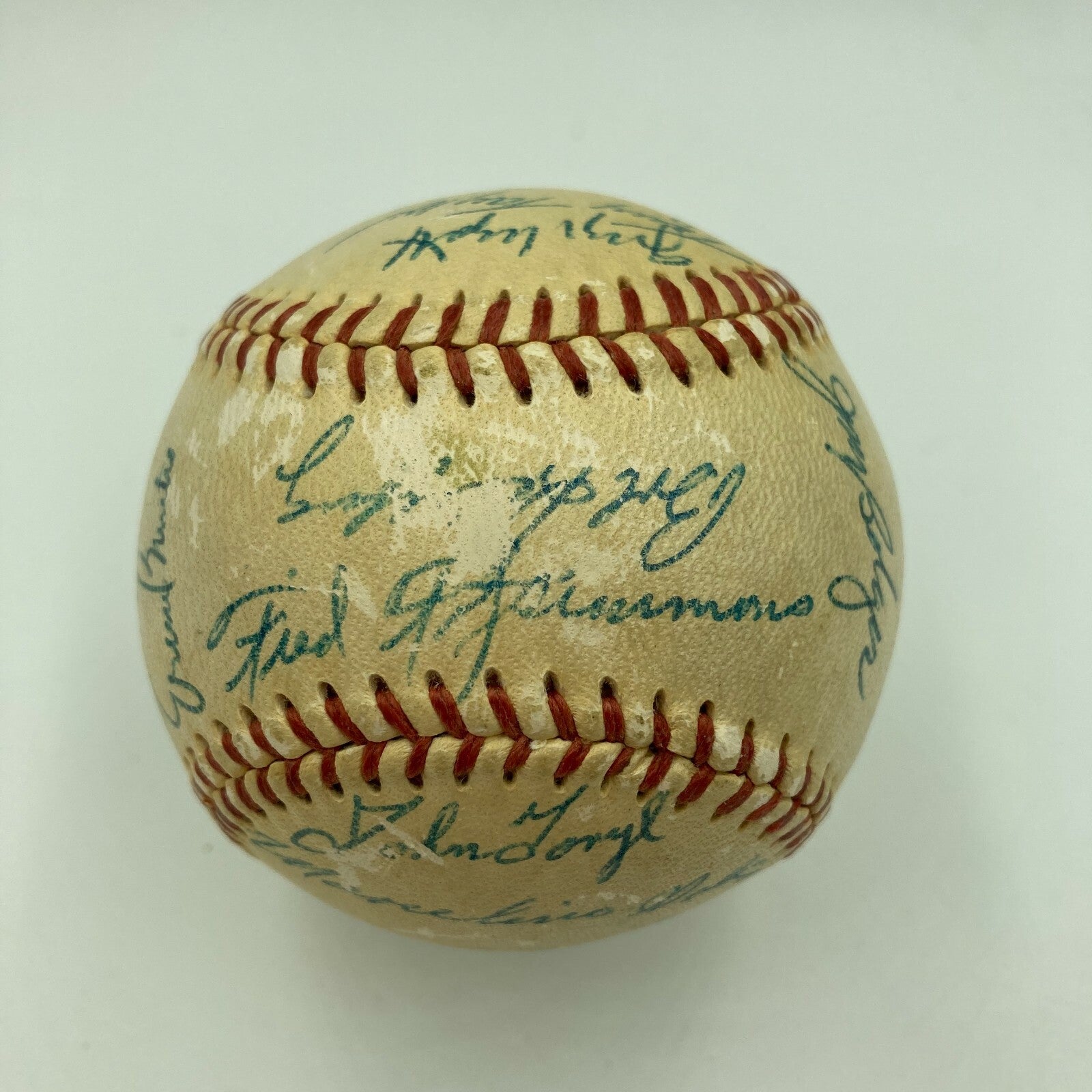 Beautiful 1958 Cubs team-signed by 24 players Official National League (Giles) baseball. Bob Scheffing and Fred Fitzsimmons signed on the sweet spot. Followed by (MVP) & HOFer Ernie Banks, Dale Long, Tony Taylor, Dave Hillman, Don Elston, Lee Walls, Walt Moryn, Bobby Thomson, Lou Jackson, Jim Bolger, Glen Hobbie, Bobby Adams, El Tappe, Johnny Goryl, Marcelino Solis, Moe Drabowsky, Bill Henry, Taylor Phillips, Dick Drott, Alvin Dark and two more. Signatures signed in blue ballpoint pen.
