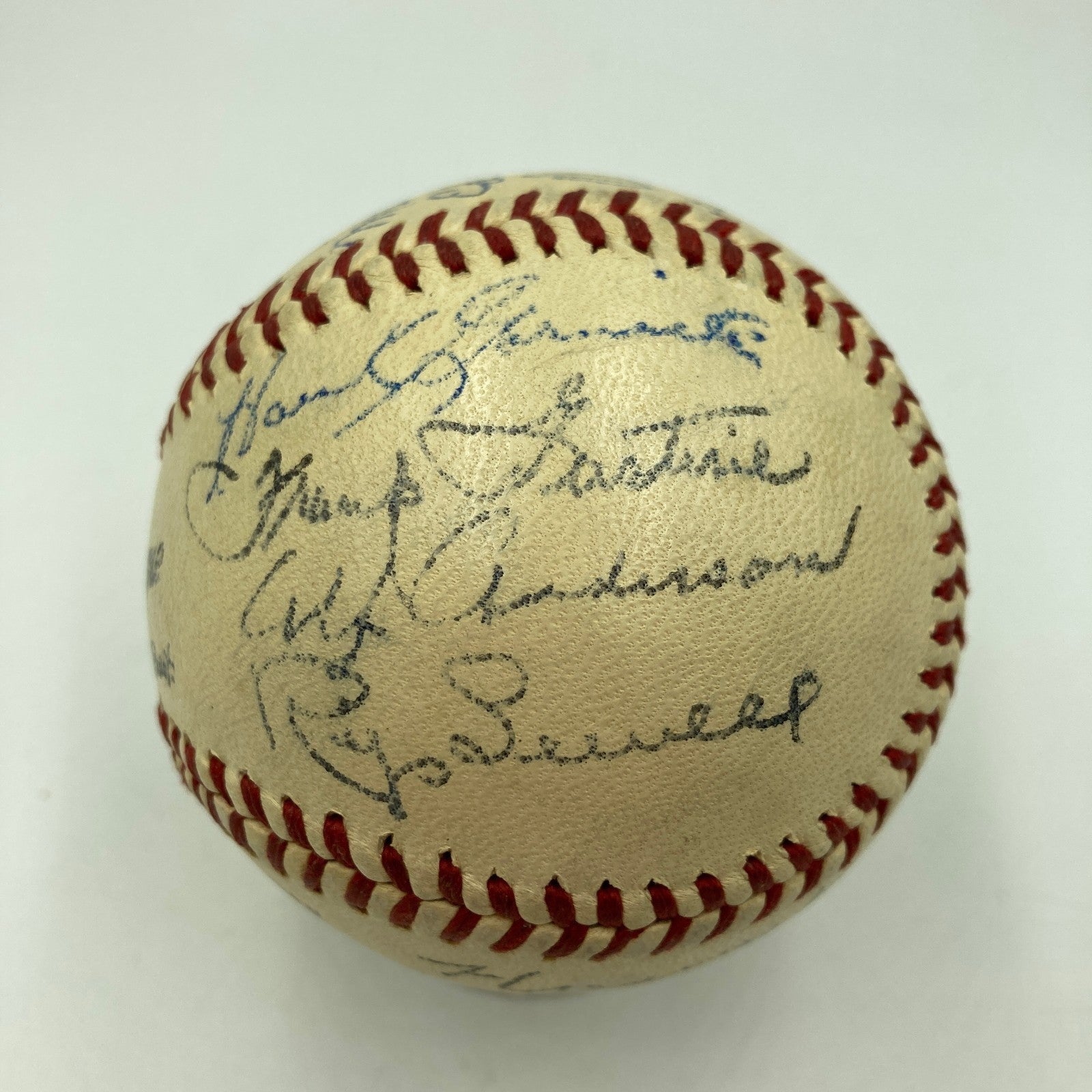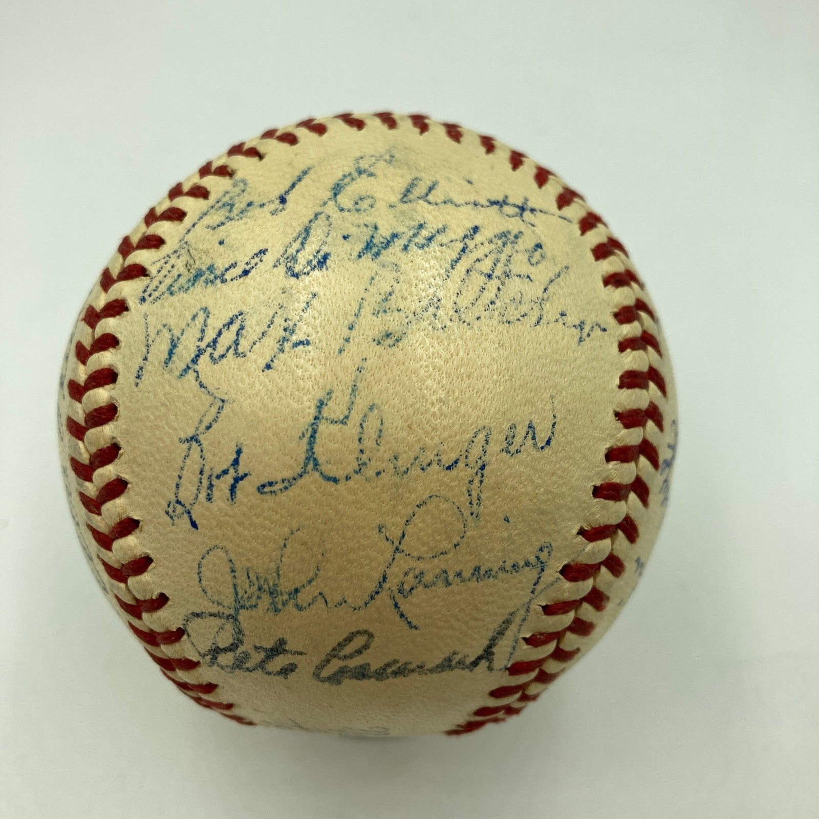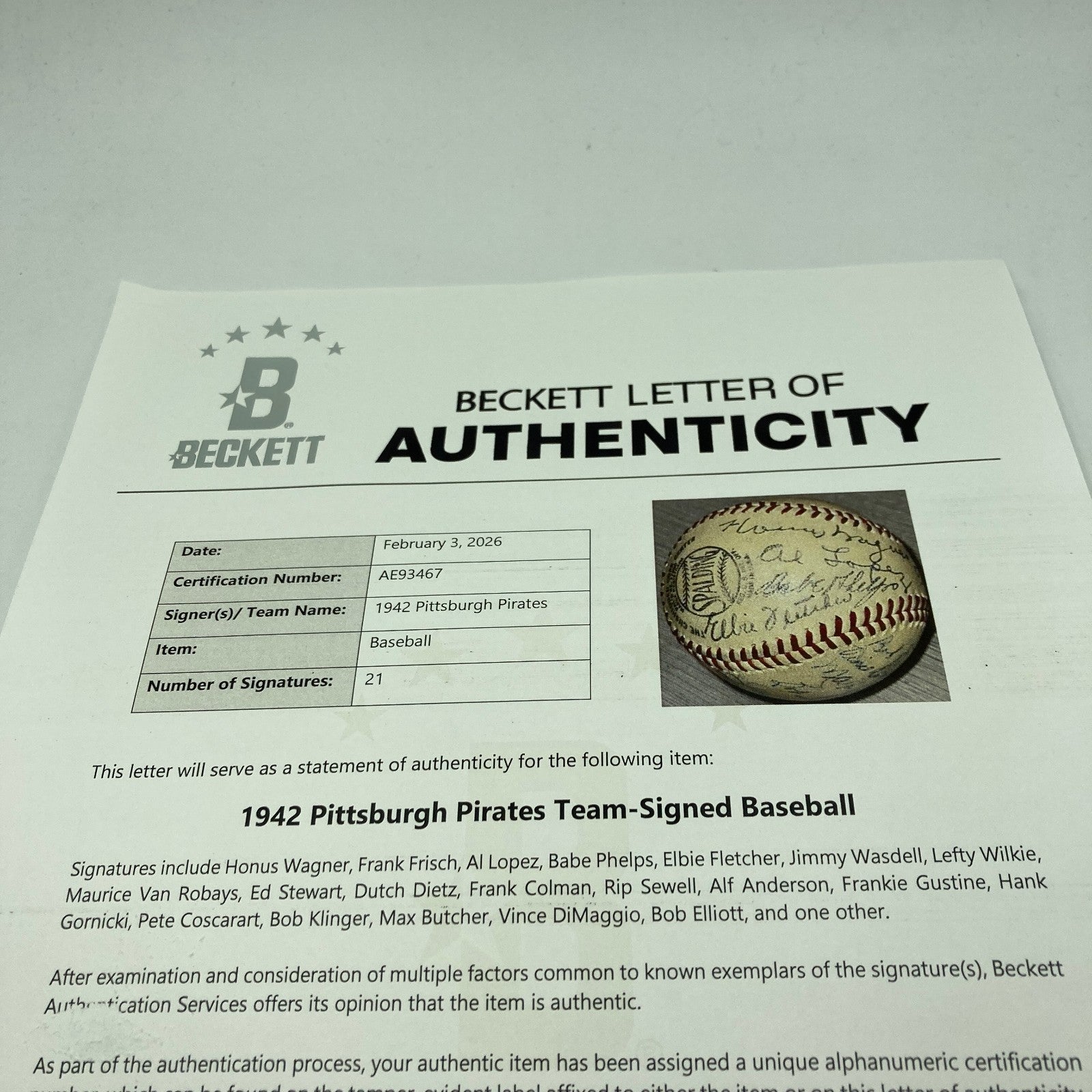 Presented is an Official National League (Frick) baseball signed by members of the 1942 Pittsburgh Pirates. Twenty-one former players including National Baseball Hall of Famers Honus Wagner, Al López, and fellow stars Frank Frisch, Babe Phelps, Elbie Fletcher, Jimmy Wasdell, Lefty Wilkie, Maurice Van Robays, Ed Stewart, Dutch Dietz, Frank Colman, Rip Sewell, Alf Anderson, Frankie Gustine, Hank Gornicki, Pete Coscarart, Bob Klinger, Max Butcher, Vince DiMaggio and Bob Elliott have penned their blue and black ink signatures across the entirety of the baseball (21 signatures). In 1942, manager Frankie Frisch led the Pirates to a record of 66–81, good enough for fifth in the National League. LOA from Beckett for the signatures accompanies.