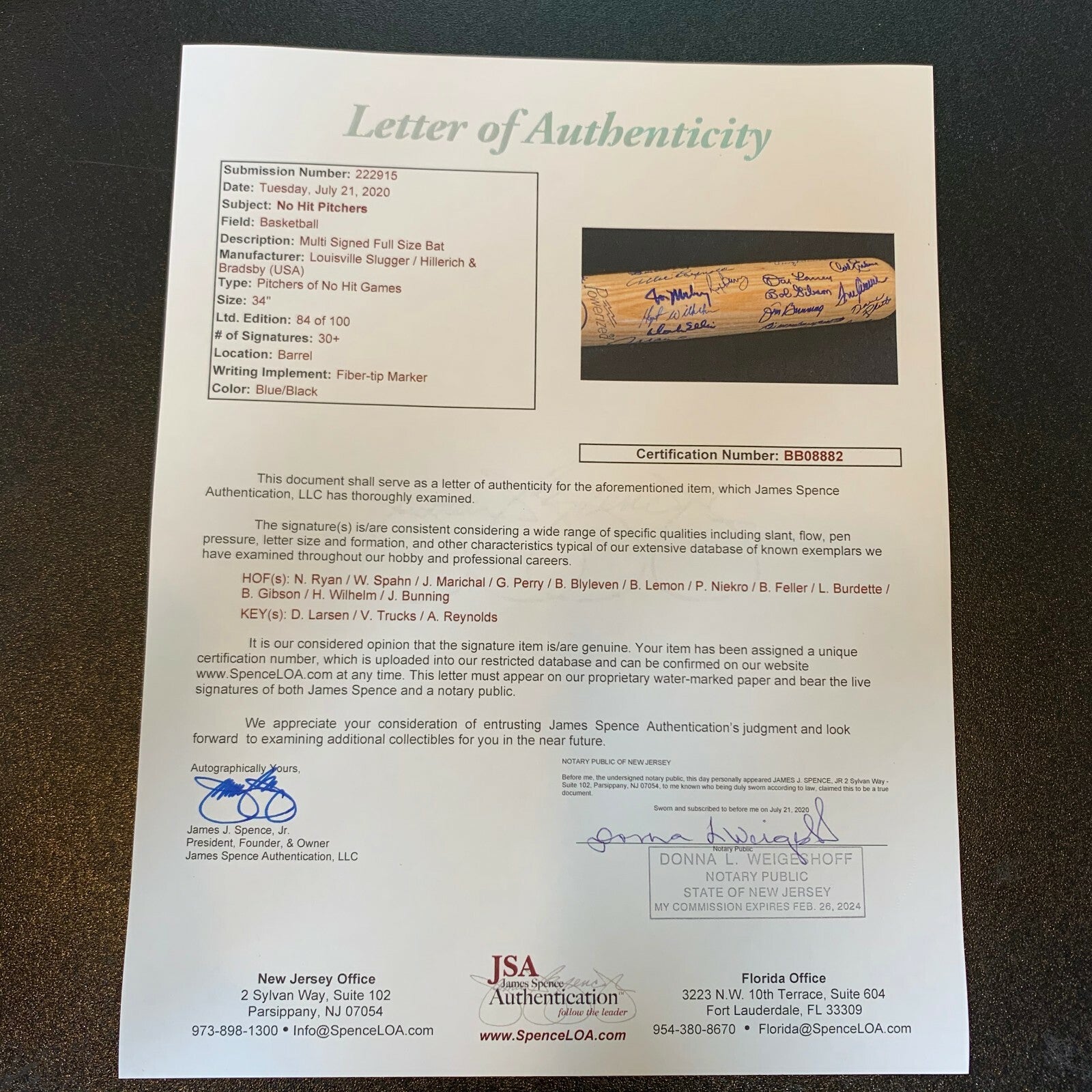 Baseball No-Hitter Pitcher Multi-Signed Bat. Offered is a bat signed by pitchers who threw a no-hitter in the major leagues. Nolan Ryan, Warren Spahn, Bob Gibson, Bob Feller, Juan Marichal, Johnny Vander Meer, Carl Erskine, Doc Gooden and Don Larsen are among the 20-plus signatures, all of which display well. The item is in good condition with minimal signs of wear.