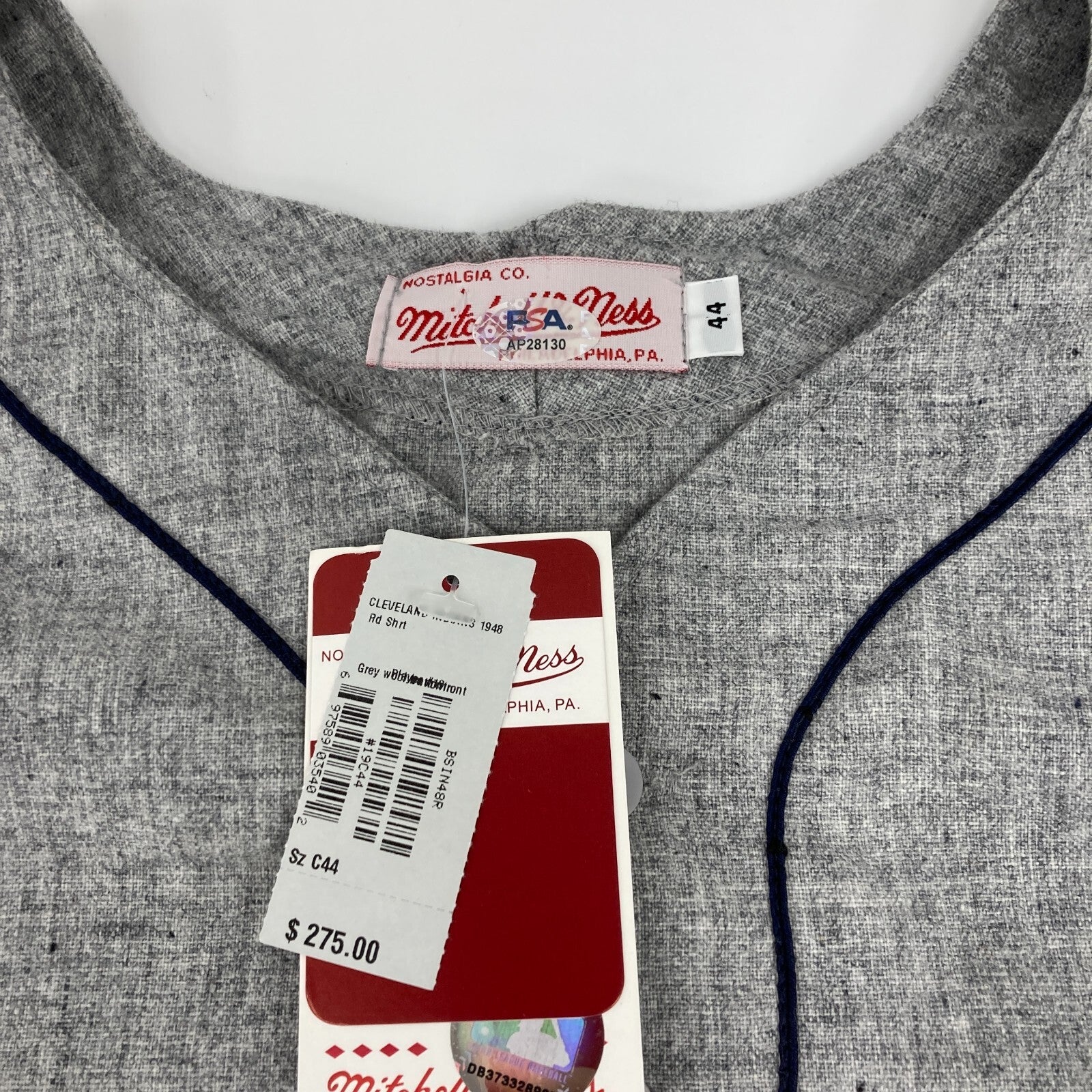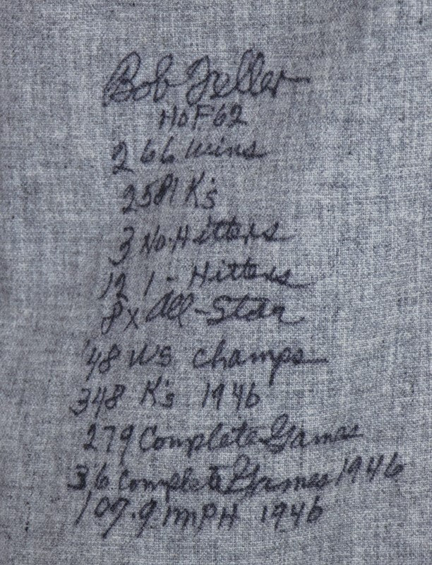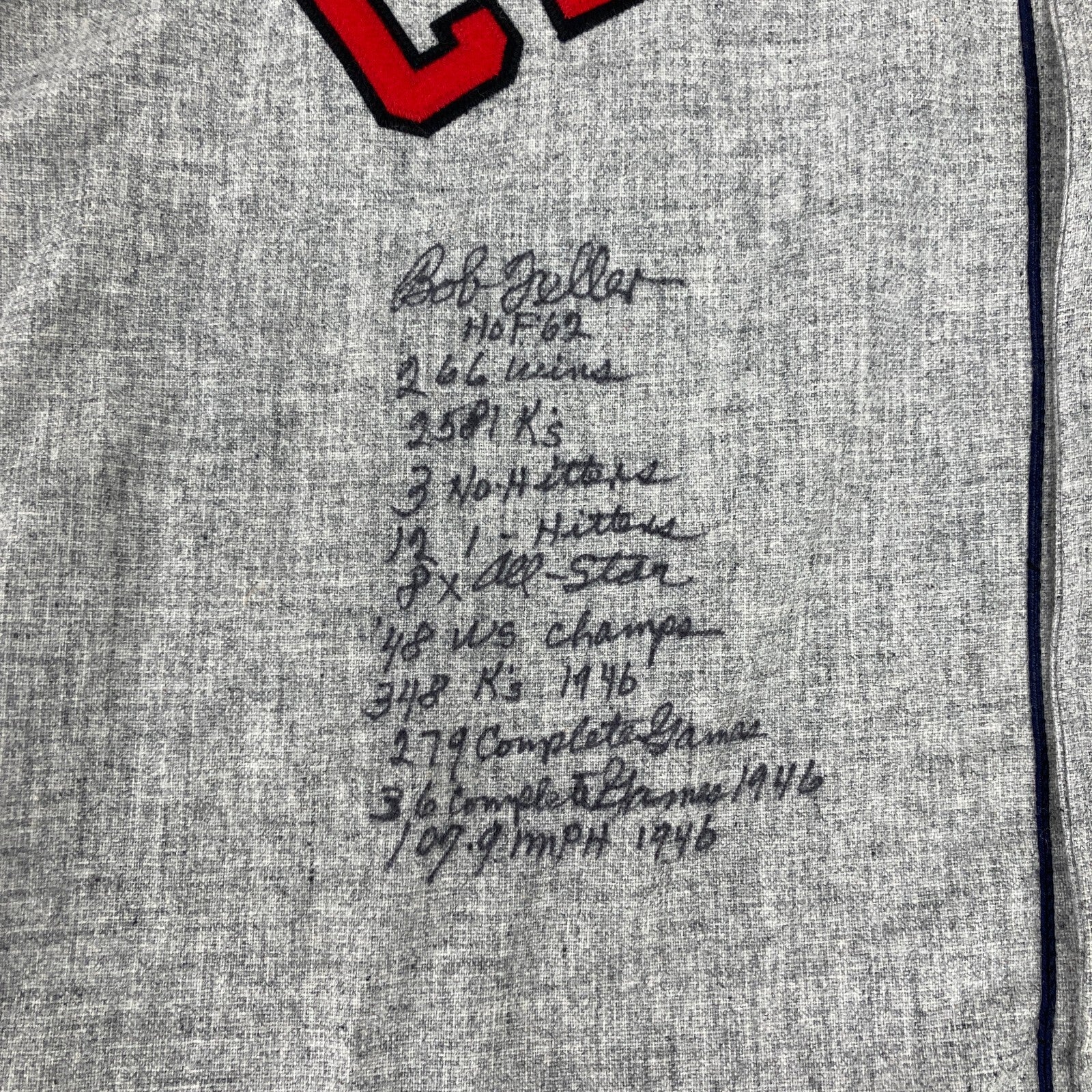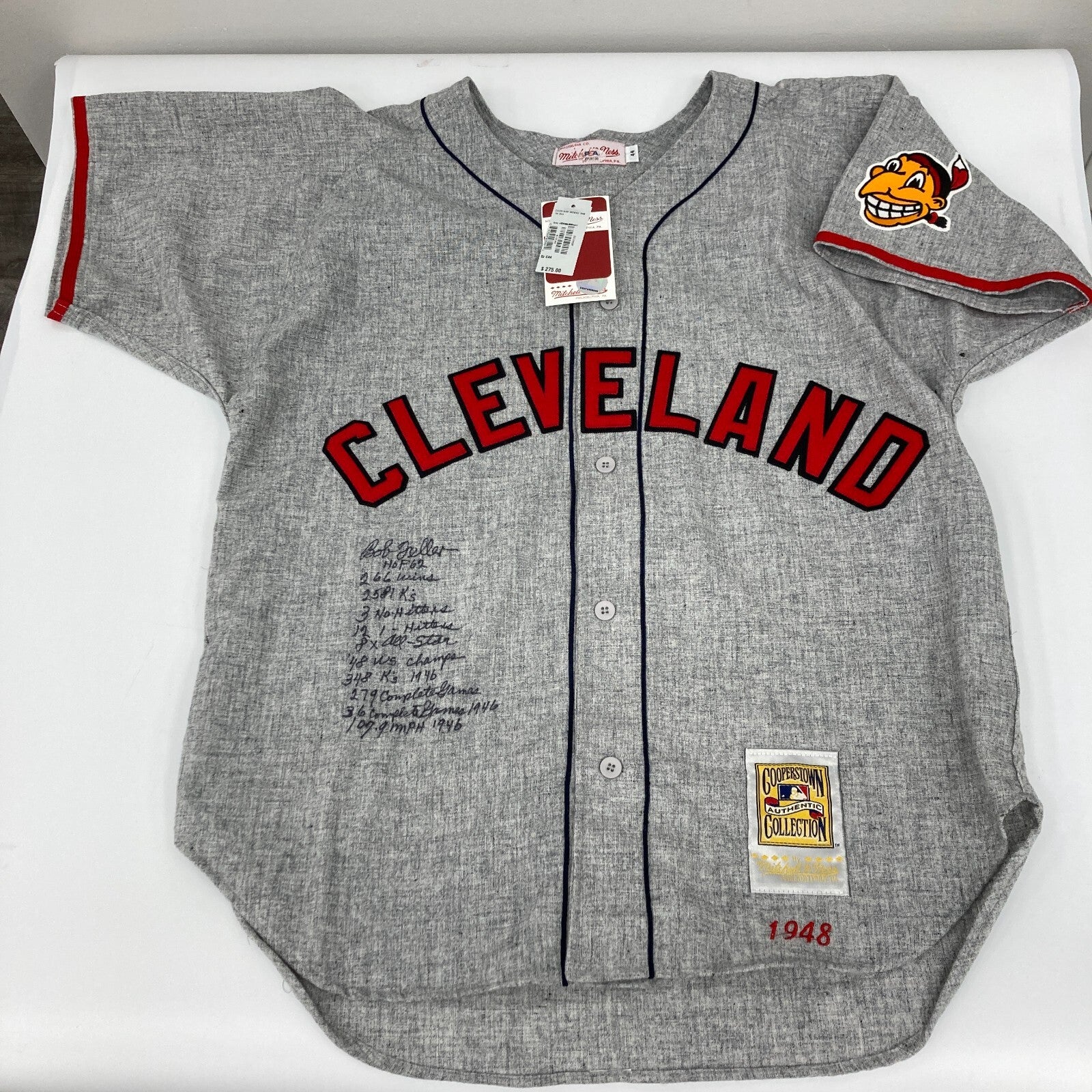 Pitching phenom and Baseball Hall of Famer Bob Feller has signed this 1948 Mitchell & Ness edition baseball jersey, adding 11 impressive inscriptions to highlight his legendary career. These include: "HOF ‘62, 266 Wins, 2,581 K's, 3 No-Hitters, 12 1-Hitters, 8X All-Star, ‘48 World Series Champs, 348 K's 1946, 279 Complete Games, 35 Complete Games 1946, and 107.9 MPH 1946." This stunning vintage-style Indians jersey is an incredible tribute to Feller's extraordinary accomplishments, making it a must-have piece for any baseball collector.