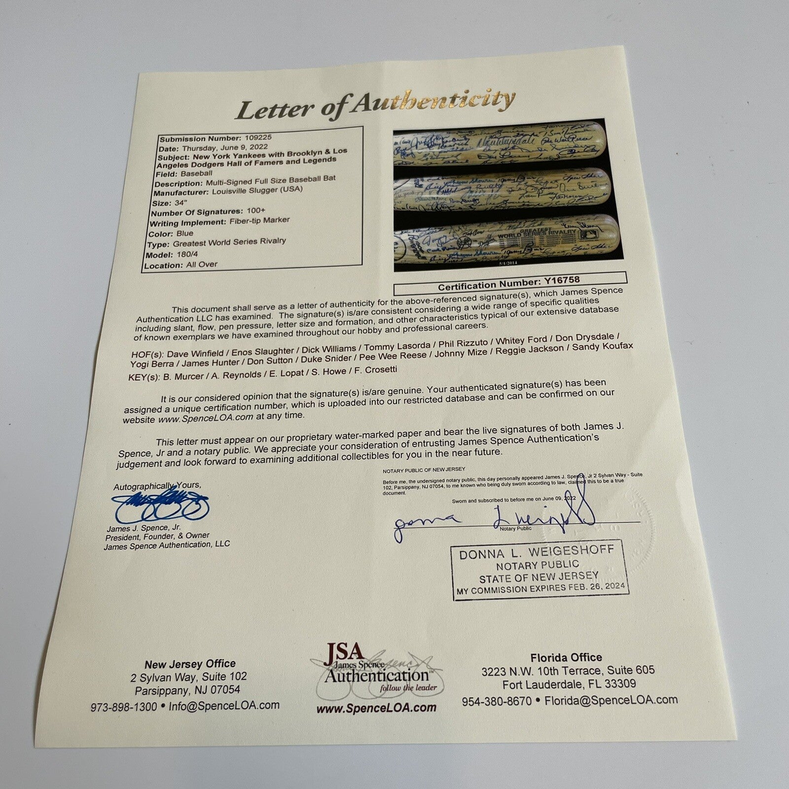 "Spec" Shea, Irv Noren, Bobby Richardson, Ron Cey, Allie Reynolds, Jay Johnstone, Tony Kubek, Larry Sherry, Tommy Byrne, Ed Lopat, Spider Jurgenson, Lou Piniella, Hank Bauer, Herman Franks, Bob Turley, Graig Nettles, Ryne Duren, Jim Spencer, Chris Chambliss, Moose Skowron, Roy White, Billy Loes, Cliff Johnson, Tommy John, Clem Labine, Rocky Bridges, Ken Holtzman, Johnny Podres, Tom Henrich, Gil McDougald, Joe Black, Mickey Rivers, Joe Pepitone, Duane Pillette, Harry Taylor, Tommy Holmes, Johnny Blanchard, Brian Doyle, Bill Johnson, Johnny Schmitz, Willie Randolph, John Sain, Norm Siebern, Allie Clark, Eddie Robinson, Tom Sturdivant, Dick Williams, Jerry Lumpe, Bob Stafford, Jack Philippe, Bobby Murcer, Steve Yeager, Jim Hughes, Sparky Lyle, Bucky Dent, John Roseboro, Tommy Davis, Bob Cerv, Ralph Houk, Clyde King, Roger Craig, Carl Erskine, Wally Moon, Don Newcombe, Mrs. Gil Hodges, Don Thompson, Al Downing, Fred Sanford, Pete Coscorat, Jack Banta, Tommy Brown, Clete Boyer, Gene Hermanski, Fred Stanley, George "Shotgun" Shuba, Preacher Roe, George Cisan, Bob Aspromonte, Bobby Brogan, Ralph Branca plus many others. Comes with Full letter JSA COA.