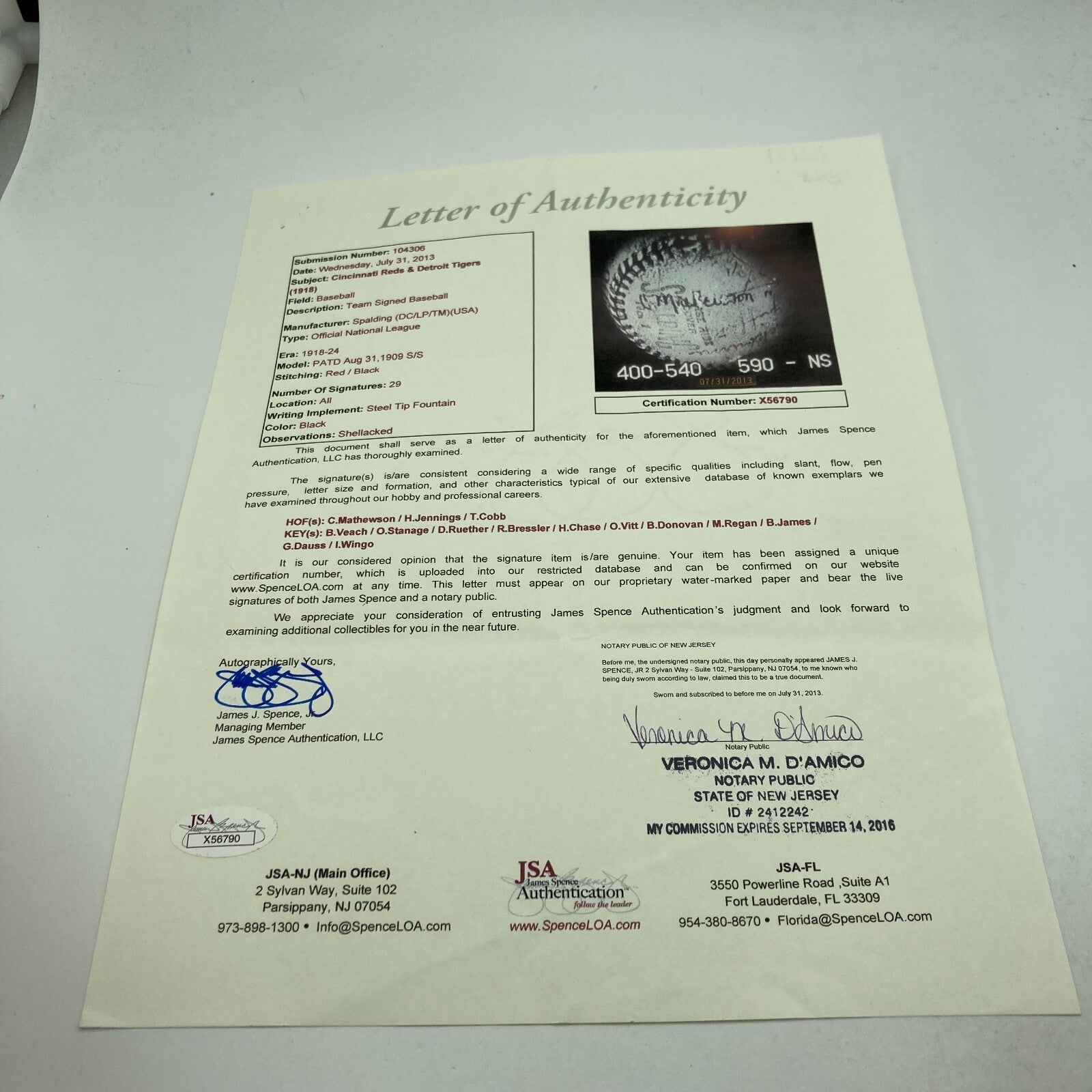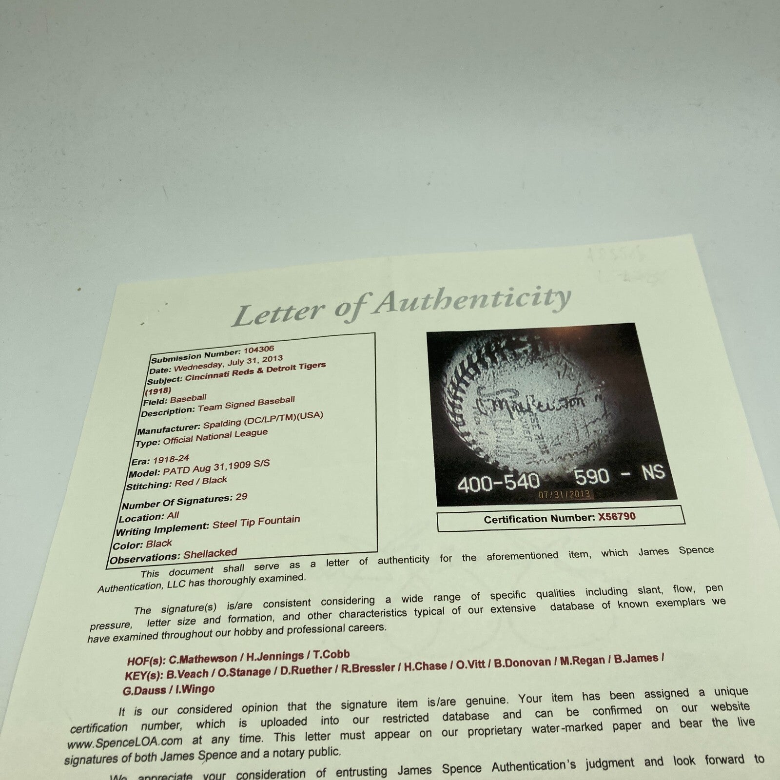 Extremely rare 1918 Cincinnati Reds VS. Detroit Tigers team signed Official National League Game Baseball. 29 signatures with Christy Mathewson (bold signature), Ty Cobb, Hughie Jennings and many others. See the photos for a complete list.