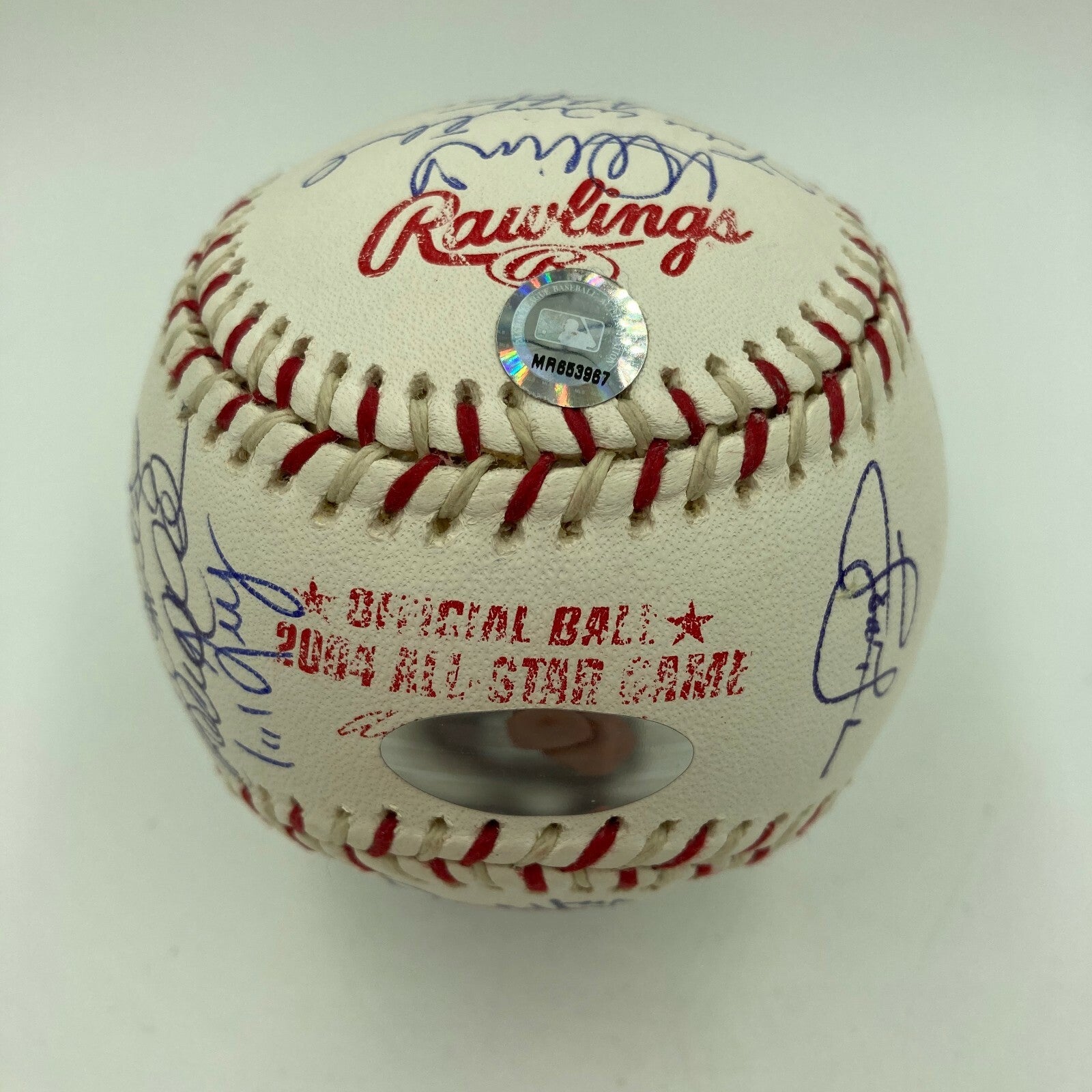 2004 American League All-Star Team Signed Baseball. Offered is a baseball signed by members of the 2004 American League All-Star squad. Joe Torre, Mariano Rivera, Curt Schilling, Kenny Rogers, Gary Sheffield, Derek Jeter, Alex Rodriguez, Don Mattingly, Ichiro Suzuki, Hideki Matsui, Jason Giambi and many others signed the ball. COA from Steiner Sports.