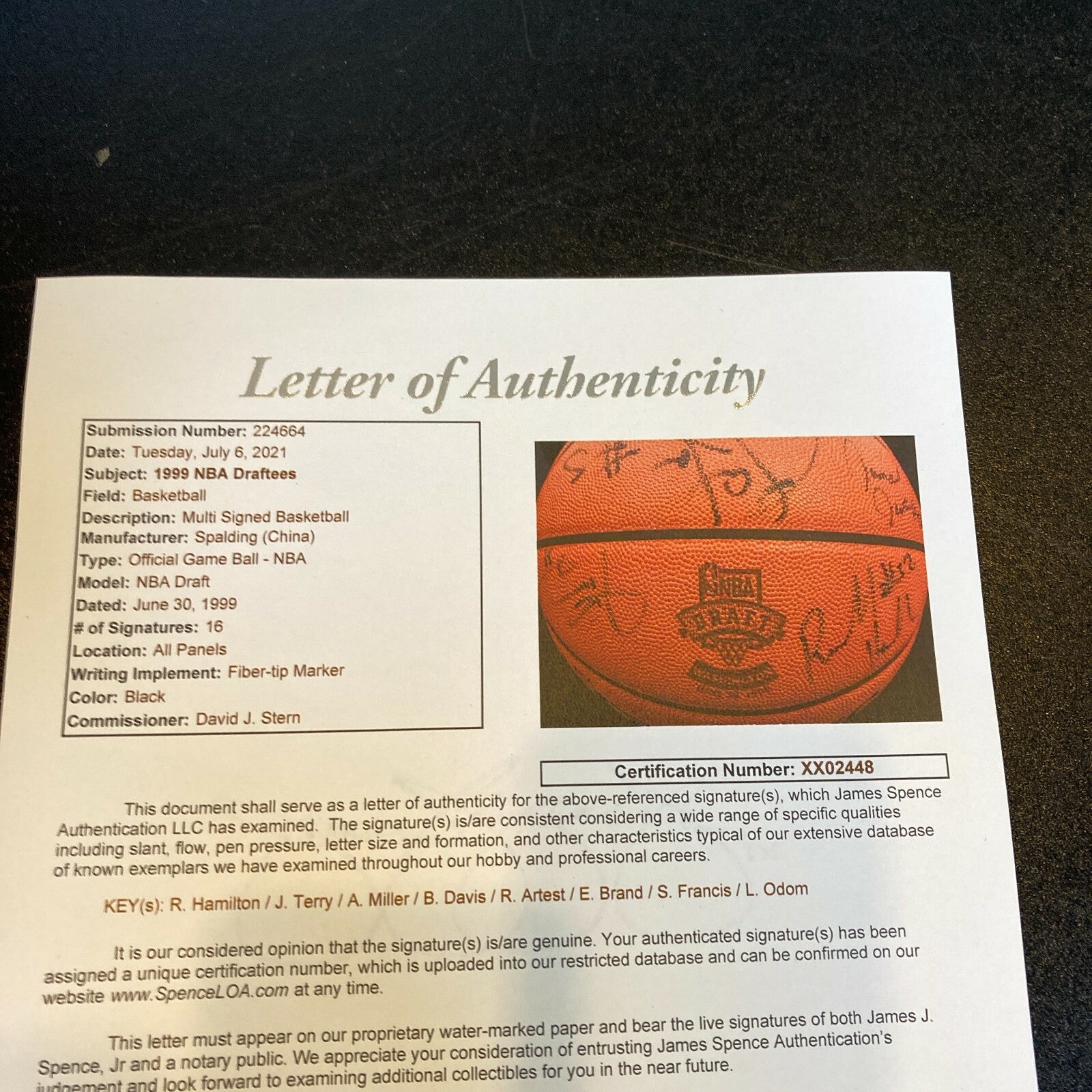 1999 NBA Draft Class basketball signed by draftees in attendance. Signatures include: Elton Brand, Steve Francis, Baron Davis, Lamar Odom, Wally Szczerbiak, Richard Hamilton and Shawn Marion among others. Full letter JSA COA.