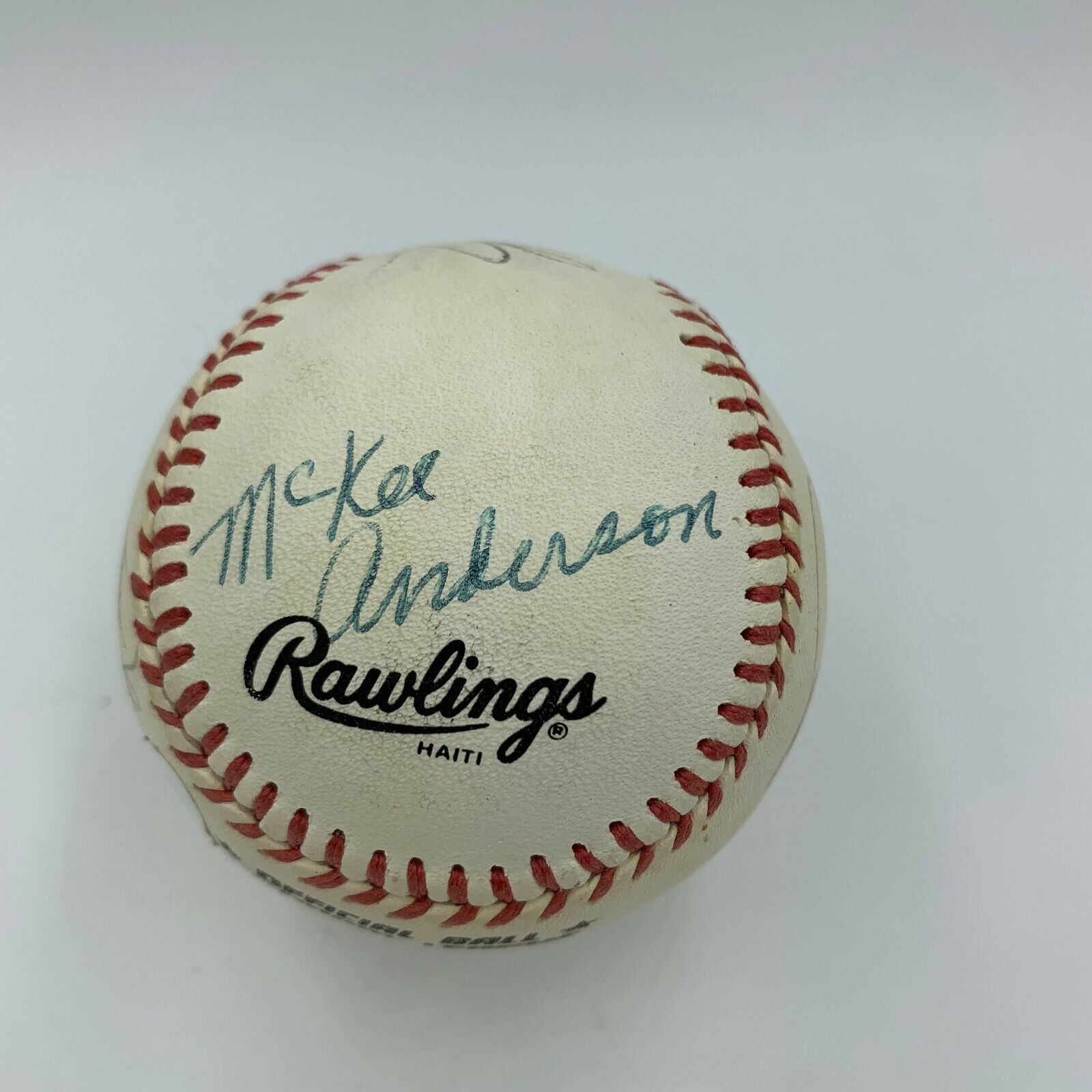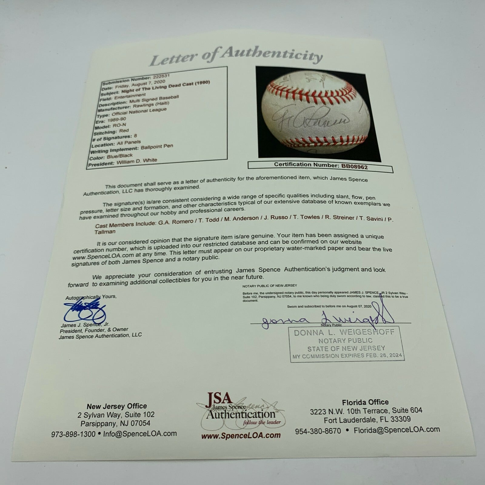 Very rare Night Of The Living Dead Cast Signed Official National League Baseball. Signed by George Romero, T. Todd, M. Anderson, John Russo, T. Towles, Russell Streiner, T. Savini and P. Tallman. Full letter JSA COA.