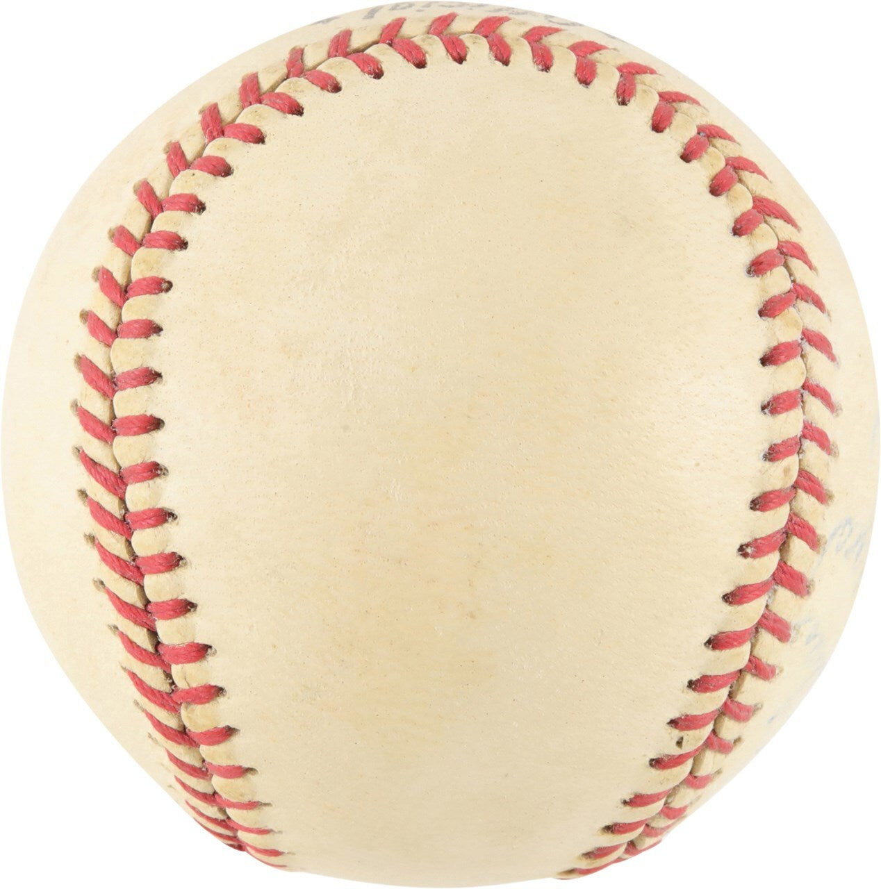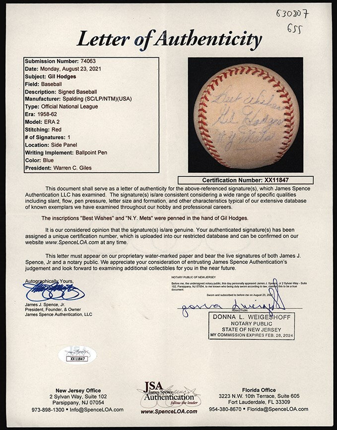 On July 24, 2022, Gil Hodges will finally be posthumously inducted into the National Baseball Hall of Fame, an honor that many fans feel is long overdue. Presented is a Gil Hodges single signed Official National League Baseball (Warren Giles) that dates from 1958-62. Hodges spent the bulk of his 18-year playing career with the Brooklyn/Los Angeles Dodgers, but he finished his playing years with the 1962-63 New York Mets. Hodges first appeared in the Majors as an 18-year-old third baseman for one game in 1943. He served in the U.S. Marines in the South Pacific during World War II, then became a catcher in the minors. He made it back to the Brooklyn team as a catcher in 1947, and then was shifted to first base in 1948. No other player except teammate Duke Snider had more home runs or drove in more runs during the 1950s than Hodges. When he stopped playing, Hodges was briefly number 10 on the all-time MLB homer list, with 370. Gil was also a superb fielding first baseman. He won the first three Gold Glove Awards and almost assuredly would have won many more if the Gold Glove Award were given earlier in his career. Gil was at first base for six National league pennant winners, and for two Dodger teams that won the World Series - one in Brooklyn and one in Los Angeles. Hodges managed the Washington Senators for five seasons, and then returned to New York to skipper the Mets from 1968-71. He managed the New York "Miracle Mets" to the World Championship in 1969, and that victory was regarded as an incredible upset from the usually downtrodden Mets. Hodges passed away from a heart attack in 1972 when he was 47 years old. Single signed and inscribed by Hodges as "Best Wishes" and "NY Mets". The baseball comes with a JSA Letter of Authenticity. With the Hall of Fame induction for Hodges imminent, what better time to have a single signed Gil Hodges baseball?