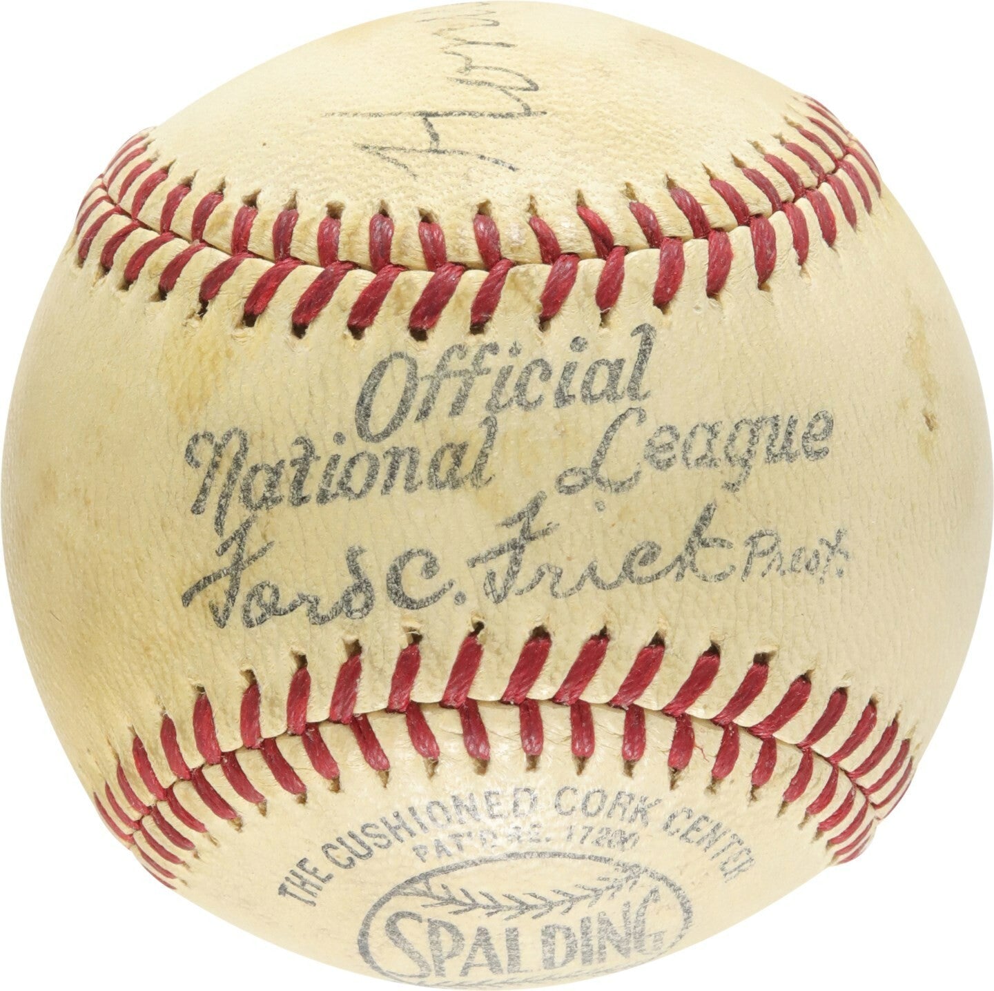 Official National League (Frick) ball signed by Hall of Fame shortstop Honus Wagner. The legendary "Flying Dutchman" has scripted his name in black fountain pen the baseball. This ball dates from the 1941-1942 manufacturing period, a time when Wagner was a coach with the Pittsburgh Pirates. Unfortunately, the ball is connected to a sad story. Our consignor's uncle, a Michigan native, who was the captain of his college football team and a star baseball player, tragically broke his neck while diving at a local swimming hole in 1940. The injury left him paralyzed from the chest down. When news of the accident spread, there was a tremendous outpouring of local support. Among the numerous gifts he received at the time was this ball from Honus Wagner, which has remained in the family until now. The ball is in Excellent condition. Full LOA from PSA.