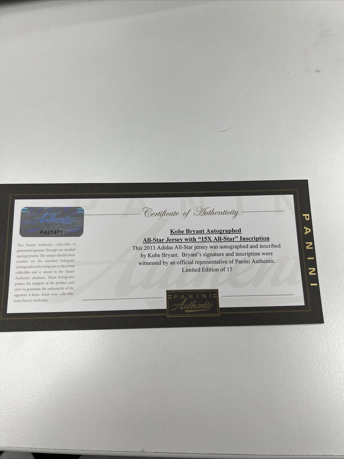 Presented is an authentic Western Conference All-Star Game jersey signed by the beloved NBA icon Kobe Bryant. Bryant has penned his flowing signature in black marker on the number "24" on the jersey's back, along with the inscription "15x All-Star." The jersey features all numbering and lettering in tackle twill. An NBA Logoman patch in the shape of a star is embroidered on the upper left chest, with a white Adidas logo opposite to it on the right. A gold patch that reads "2013" rests at the base of the V-neck collar. An NBA Authentics size XL Adidas tag, with an attached "LENGTH +2" flag rests on the jersey's front left tail. A Los Angeles Lakers patch is embroidered on the jersey's back beneath the collar. The jersey comes with an LOA from Panini (21471) for the signature. The limited-edition piece is serial-numbered "13/15."