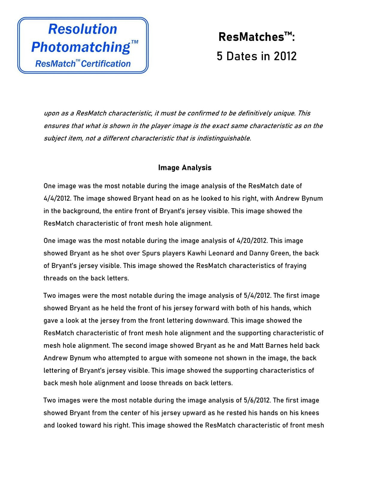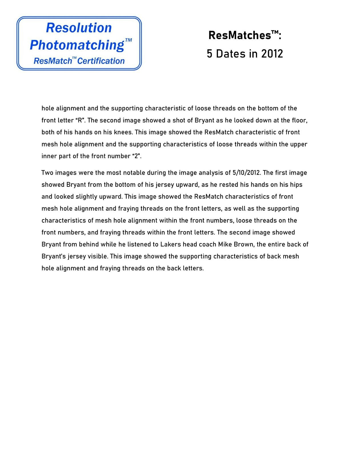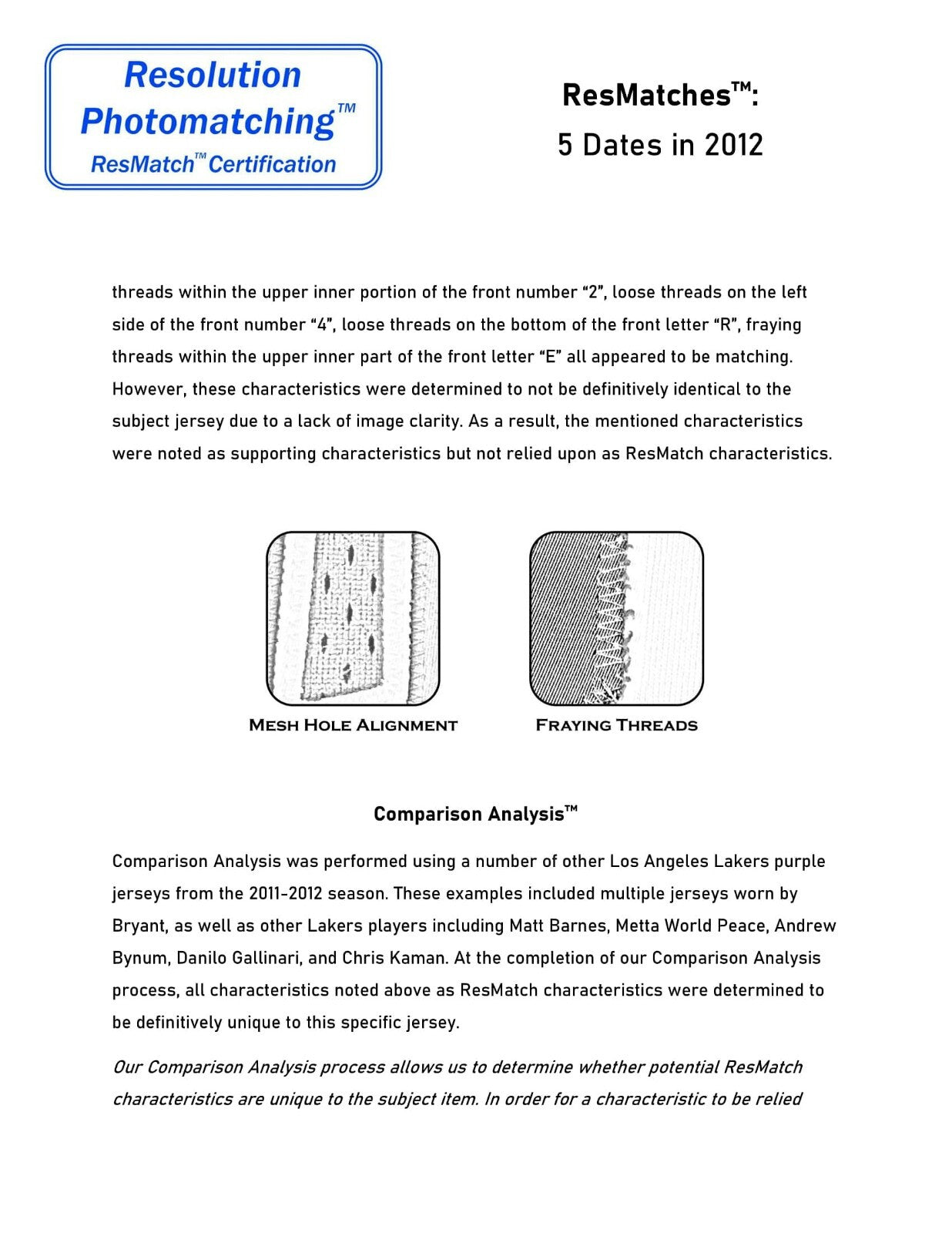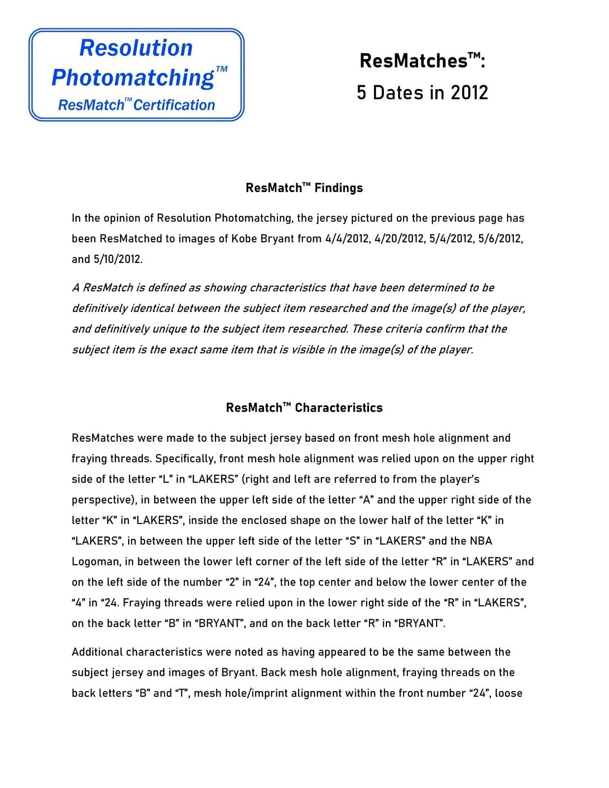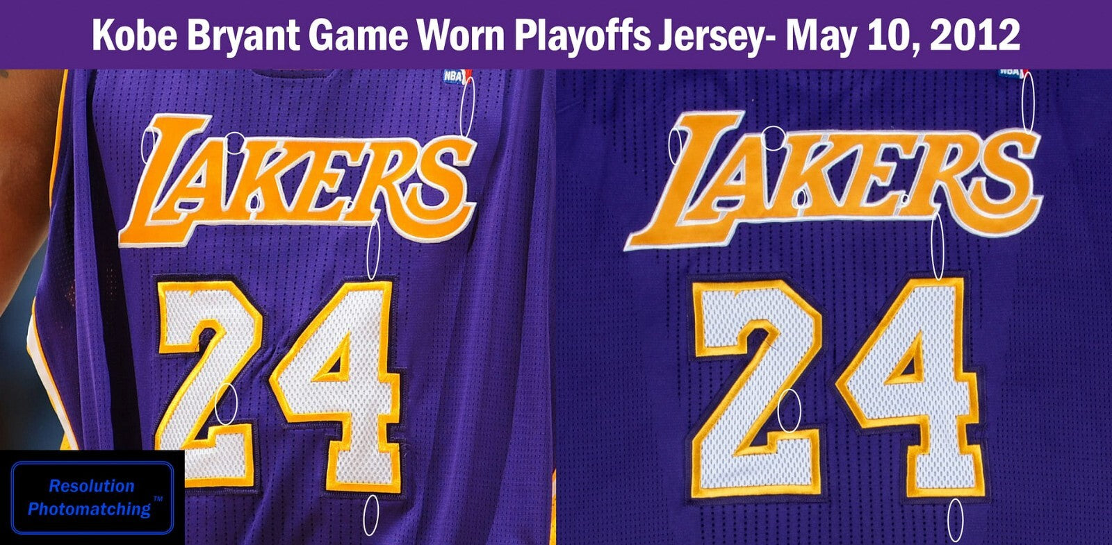 Presented is a Los Angeles Lakers purple road jersey worn by Bryant for five games of that season, including three playoff games. This jersey has been photo-matched by both Resolution Photomatching and Sports Investors Authentication to games on April 4, April 20, May 4, May 6, and May 10. In those five games, Bryant scored 124 points, pulled down 23 rebounds, dished 23 assists, recorded 2 steals, and one blocked shot. Bryant scored two 31-point games, one on April 4th and the other on May 10th. The May 4, 6, and 10th games were played against the Denver Nuggets in the Western Conference First Round. This jersey has all of the letters and numbers sewn on in tackle twill. The front left tail has an Adidas/NBA AUTHENTICS size 6XL tag with a "LENGTH +4" flag. Next to the Adidas tag is an "EVERY PLAYER.EVERY GAME LLA00929" tag. This wonderful Kobe Bryant gamer comes with an LOA from Resolution Photomatching (37136), which has provided a ResMatch™ to the aforementioned five games, plus an LOA from Sports Investors Authentication (220903M5), which has also photo-matched this jersey to the same five games.