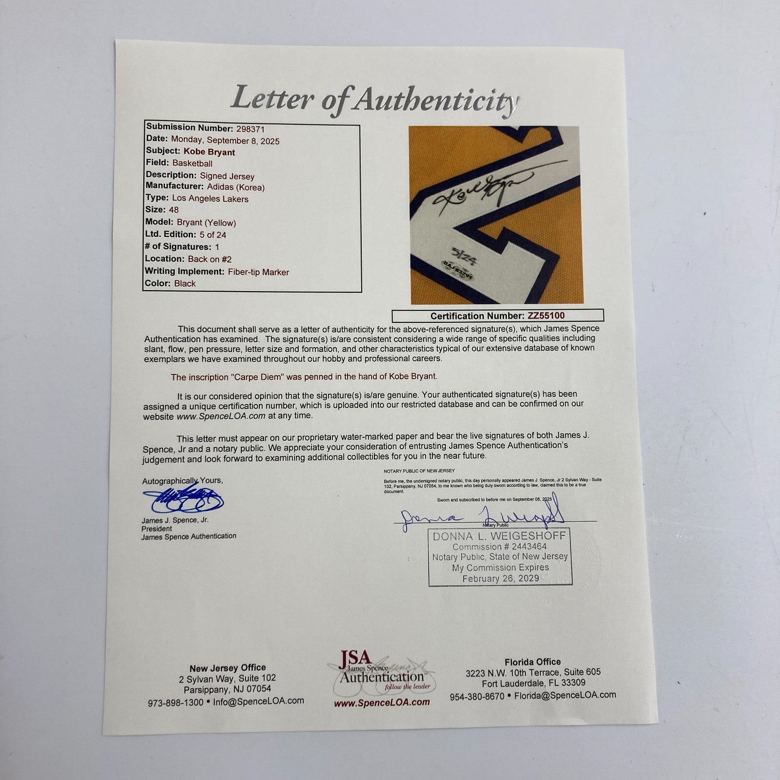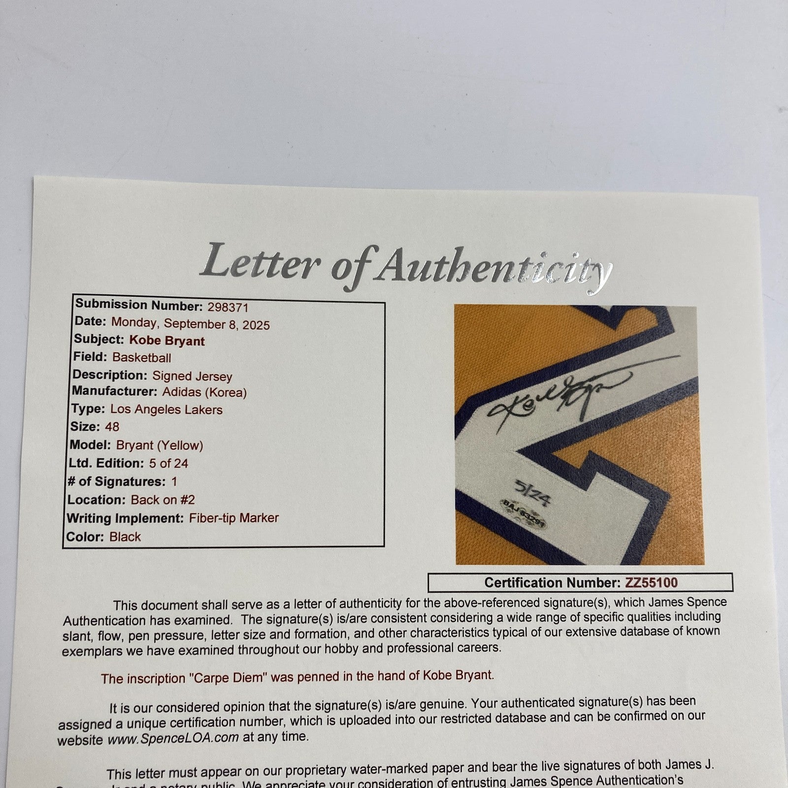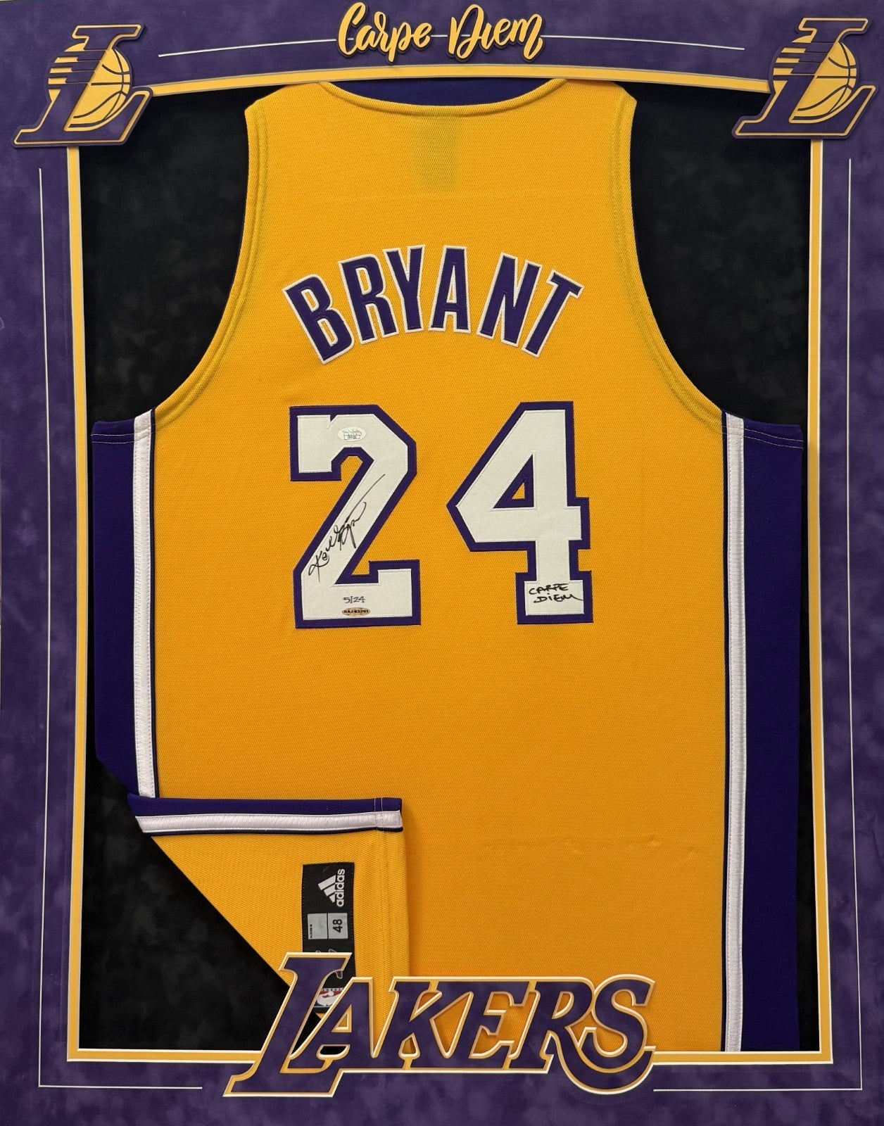 Presented is a white authentic game model Los Angeles Lakers 24 jersey signed by Kobe Bryant on the "2". Bryant has added the inscription "CARPE DIEM" on the number "4". The limited-edition piece is serial-numbered "5/24." It comes with a sticker from Upper Deck Authenticated (BAJ83291) for the signature. Comes with full letter JSA COA.