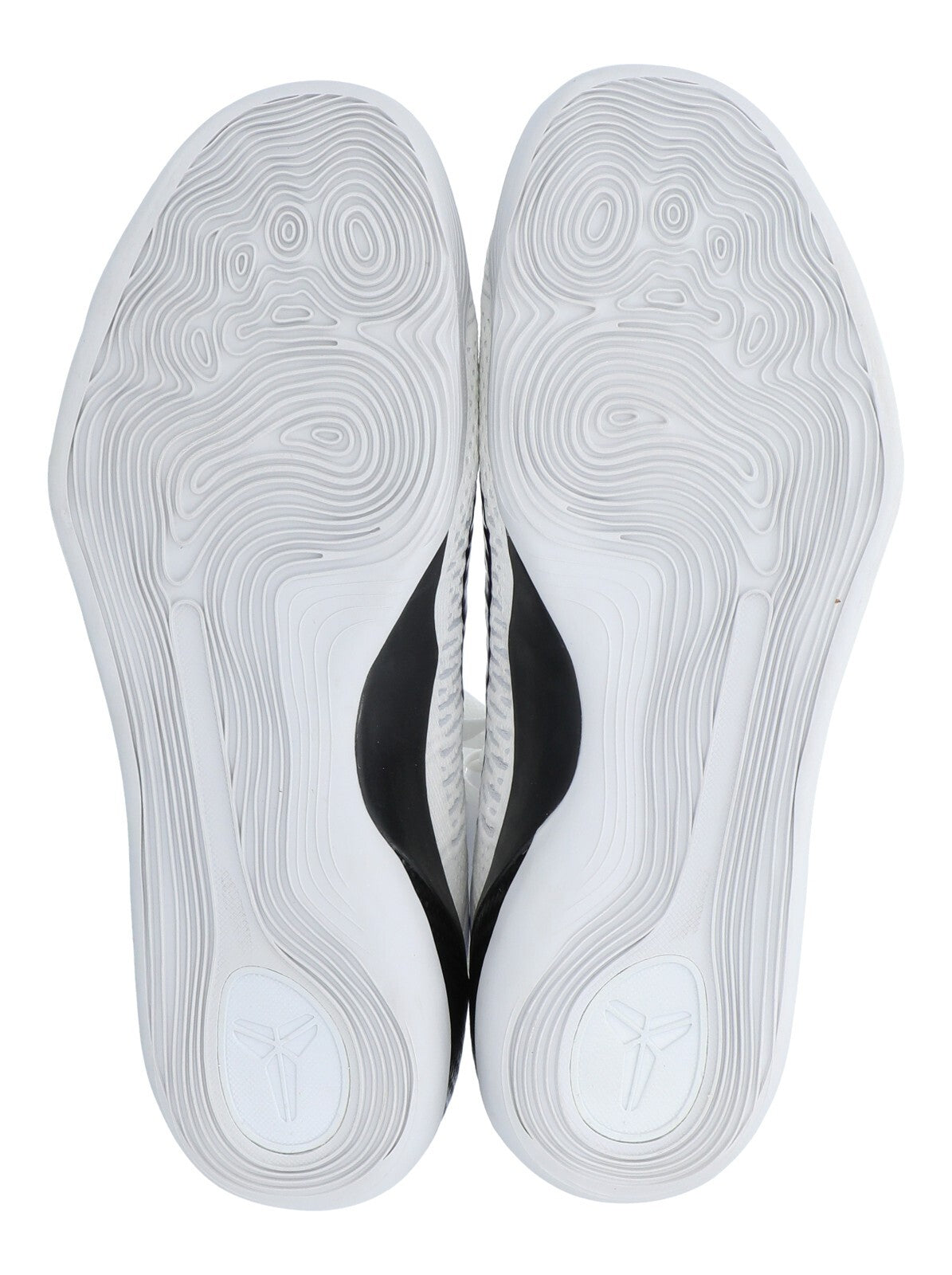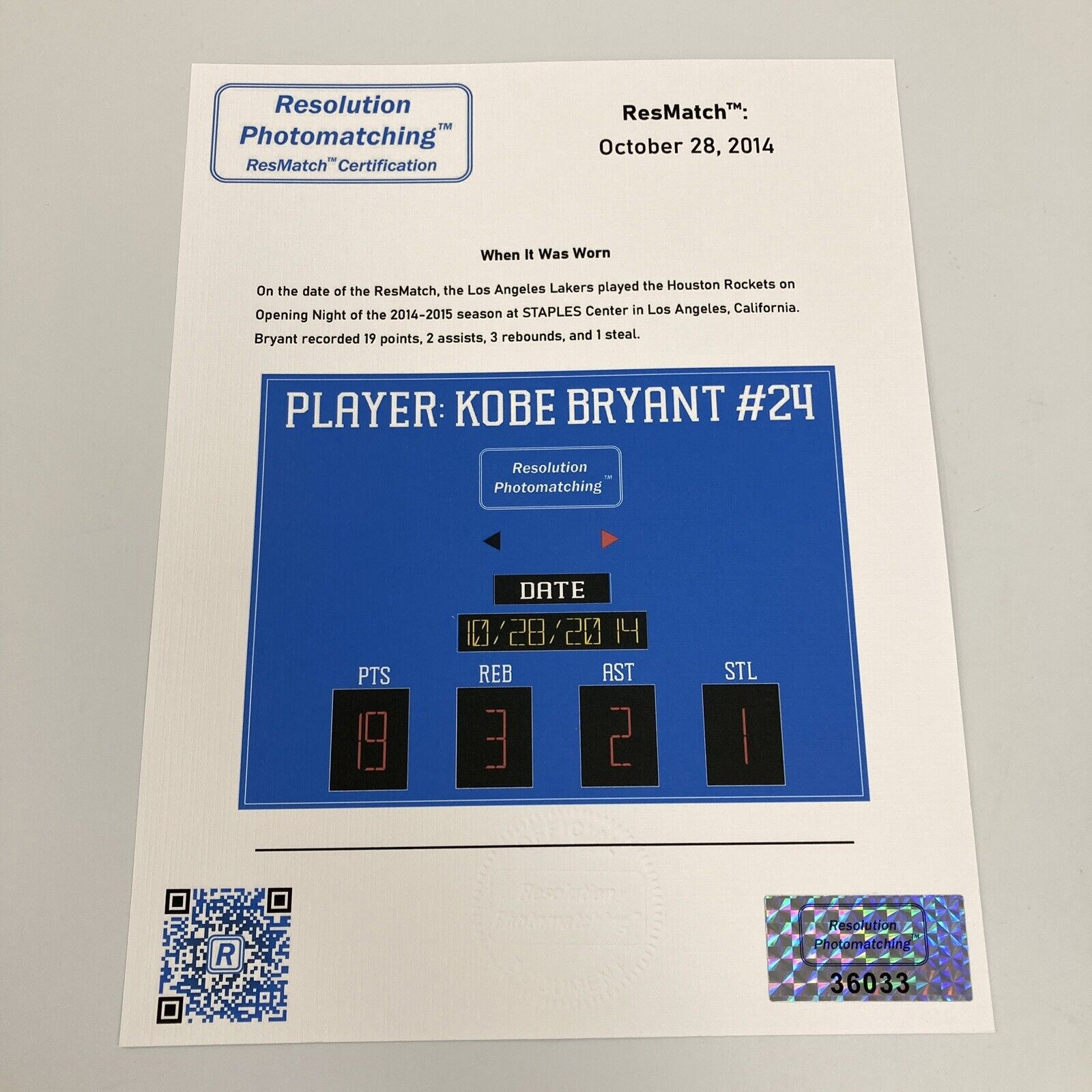 While wearing the presented Nike sneakers Kobe Bryant scored a team-high 19 points, while also contributing 3 rebounds, 2 assists, and a steal in the Los Angeles Lakers 2014-15 season-opening 108-90 loss to the Houston Rockets at the STAPLES Center in Los Angeles on Oct. 28, 2014. Despite injury causing him to play only 35 games throughout the season, Bryant was selected to play in his seventeenth All-Star game. These sneakers have been photo-matched by Resolution Photomatching to the Oct. 28, 2014, game.
