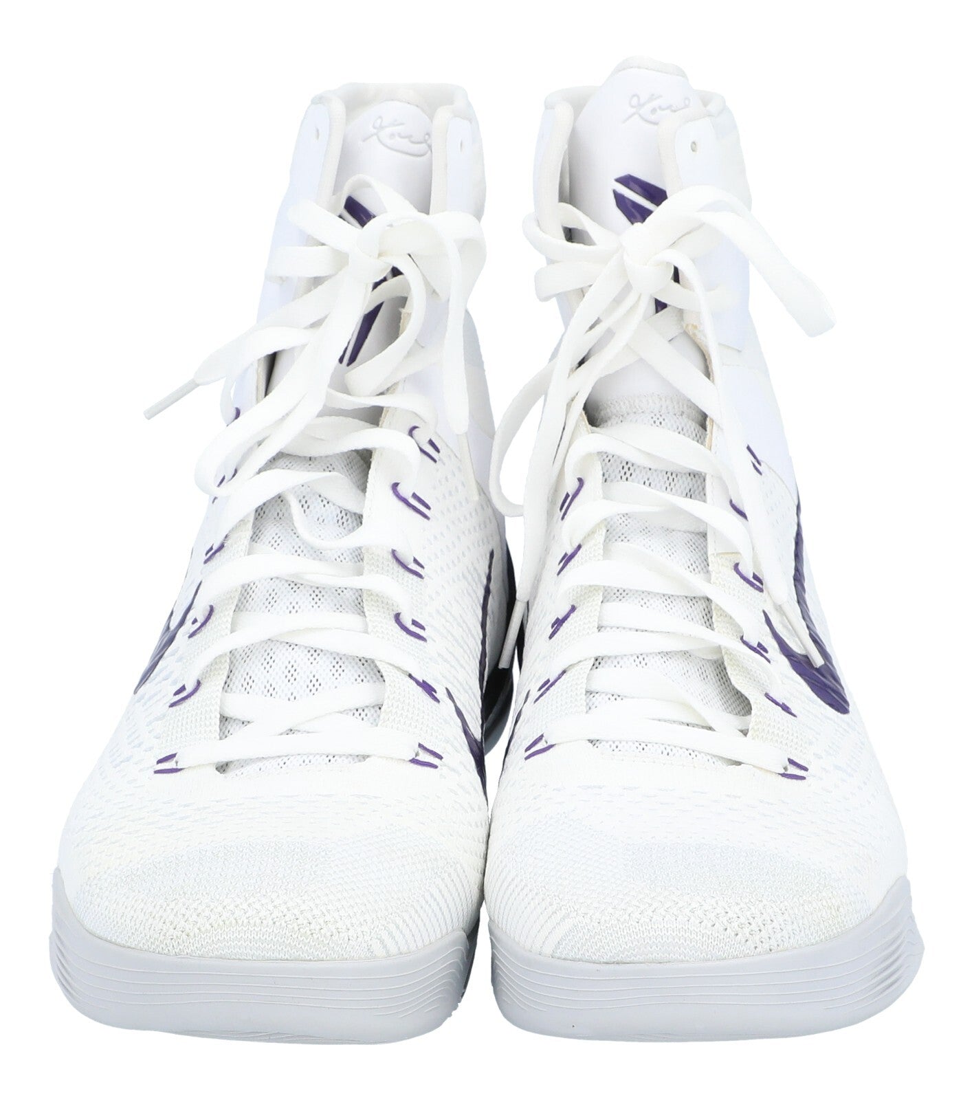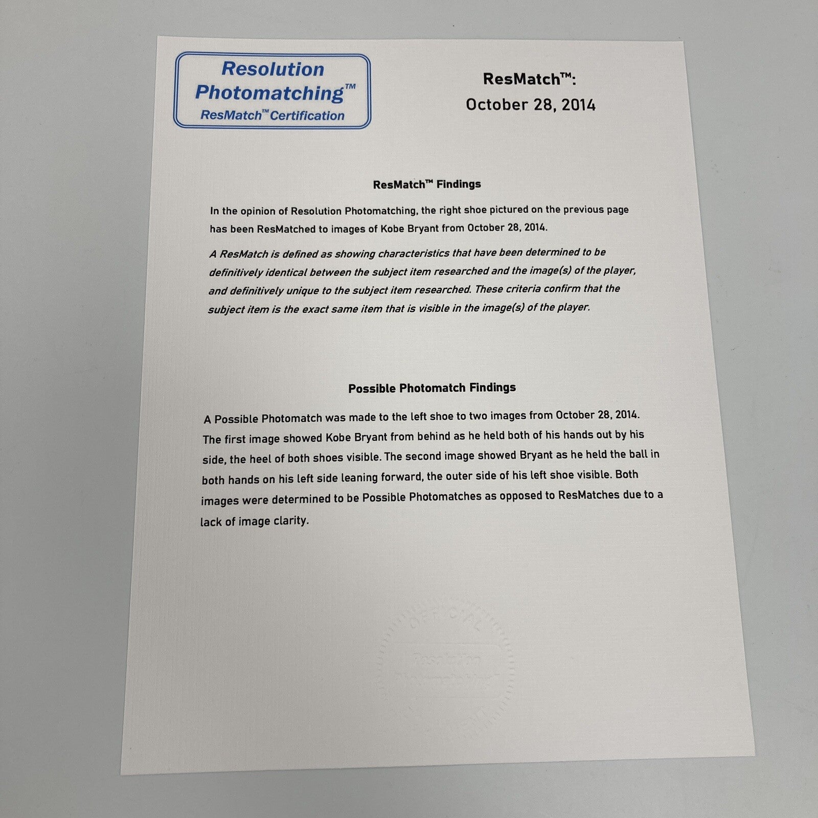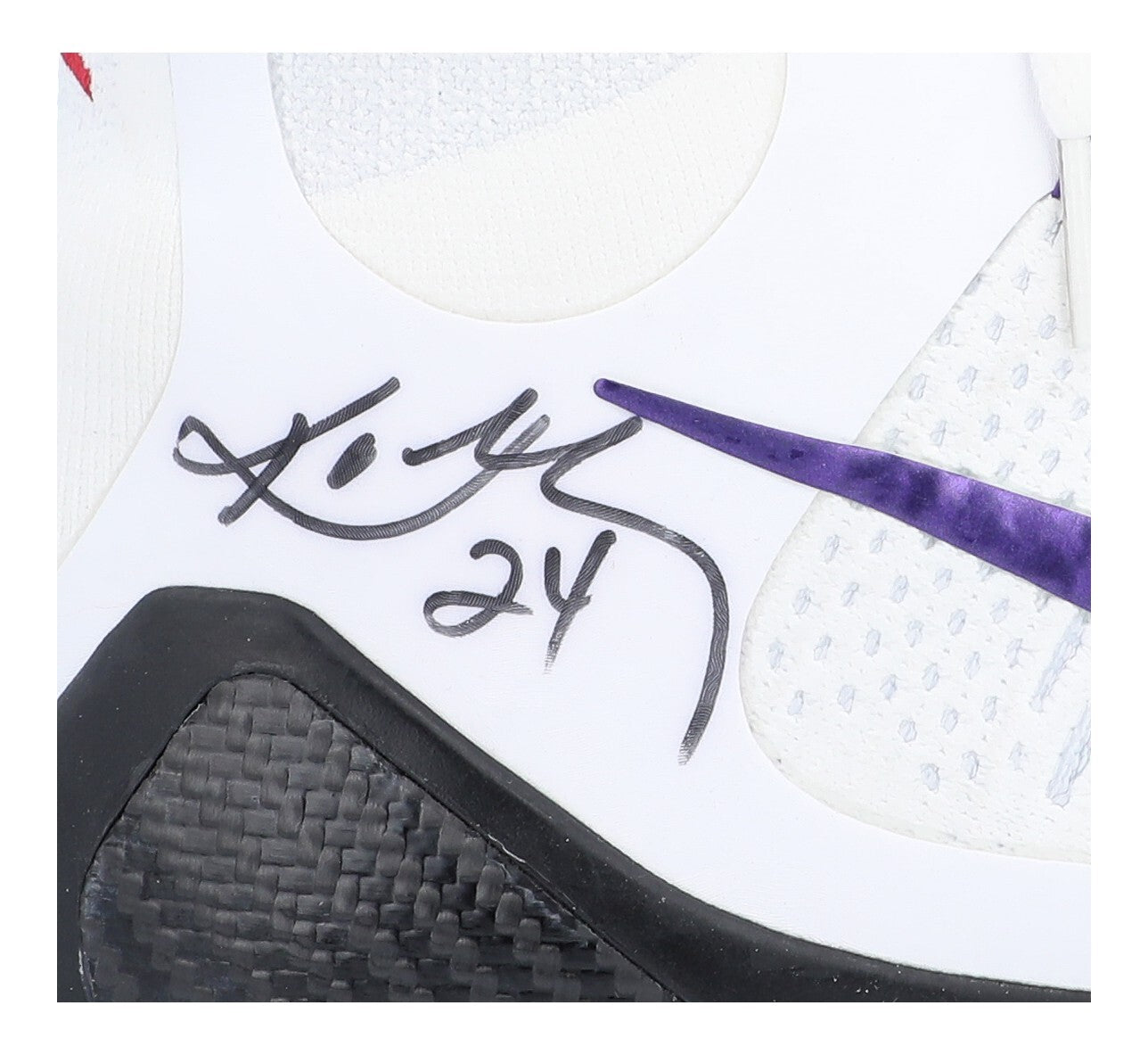 These signed size 14 Nike Kobe IX Elite Promo Sample sneakers have a white Flyknit high-top upper with purple accents and a black midsole with white soles. A Purple Nike "Swoosh" appears on both the inside and outside of the shoe's upper, with Bryant's personal logo in purple applied to both tongues. The sneakers feature an exposed carbon fiber heel counter sandwiched between the black midsole and the white outsole. Bryant has signed his name and inscribed "24" in bold black marker to the white Hyperfuse portion of the upper on both shoes. The sneakers display excellent use with various stains and scuff marks. A black carrying case accompanies the sneakers. These sneakers come with an LOA from Resolution Photomatching (36033), which has provided a "ResMatch" for the right sneaker for the Oct. 28, 2014, game and a likely match for the left sneaker. Additionally, there are individual LOAs from Beckett Authentication (AB73650, AB73651) for the signatures.
