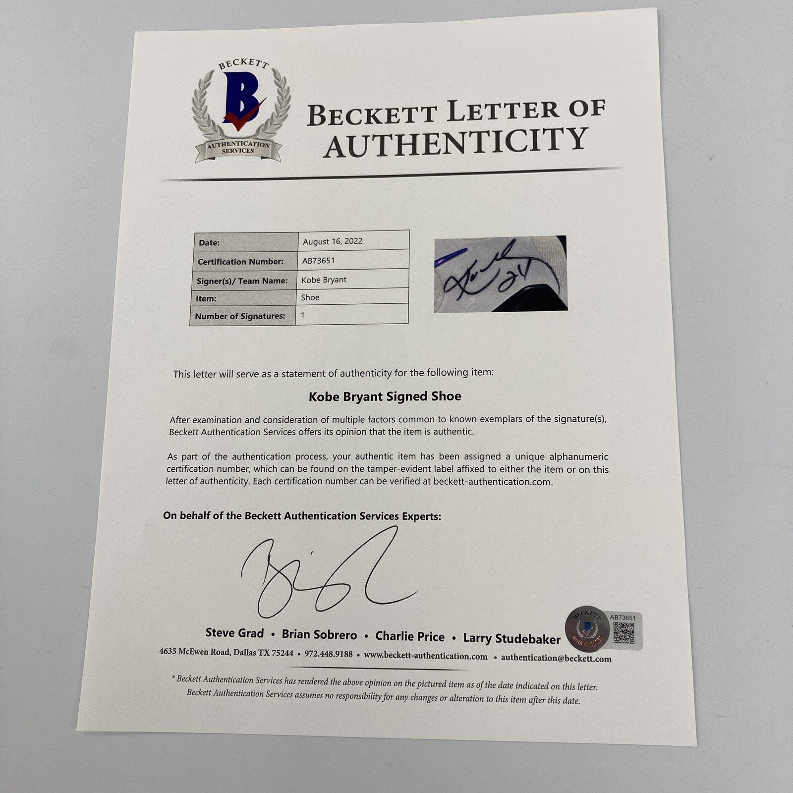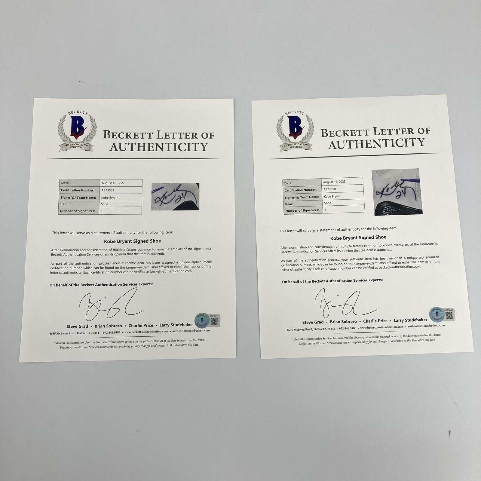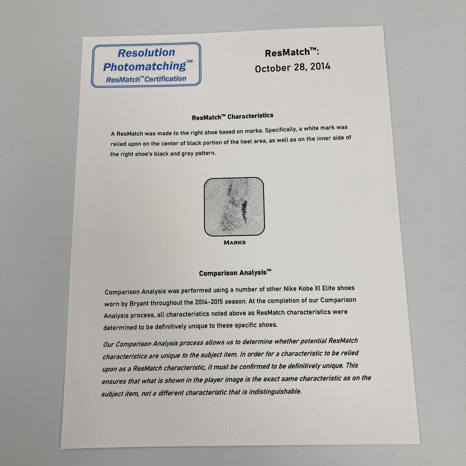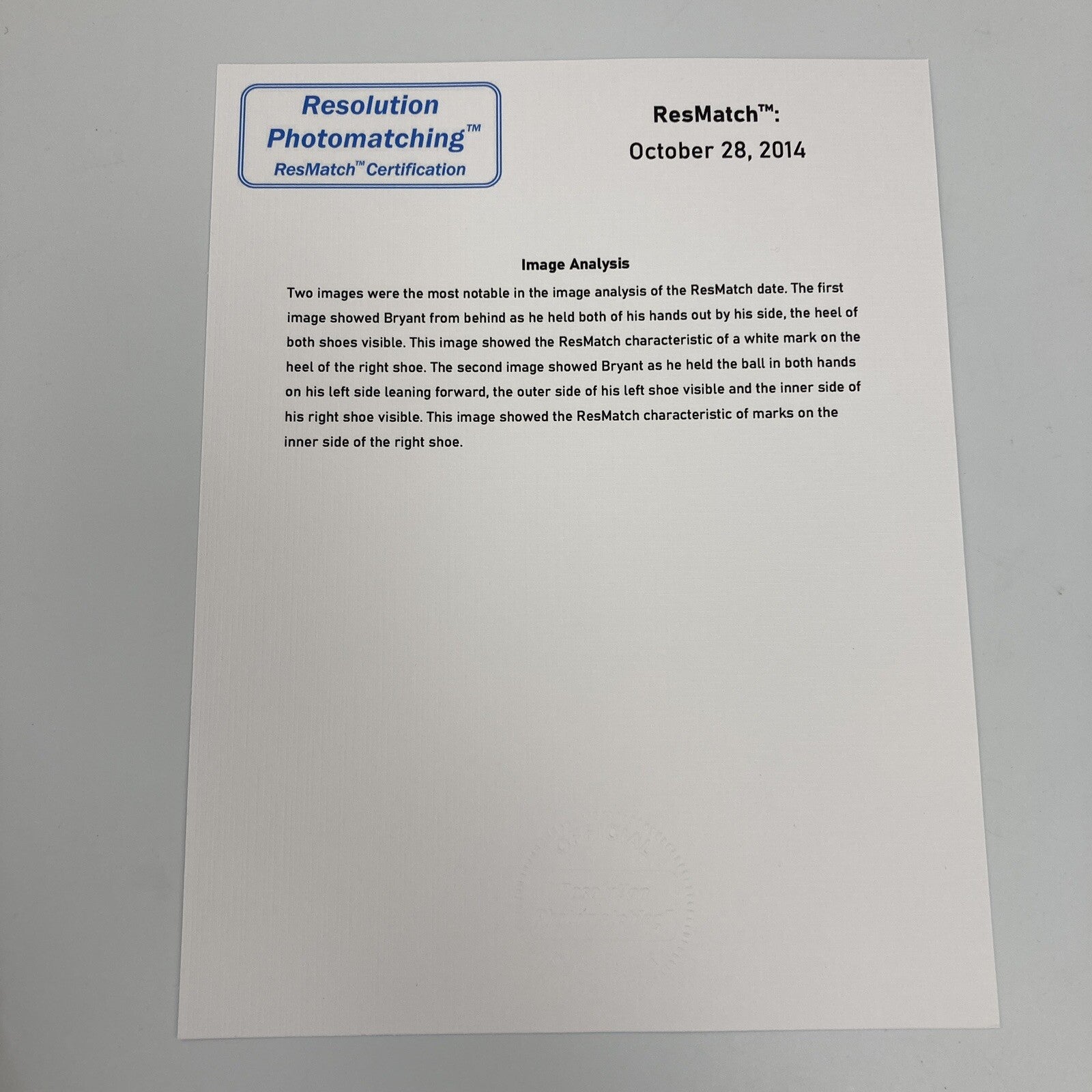 These signed size 14 Nike Kobe IX Elite Promo Sample sneakers have a white Flyknit high-top upper with purple accents and a black midsole with white soles. A Purple Nike "Swoosh" appears on both the inside and outside of the shoe's upper, with Bryant's personal logo in purple applied to both tongues. The sneakers feature an exposed carbon fiber heel counter sandwiched between the black midsole and the white outsole. Bryant has signed his name and inscribed "24" in bold black marker to the white Hyperfuse portion of the upper on both shoes. The sneakers display excellent use with various stains and scuff marks. A black carrying case accompanies the sneakers. These sneakers come with an LOA from Resolution Photomatching (36033), which has provided a "ResMatch" for the right sneaker for the Oct. 28, 2014, game and a likely match for the left sneaker. Additionally, there are individual LOAs from Beckett Authentication (AB73650, AB73651) for the signatures.