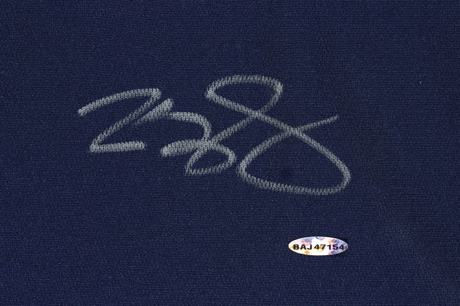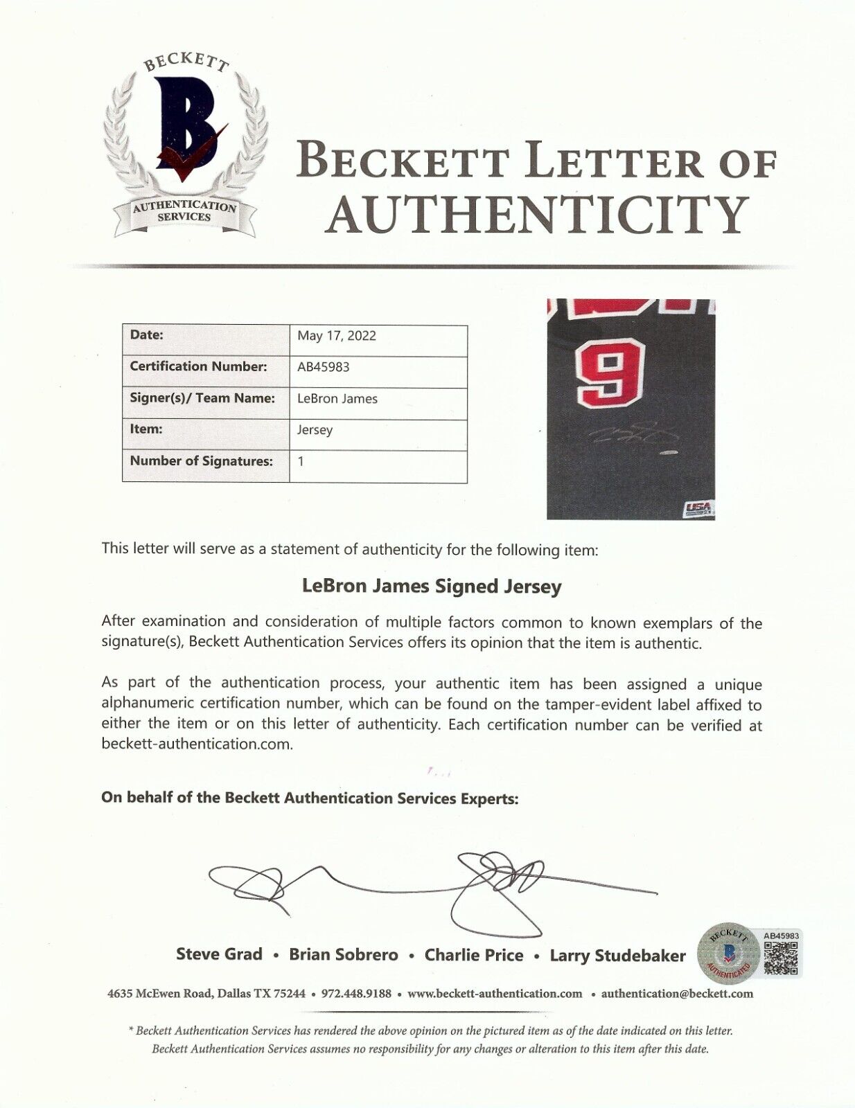 One of the more unique LBJ collectibles out there, this UDA jersey pays tribute to the 2004 U.S. Olympic basketball team. While Team USA had to settle for the bronze, it was the first one which featured the talents of LeBron James. This Reebok jersey features an inordinately large silver paint pen signature of King James on front. All of the identifiers are sewn-on. A "Reebok size 52" tag is sewn in the tail. An UDA hologram and certificate attends. COA from UDA . Full LOA from Beckett Authentication Services.