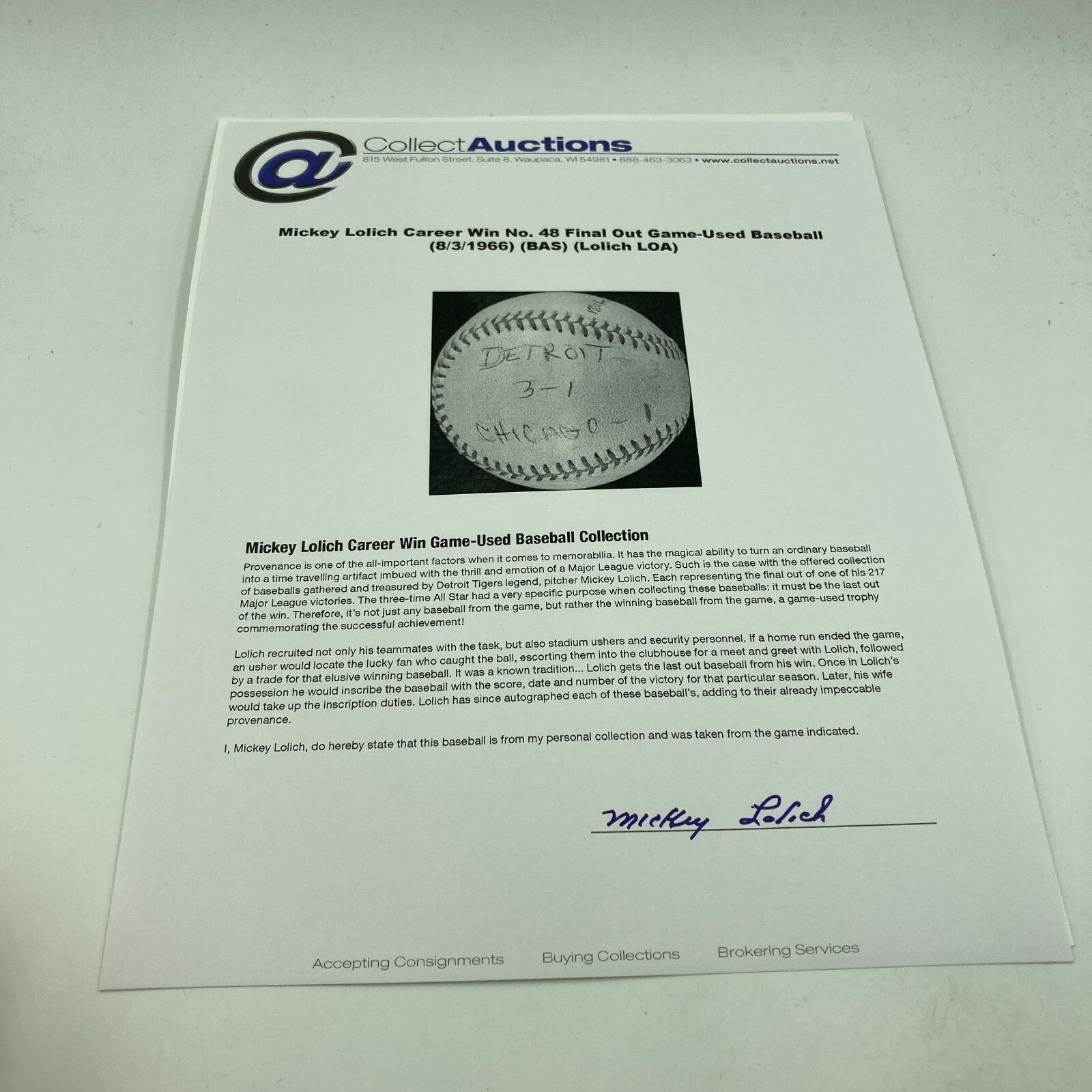 Mickey Lolich Signed Career Win No. 48 Final Out Game Used Baseball Beckett COA