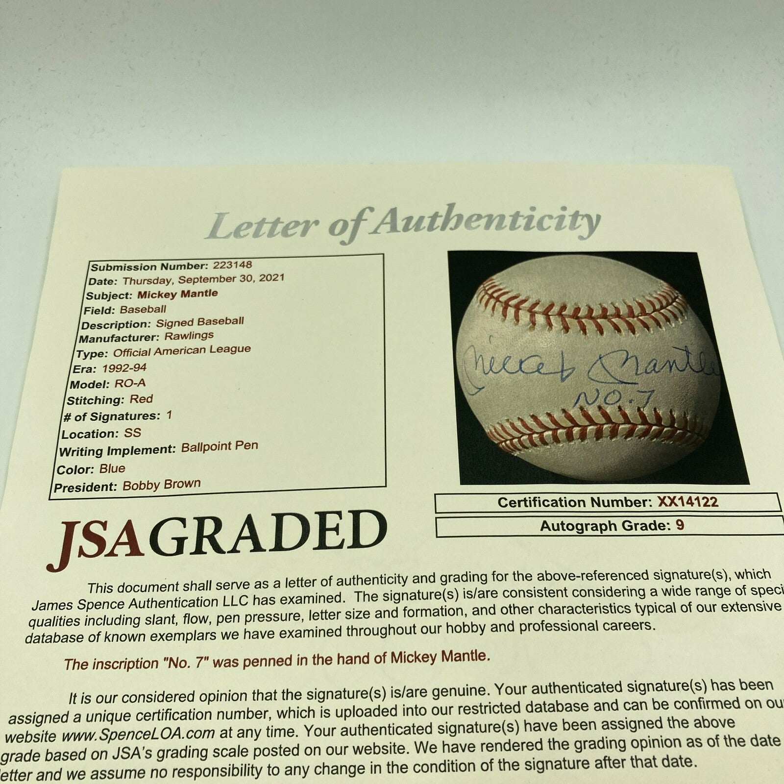 Mickey Mantle No. 7 Signed American League Baseball JSA Graded MINT 9
