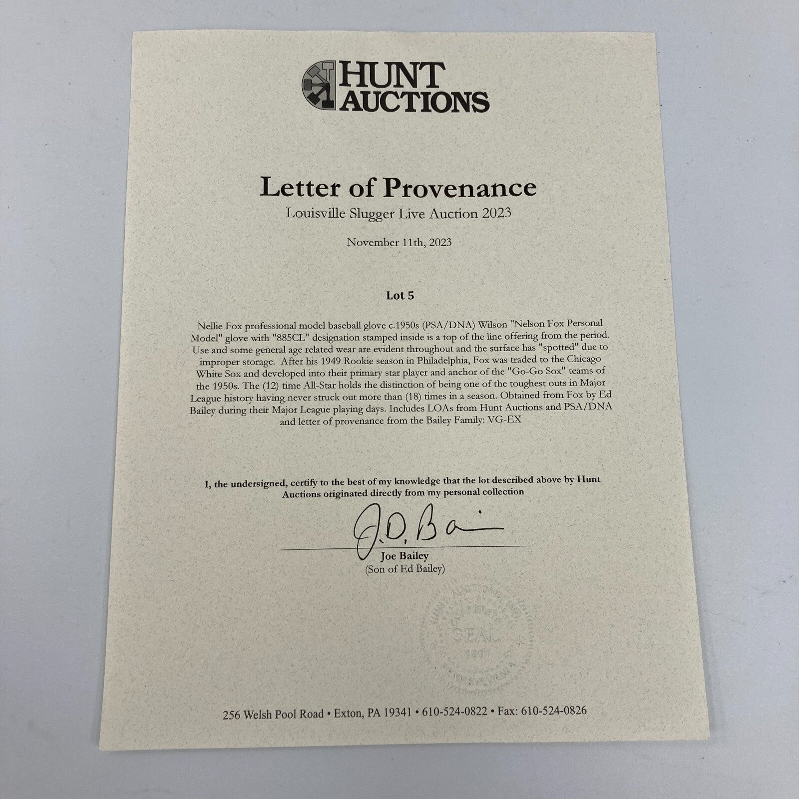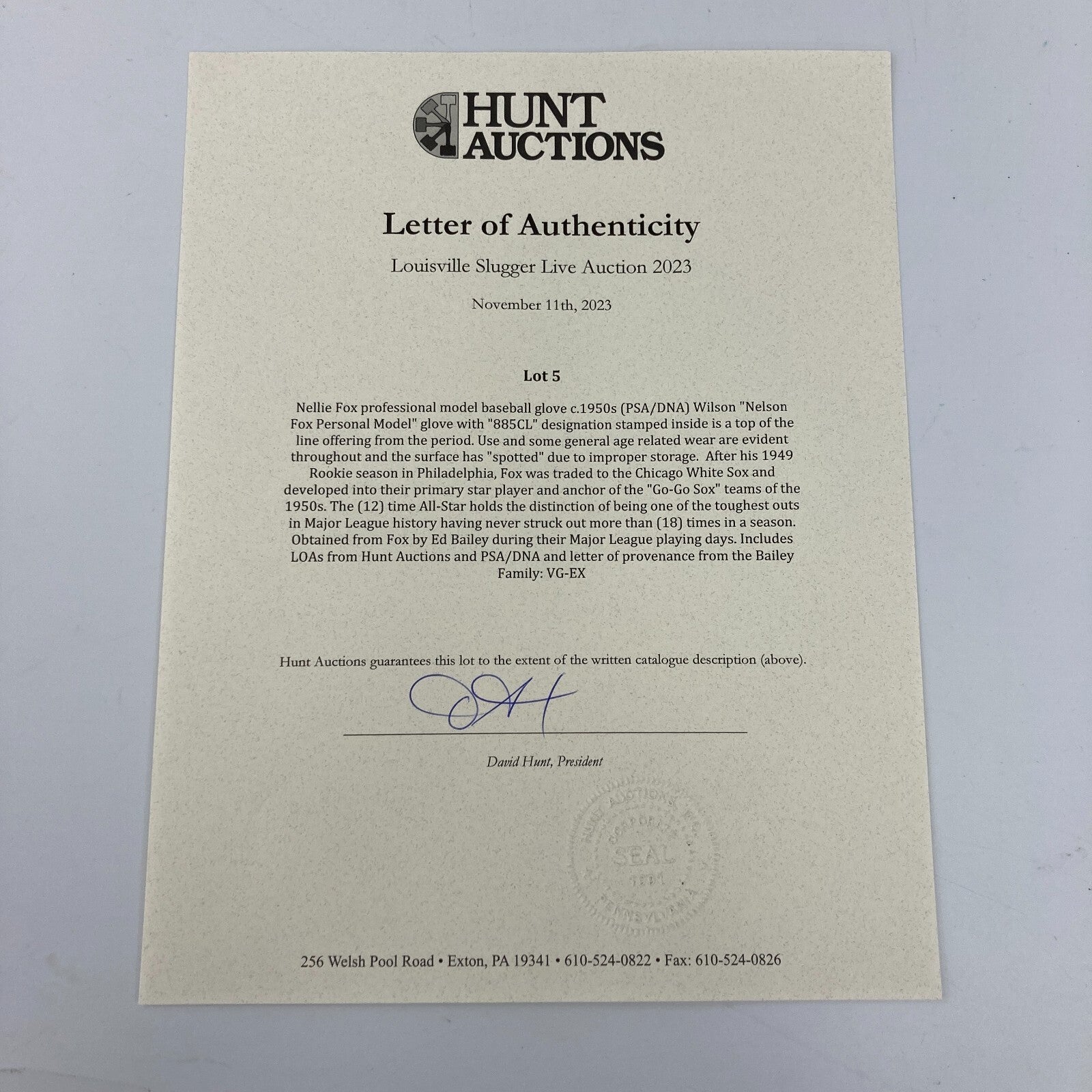 Nellie Fox professional model baseball glove c.1950s (PSA/DNA) Wilson "Nelson Fox Personal Model" glove with "885CL" designation stamped inside is a top of the line offering from the period. After his 1949 Rookie season in Philadelphia, Fox was traded to the Chicago White Sox and developed into their primary star player and anchor of the "Go-Go Sox" teams of the 1950s. The (12) time All-Star holds the distinction of being one of the toughest outs in Major League history having never struck out more than (18) times in a season. Obtained from Fox by Ed Bailey during their Major League playing days. Includes LOAs from Hunt Auctions and PSA/DNA and letter of provenance from the Bailey Family