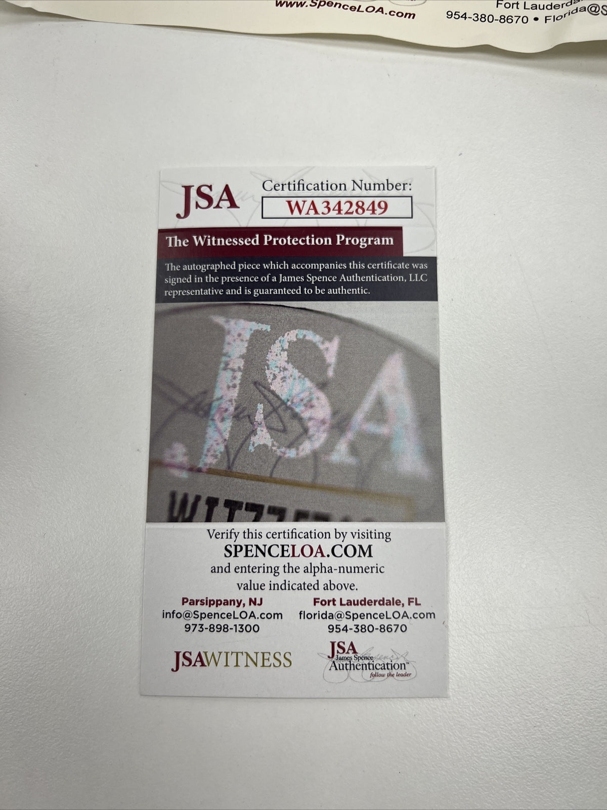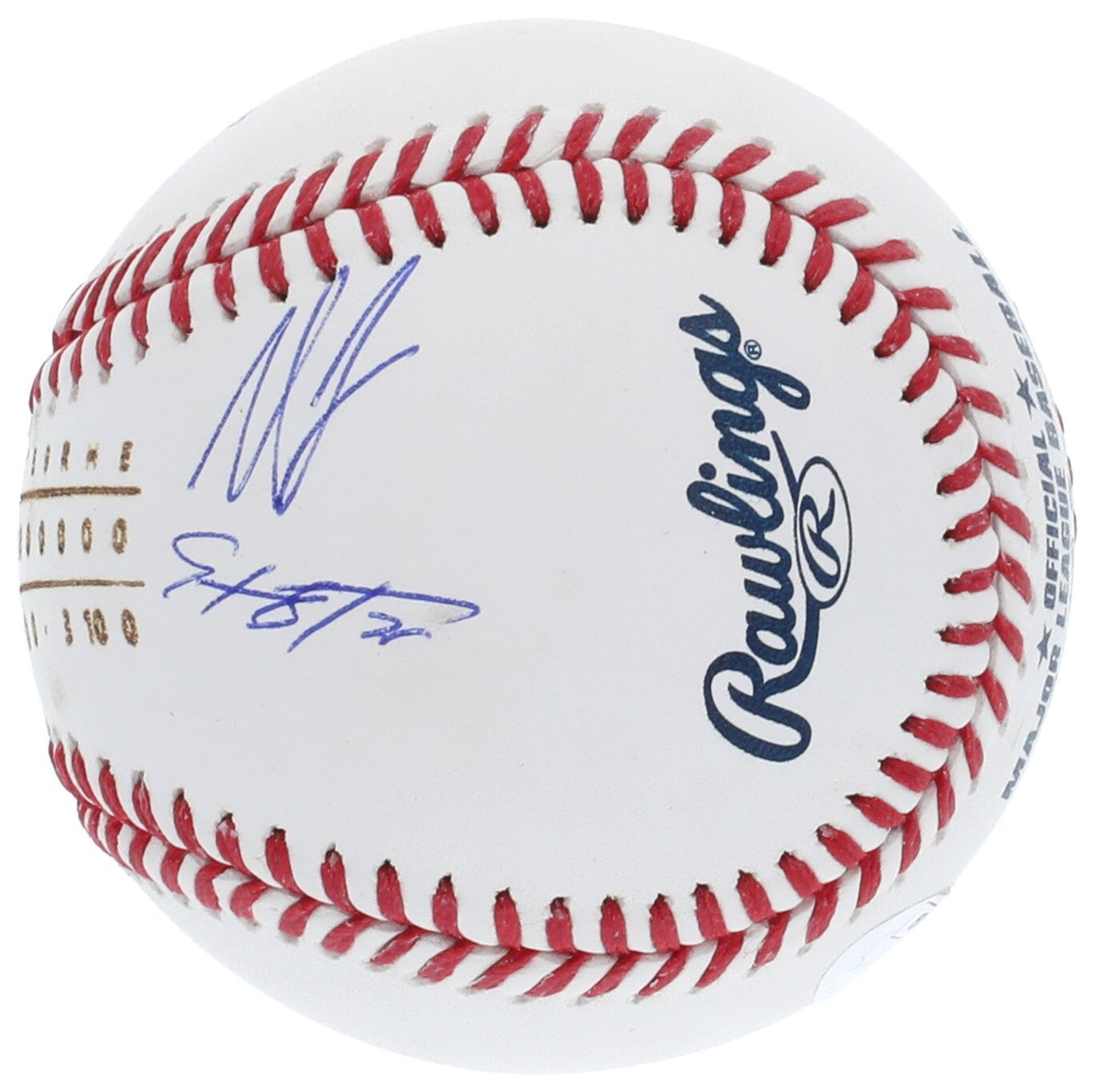 Magic occurred at Citi Field on April 29th 2022, when an astounding five New York Mets pitchers combined to throw a no-hitter against the Philadelphia Phillies, with the Mets walking away with a 3-0 win. As per baseball-reference.com, the 159 pitches thrown by Tylor Megill and four relivers are the most throw in a no-hitter. This offered Official Major League Robert D. Manfred Jr. baseball features the box score from the no-hitter and is signed by Tylor Megill, who inscribed "Mark 10: 27," Drew Smith, Seth Lugo, Joely Rodriguez, Edwin Diaz, and James McCann with a blue ballpoint pen. The ball comes with a COA from JSA (WA342849) for the signatures.