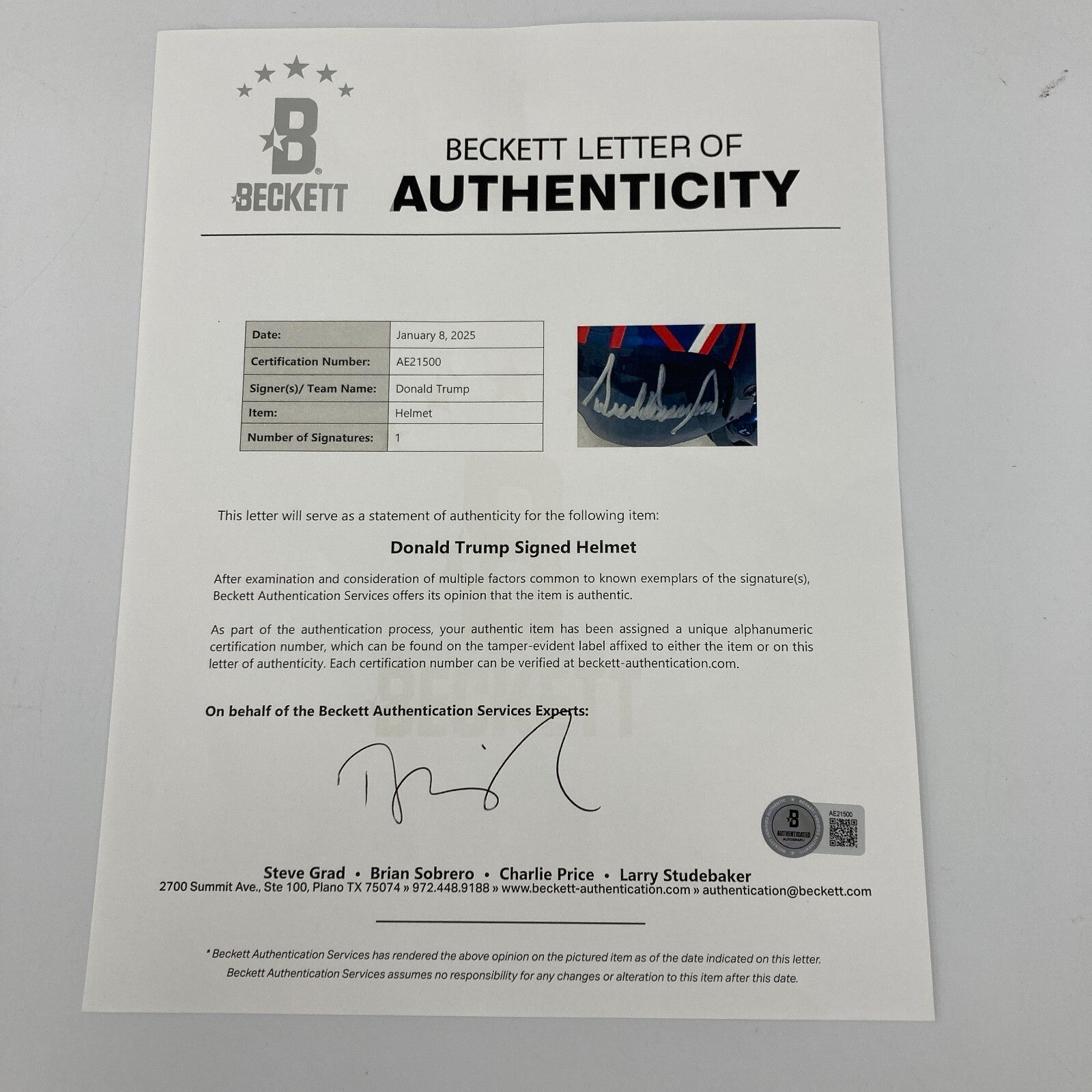 Magnificent President Donald Trump Full Name Signed Top Gun Maverick Helmet full size authentic helmet. From a rare sitdown private signing with the President in Mar-a-Lago. Trump signed only a few pieces. Very rare full name signature, all the signatures you see online are quick and short. Bold mint signature. Comes with full letter Beckett COA.