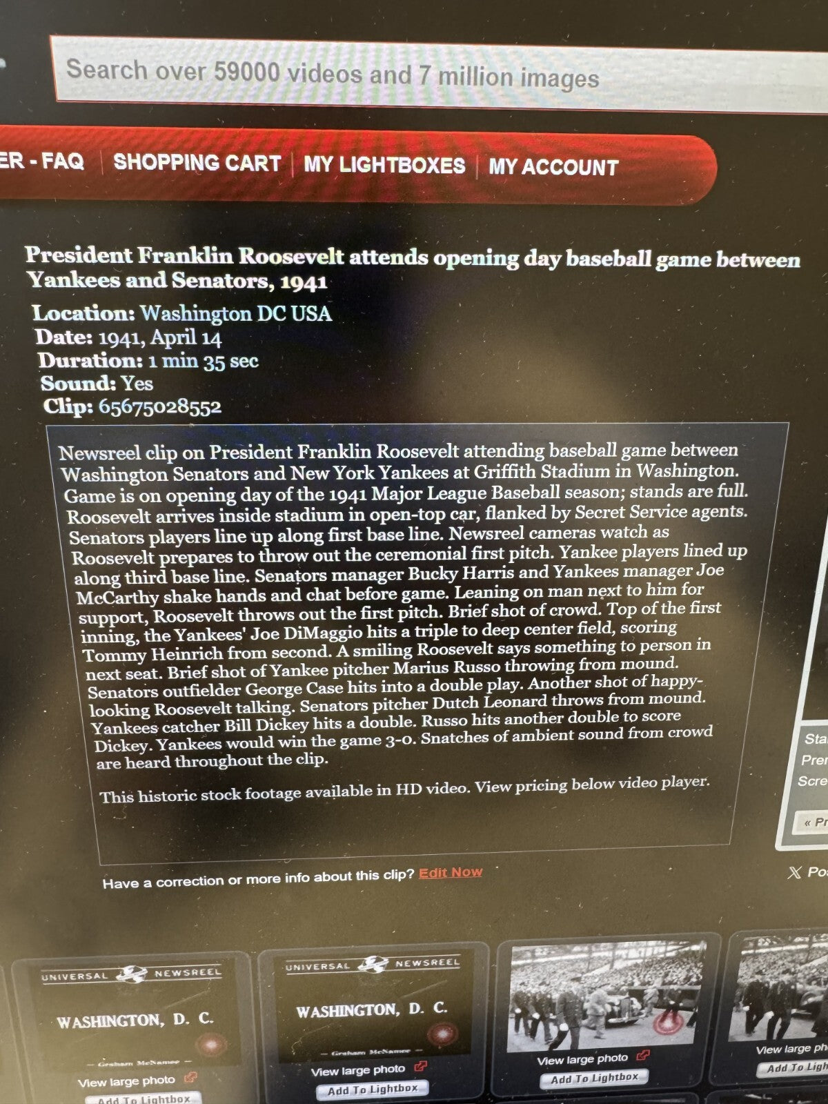 This date marks the Opening Day of the 1941 Major League Baseball season, when President Roosevelt threw out the ceremonial first pitch at Griffith Stadium in Washington, D.C., as the Washington Senators hosted the New York Yankees.