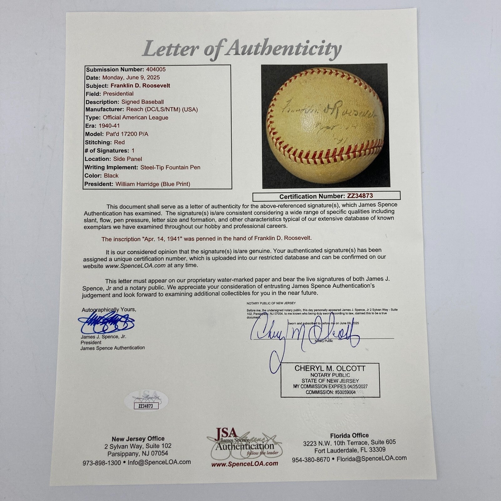 Incredible President Franklin D. Roosevelt Single-Signed Official 1941 American League (William Harridge) Baseball – Dated April 14, 1941 – First Pitch Ball