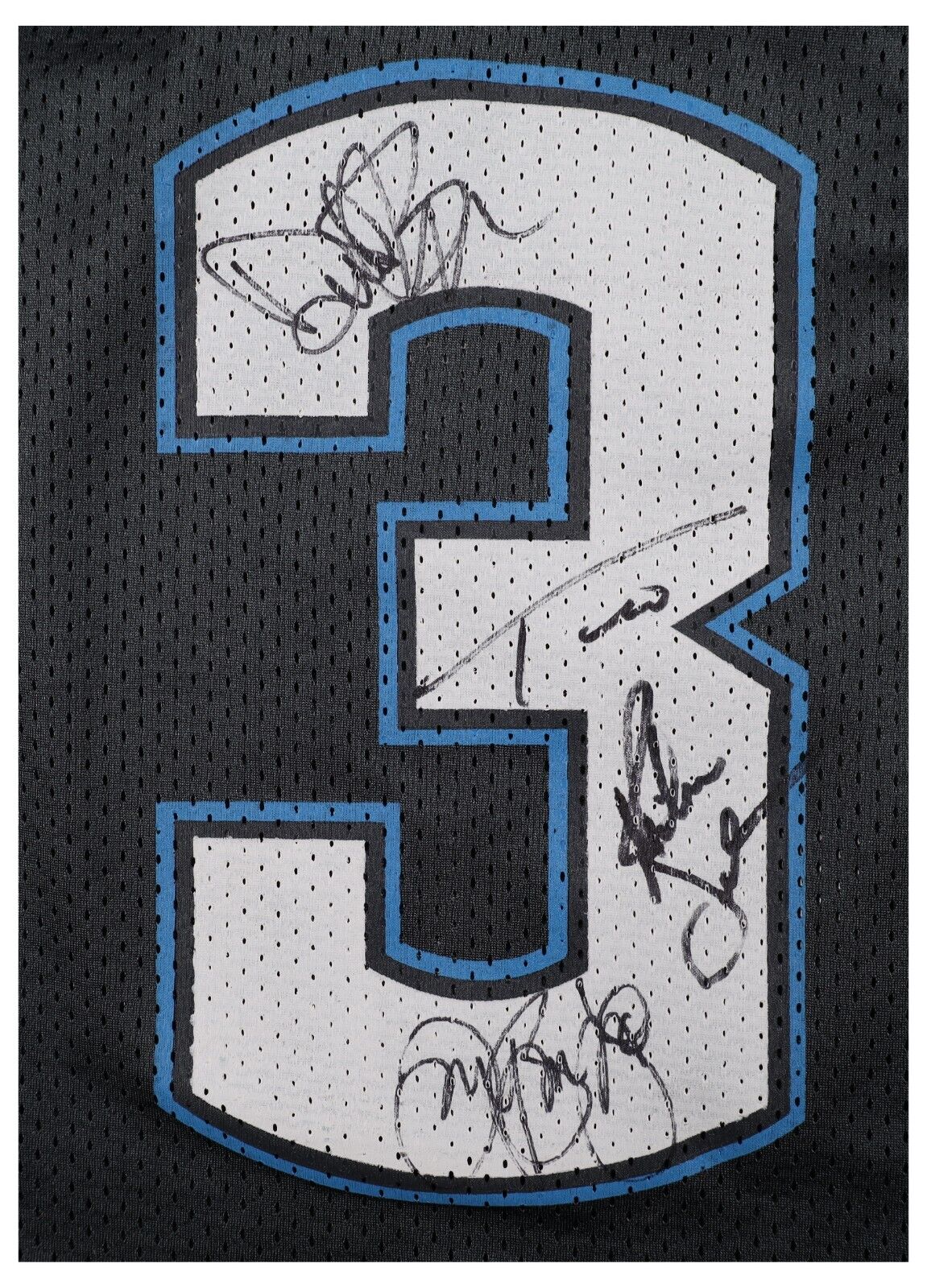 Presented is a Philadelphia Soul arena football jersey containing the signatures of four members of the American rock band Bon Jovi. Each signature has been penned in black marker across the jersey's number "3" on the front. Signatures include Jon Bon Jovi, Richie Sambora, David Bryan, and Tico Torres. The jersey comes with an LOA from Beckett for signature.