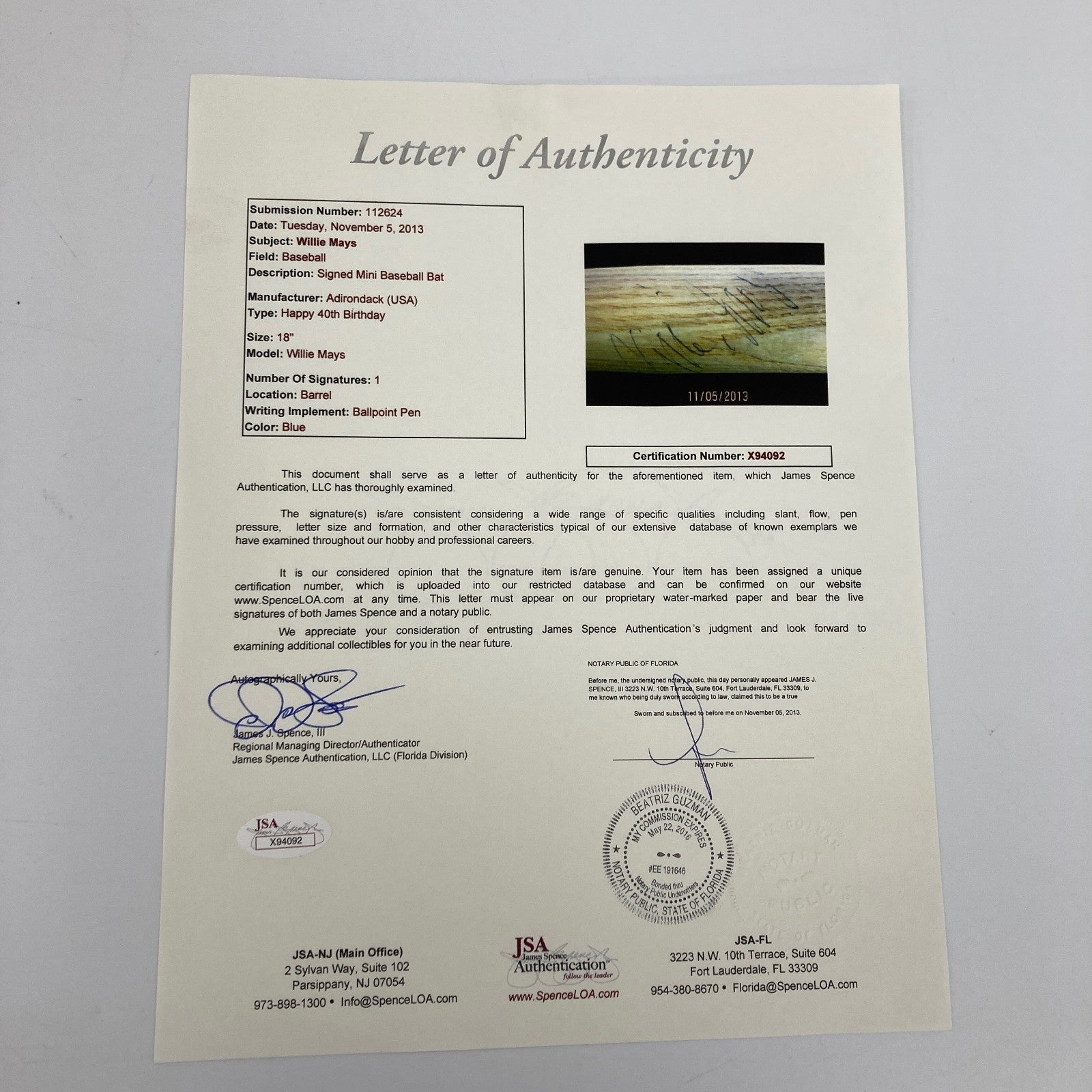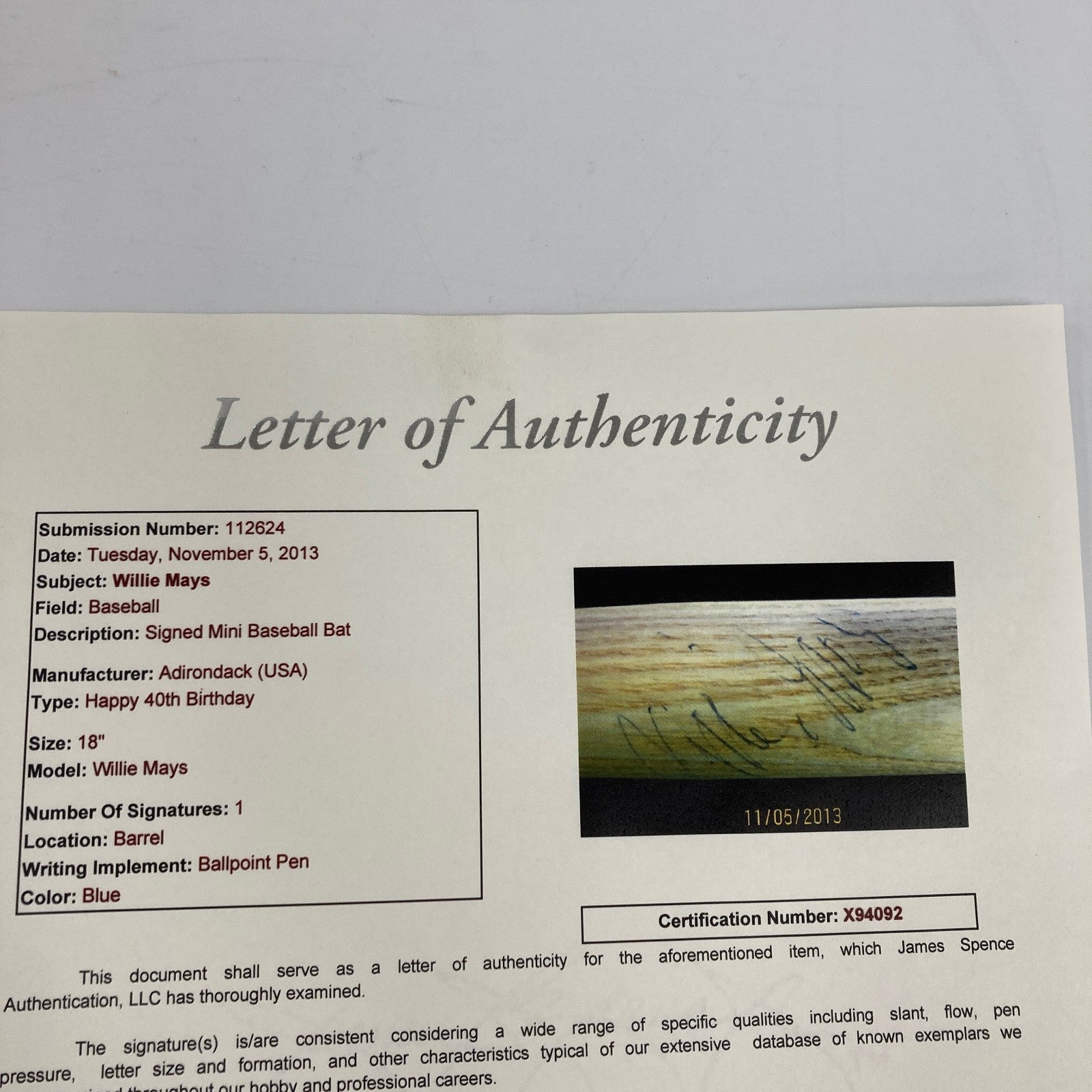 RARE Willie Mays Signed 1971 40th Birthday Mini Baseball Bat with full letter JSA COA