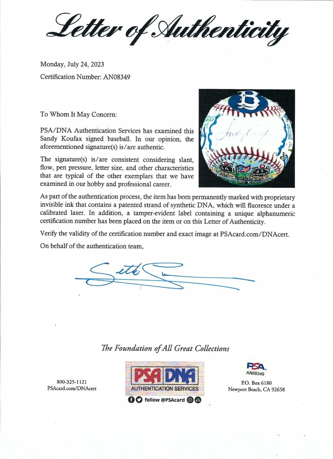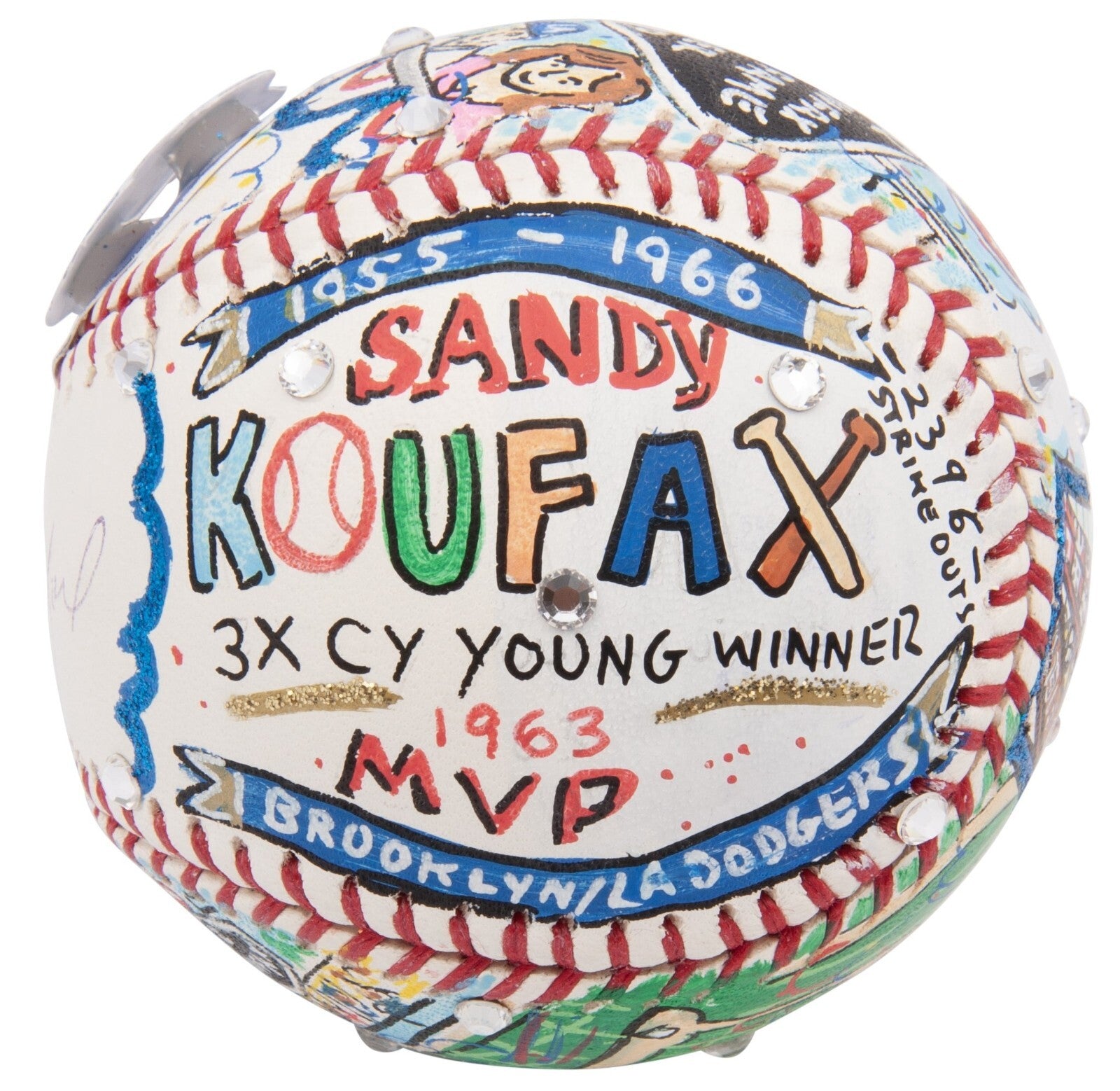 Impressive Sandy Koufax autographed Charles Fazzino pop art baseball. Sandy autographed the baseball on the sweet spot in blue ballpoint ink. The remaining panels of the baseball have been decorated by artist Charles Fazzino, known for his unique, artistic baseballs. This example features Koufax's accolades while in the MLB throughout the Brooklyn and Los Angeles Dodgers themed ball. A truly beautiful one-of-a-kind example. Accompanied by a full LOA from PSA/DNA for the autograph.