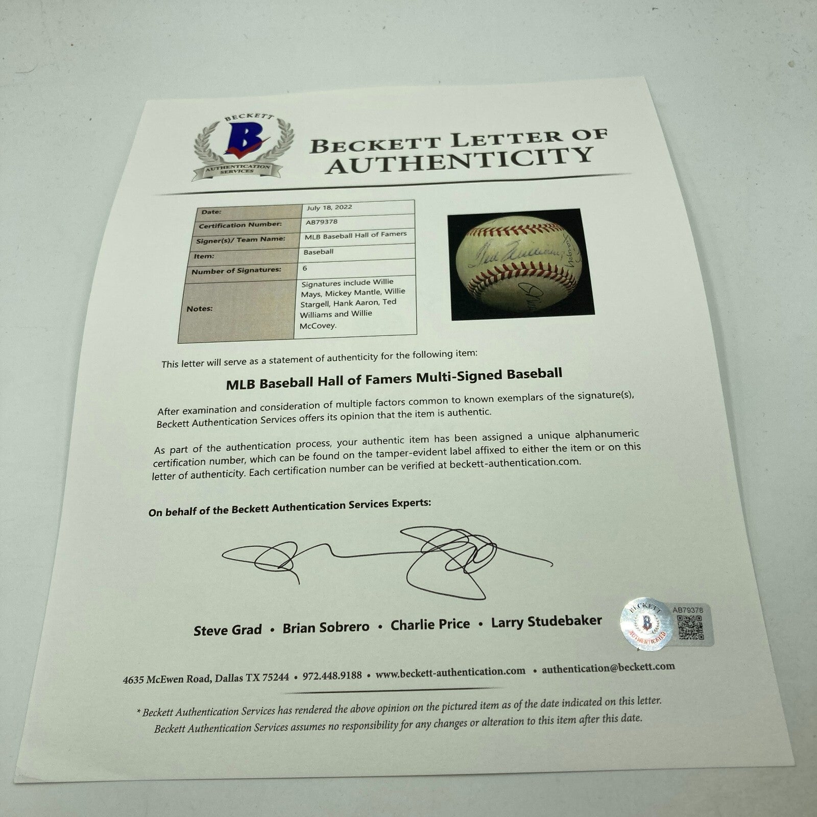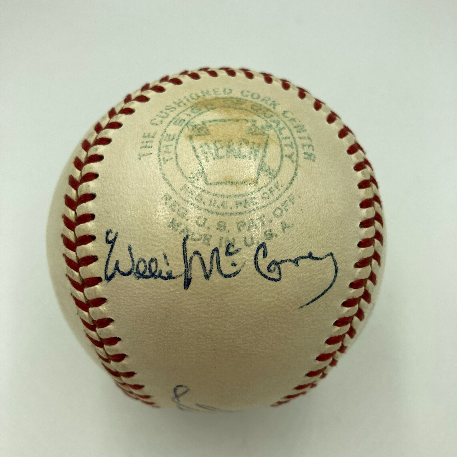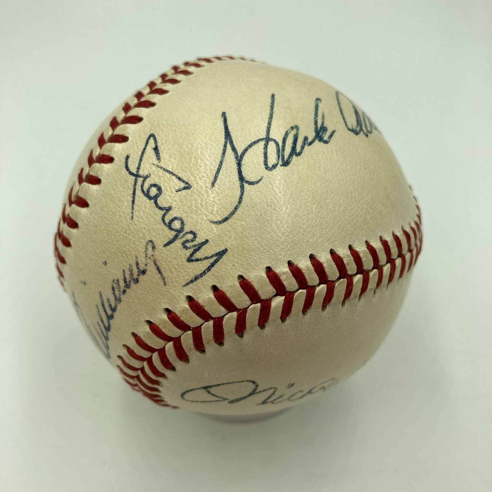 1950's 500 Home Run Club Multi-Signed Baseball. A breathtaking assemblage of Major League Baseball's most prolific sluggers of the 1950's, all together in a rare vintage format on a 1952-59 Official American League (Harridge) sphere. The large and bold autographs include Ted Williams (across the sweet spot) plus Mickey Mantle, Hank Aaron, Willie Mays, Willie McCovey and Willie Stargell orbiting Teddy Ballgame on the side panels. The ball is in incredible condition. Meanwhile, the blue ink autographs are mint. Full LOA from Beckett Authentication Services.